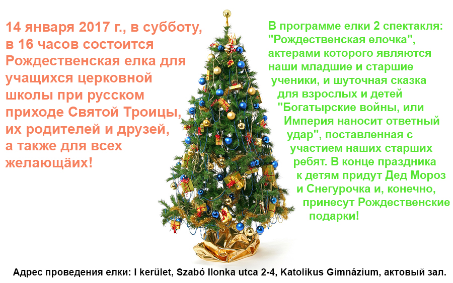 Дорогие братья и сестры, уважаемые родители и просто заинтересованные добрые люди. Мы все верим в чудеса, и они действительно существуют. Вот и в этот, раз само собой ничего не случается, и чтобы достойно провести это мероприятие давайте все вместе явим чудо и пожертвуем на это богоугодное дело! Деньги нужны на костюмы и подарки на аренду помещения, на саму елку. Пожертвования можно оставлять в церковной лавке Троицкого прихода на Petofi tér 2.
