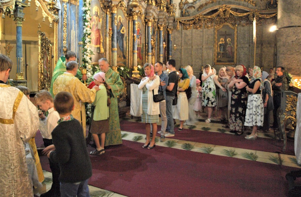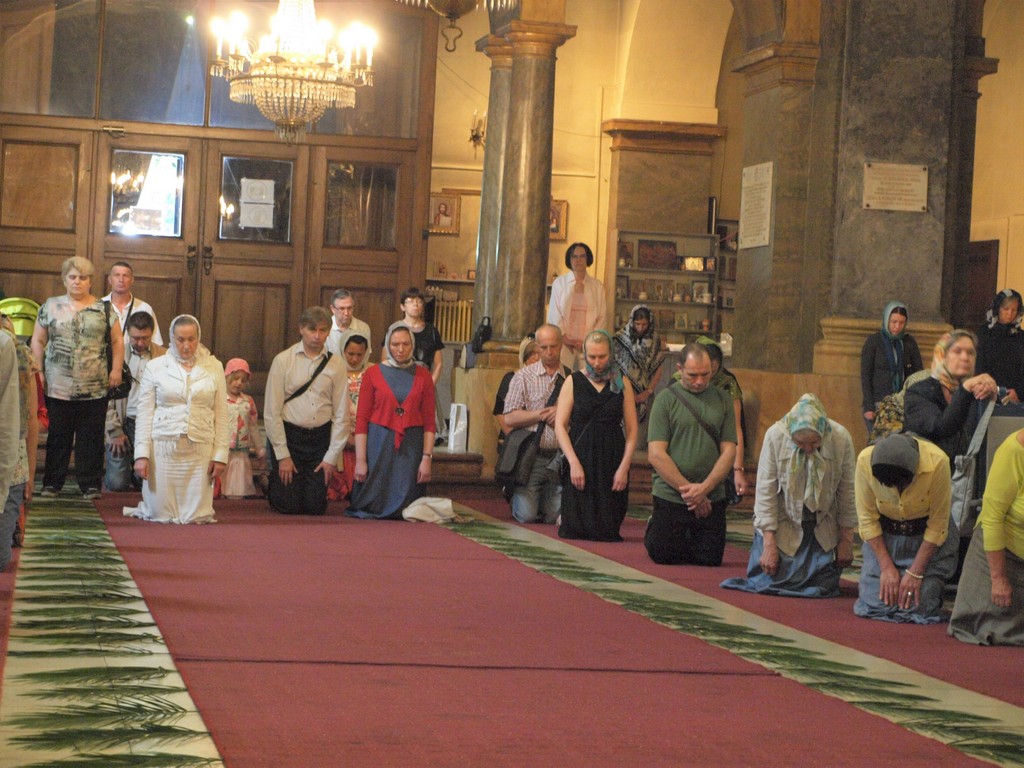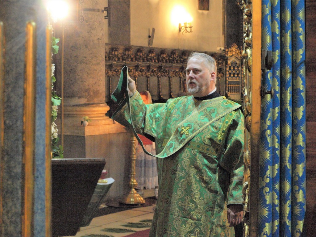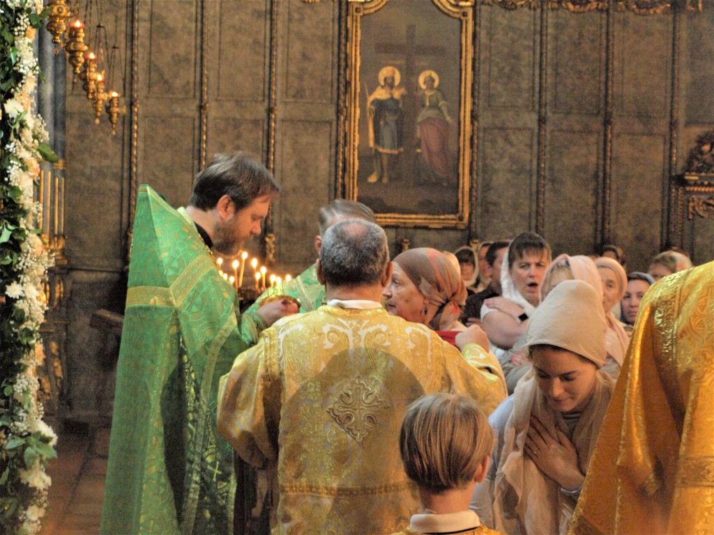 Полы и стены Успенского собора храма были устланы травой и украшены цветами. Зеленый цвет — это символ обновления, символ начала. Этот обычай идет еще от Ветхозаветной Церкви. Отдельное спасибо всем благоукрасителям и жертвователям, без которых невозможно было бы совешить эти службы в такой красоте.