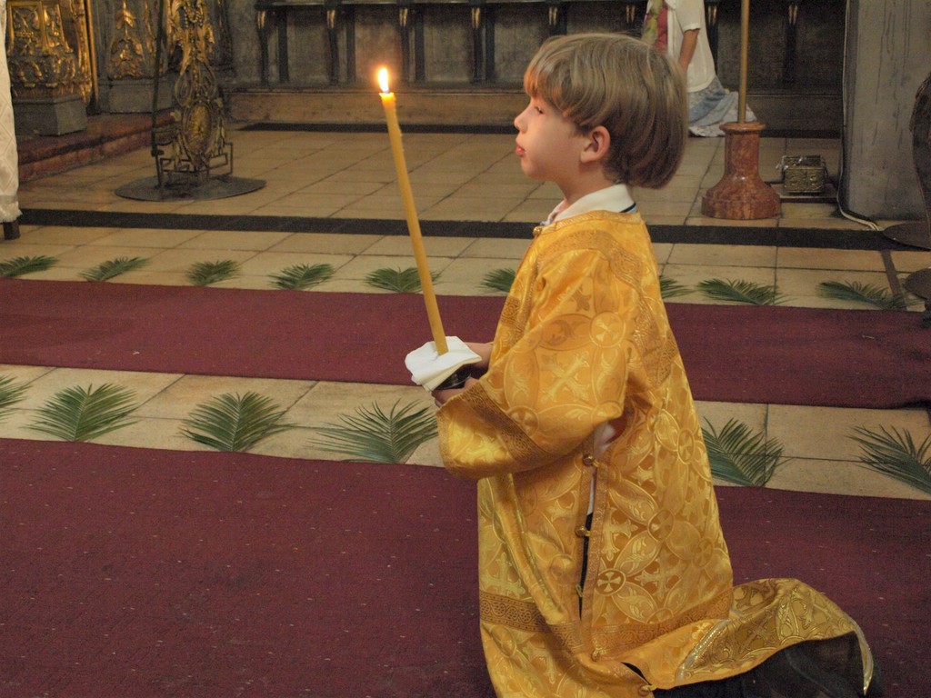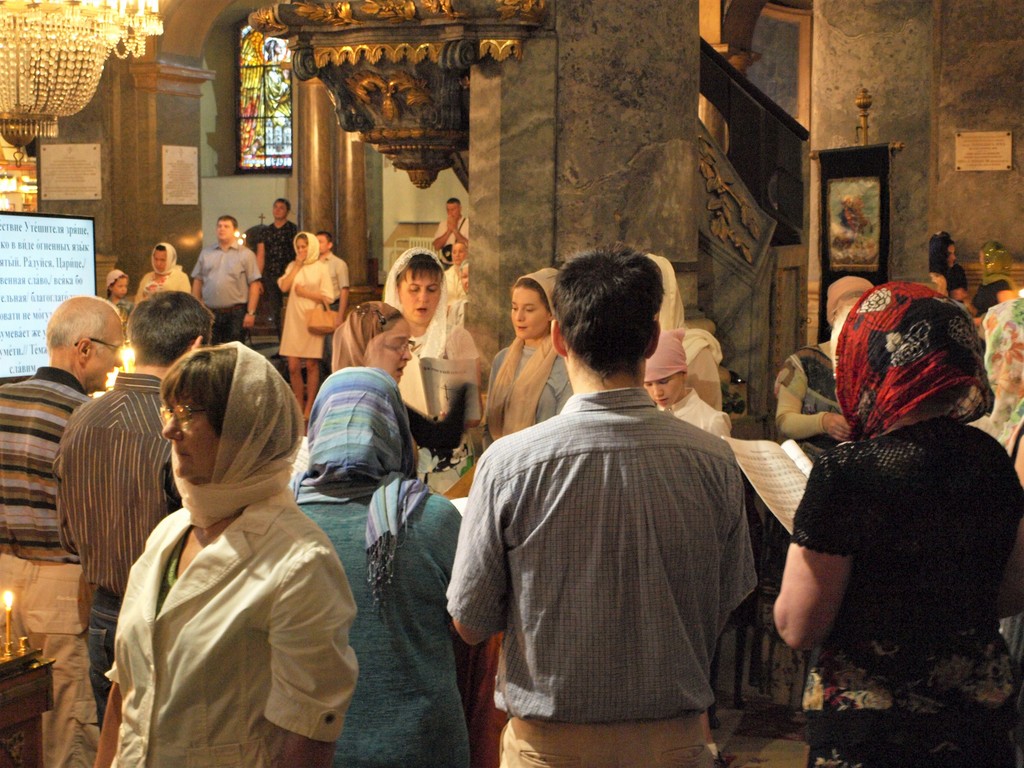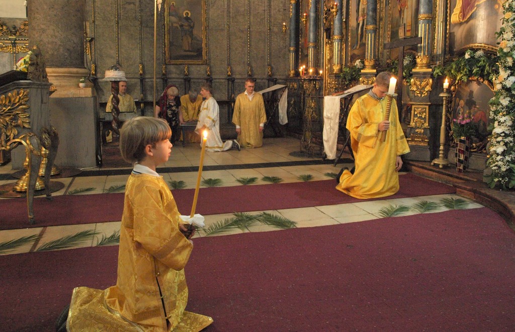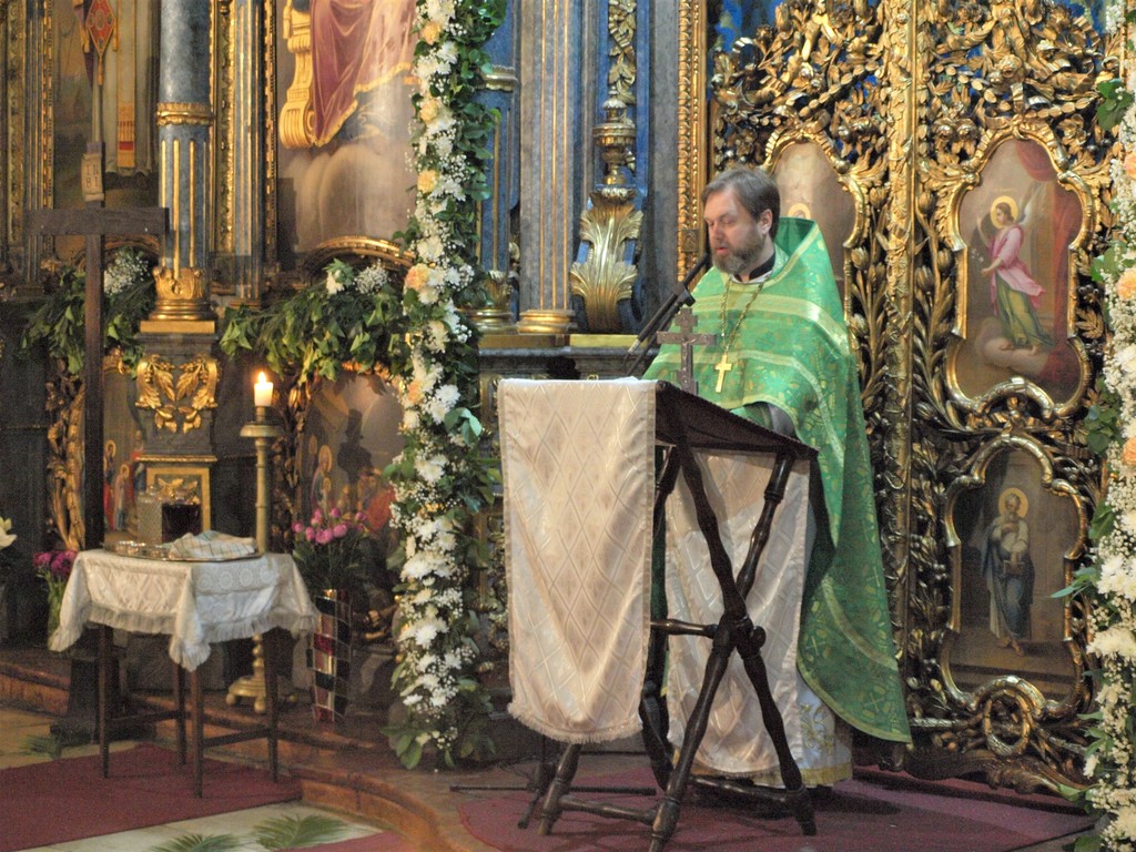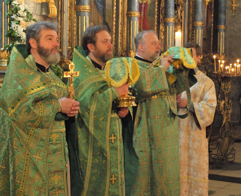 Полы и стены Успенского собора храма были устланы травой и украшены цветами. Зеленый цвет — это символ обновления, символ начала. Этот обычай идет еще от Ветхозаветной Церкви. Отдельное спасибо всем благоукрасителям и жертвователям, без которых невозможно было бы совешить эти службы в такой красоте.