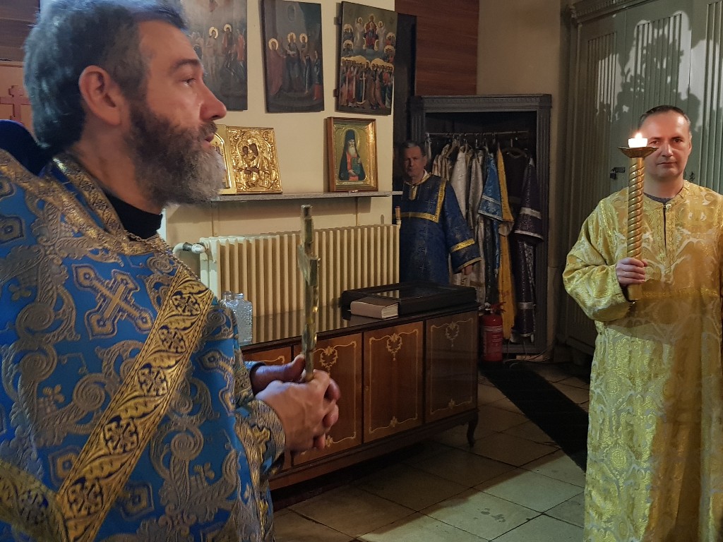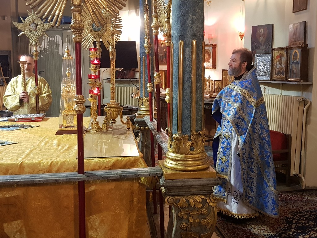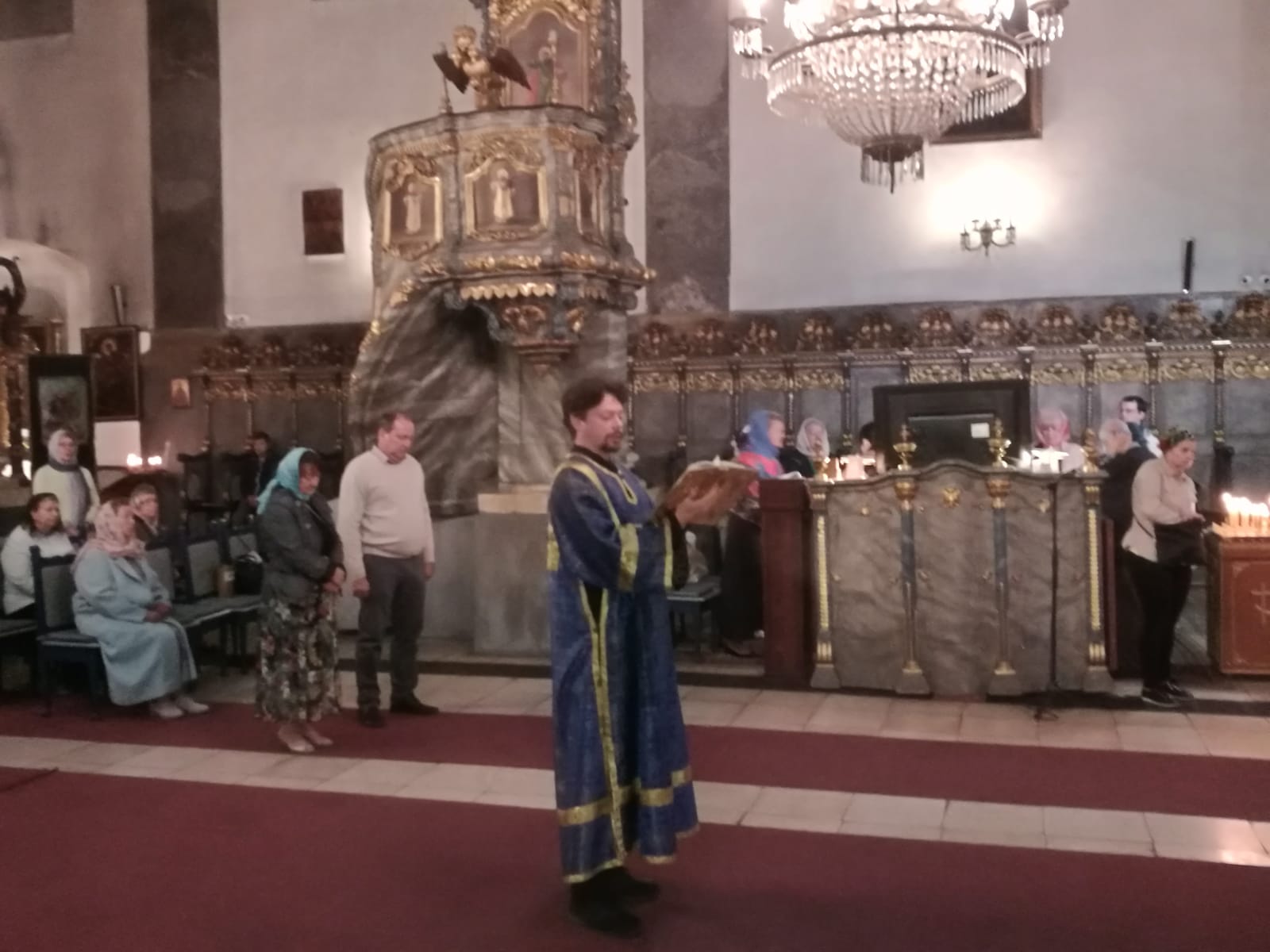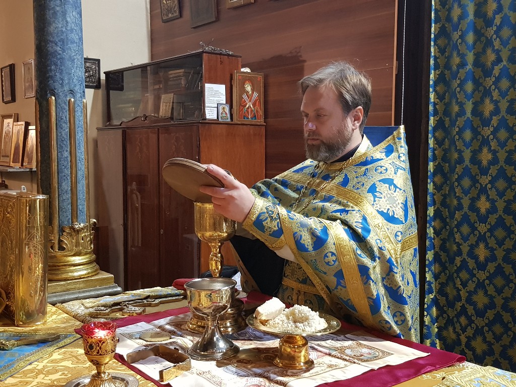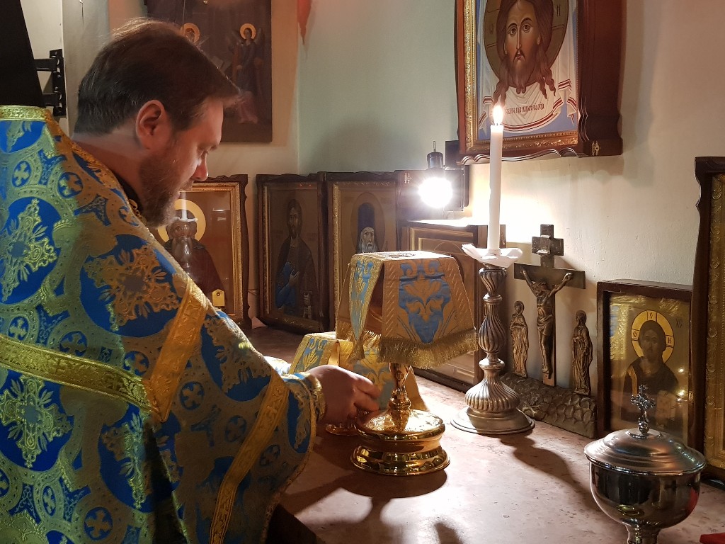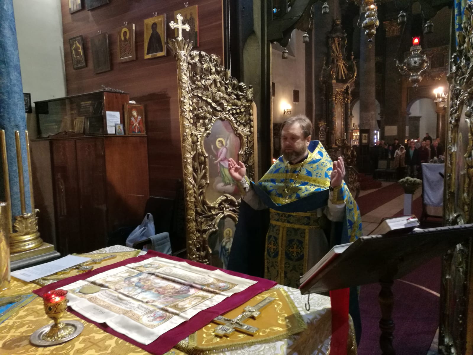 Ему сослужил помощник правящего архиерея иерей Святослав Булах. В конце службы отец Димитрий обратился с проповедью на евангельское чтение и рассказал о празднике Покрова Богородицы.