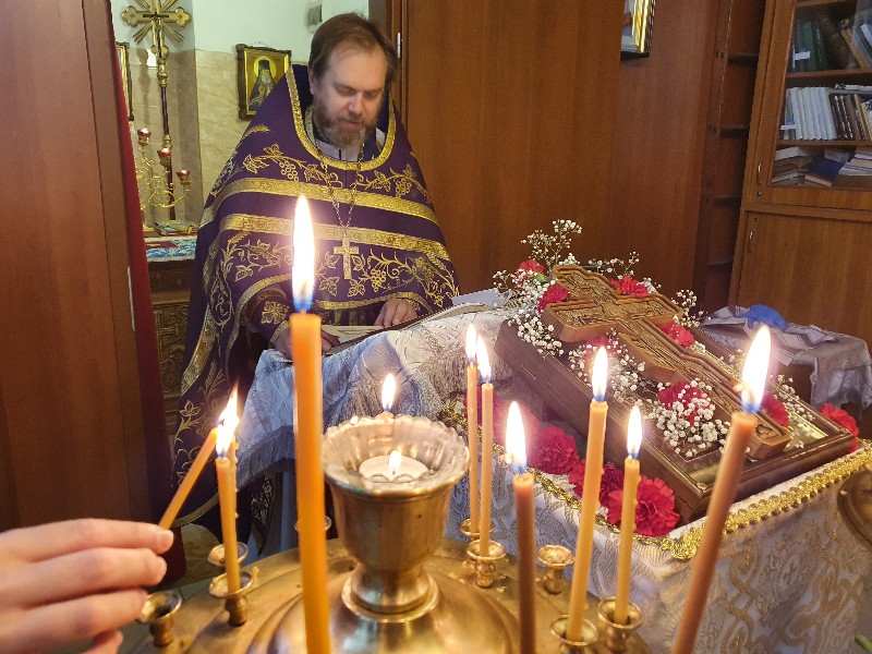 В ходе богослужения алтарником Георгием Юревичем было прочитано первое послание святого апостола Павла Коринфским христианам, возвещающее о том, что Крест и страдания Иисуса Христа представляют из себя Божию силу и Божию премудрость. В читаемом настоятелем прихода иереем Димитрием Евангелии от Иоанна, молящиеся услышали рассказ о крестных страданиях Спасителя. Апостол Иоанн, подробно описывая это страшное зрелище, поведал, как Господь, шествуя на место казни, нес Свой крест на плечах, как неустрашимый воин копье, которым имел поразить врага.