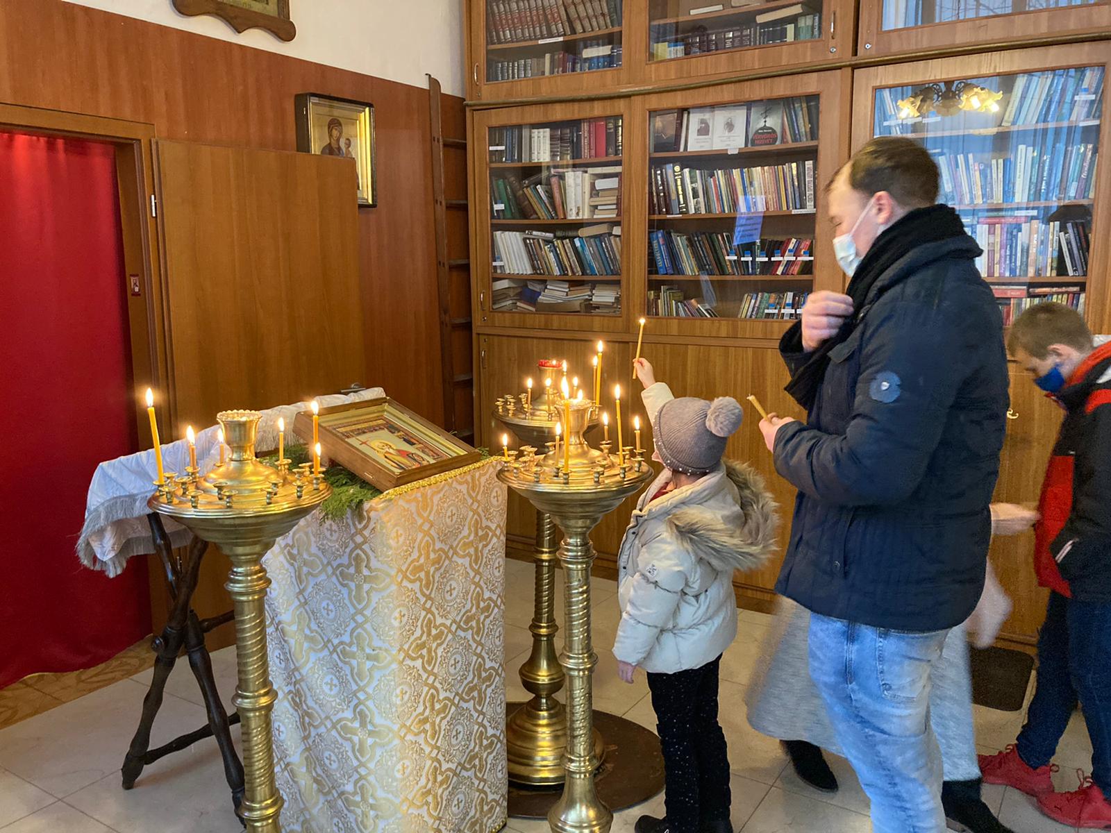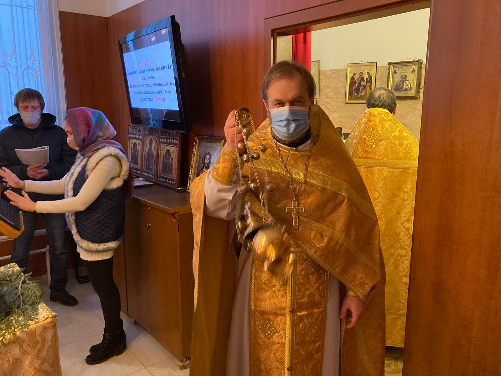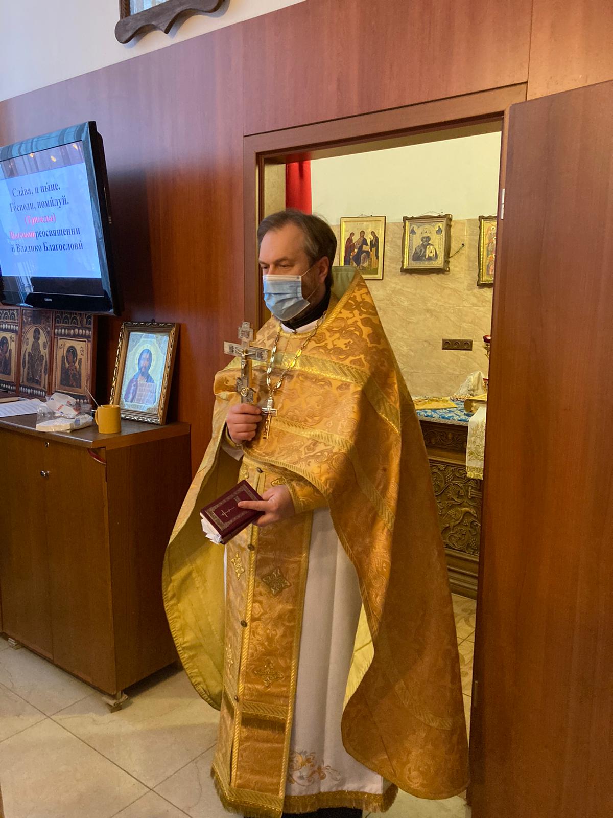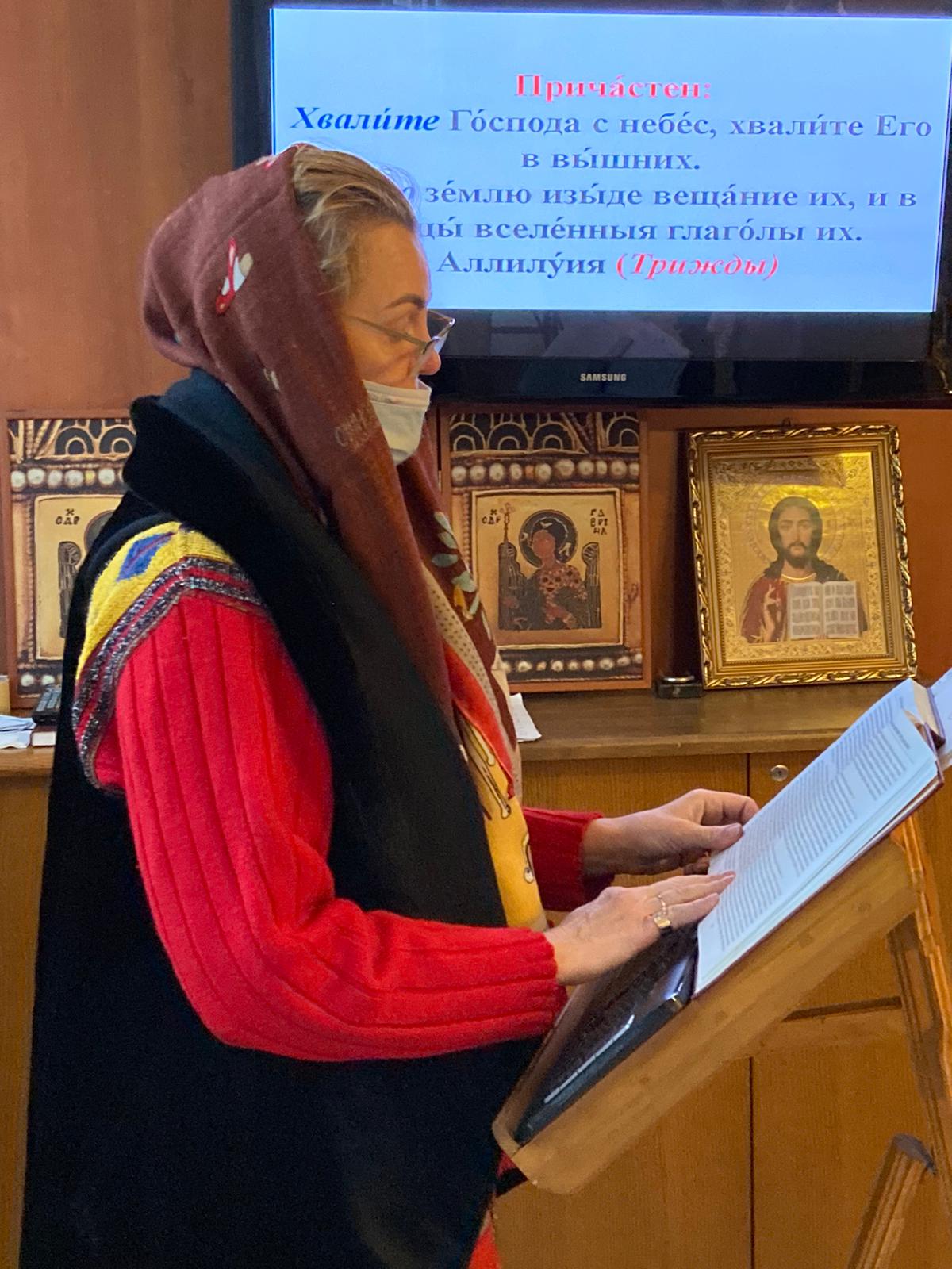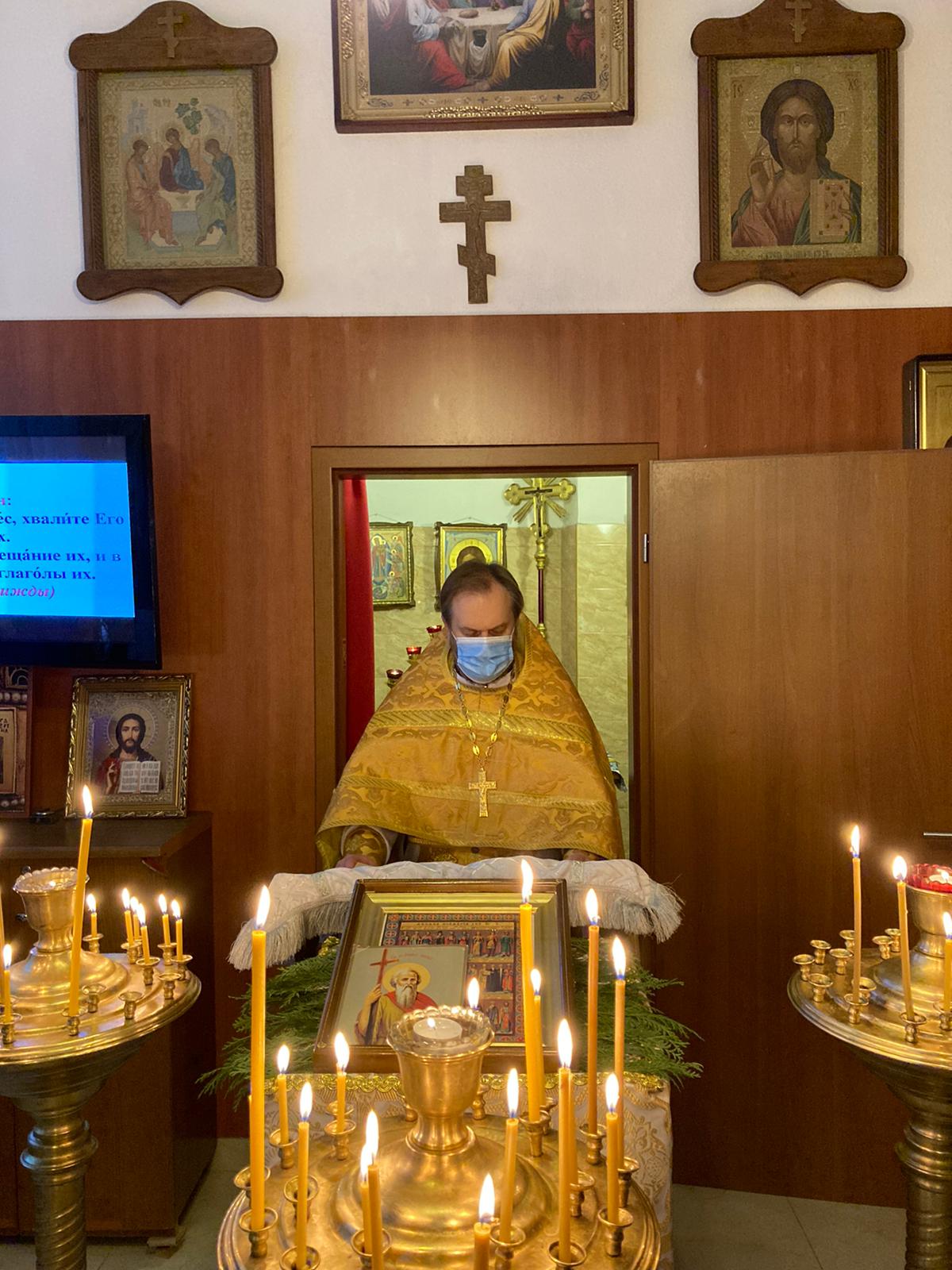 Евангельское зачало, содержащее рассказ об исцелении в субботу Господом сгорбленной 18 лет женщины, прочитал настоятель прихода иерей Димитрий. В продолжение Божественной литургии, после сугубой ектеньи, иерей Святослав вознес молитву об избавлении от губительного поветрия, испрашивая прекращения распространения коронавирусной инфекции.