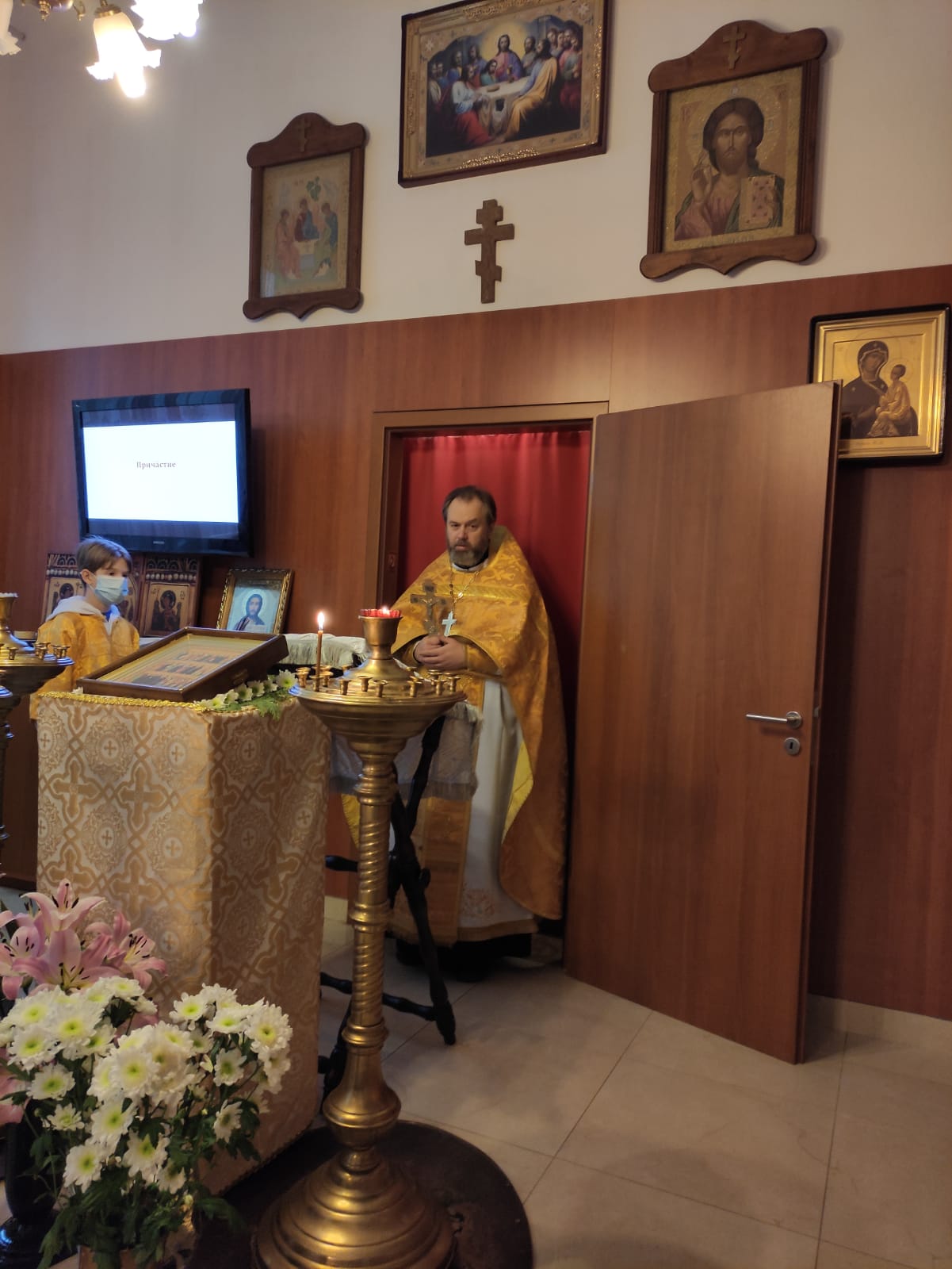 Продолжая богослужение, после сугубой ектеньи, иерей Святослав вознес молитву ко Господу о прекращении губительного поветрия распространяющейся коронавирусной инфекции.