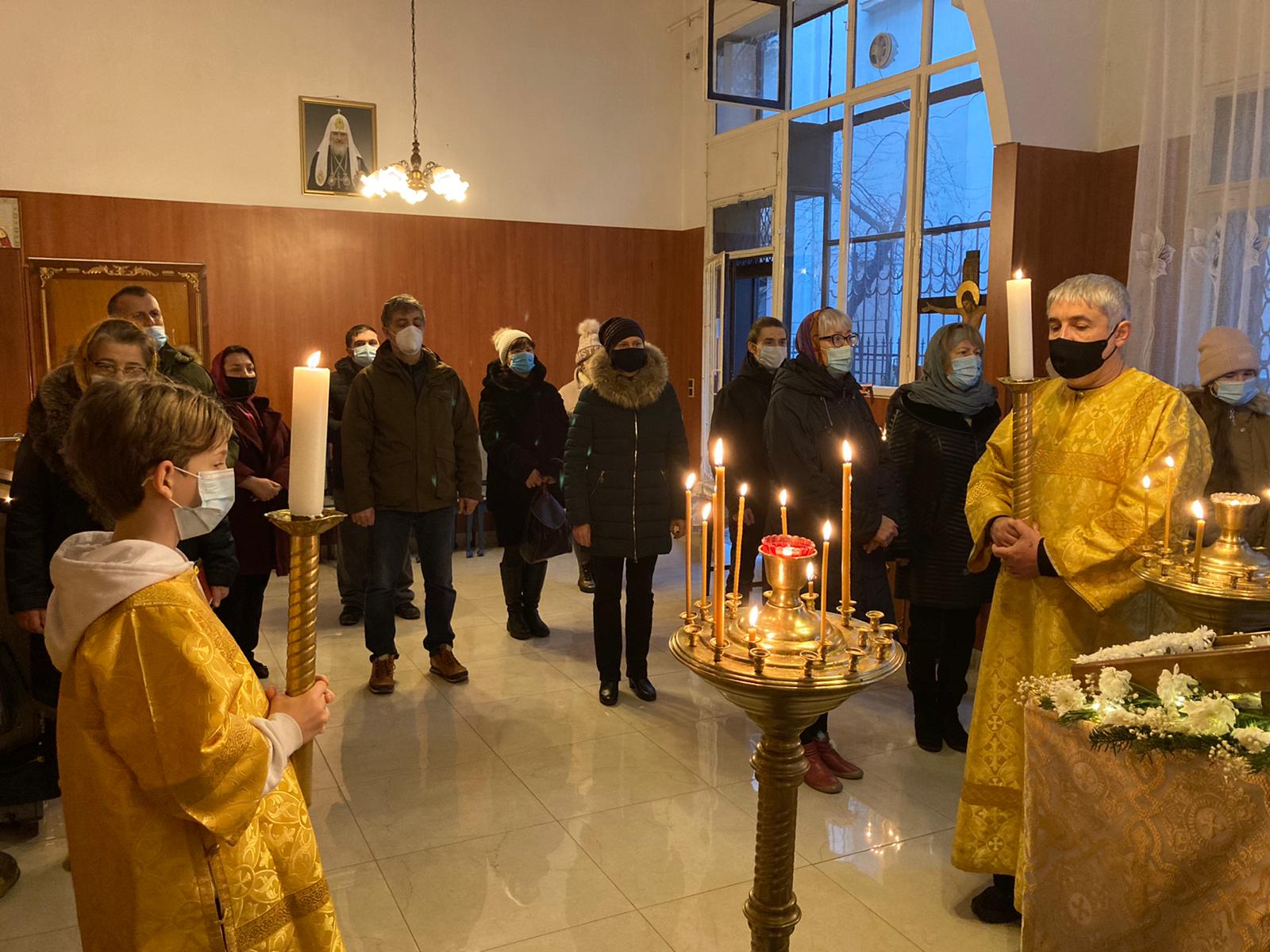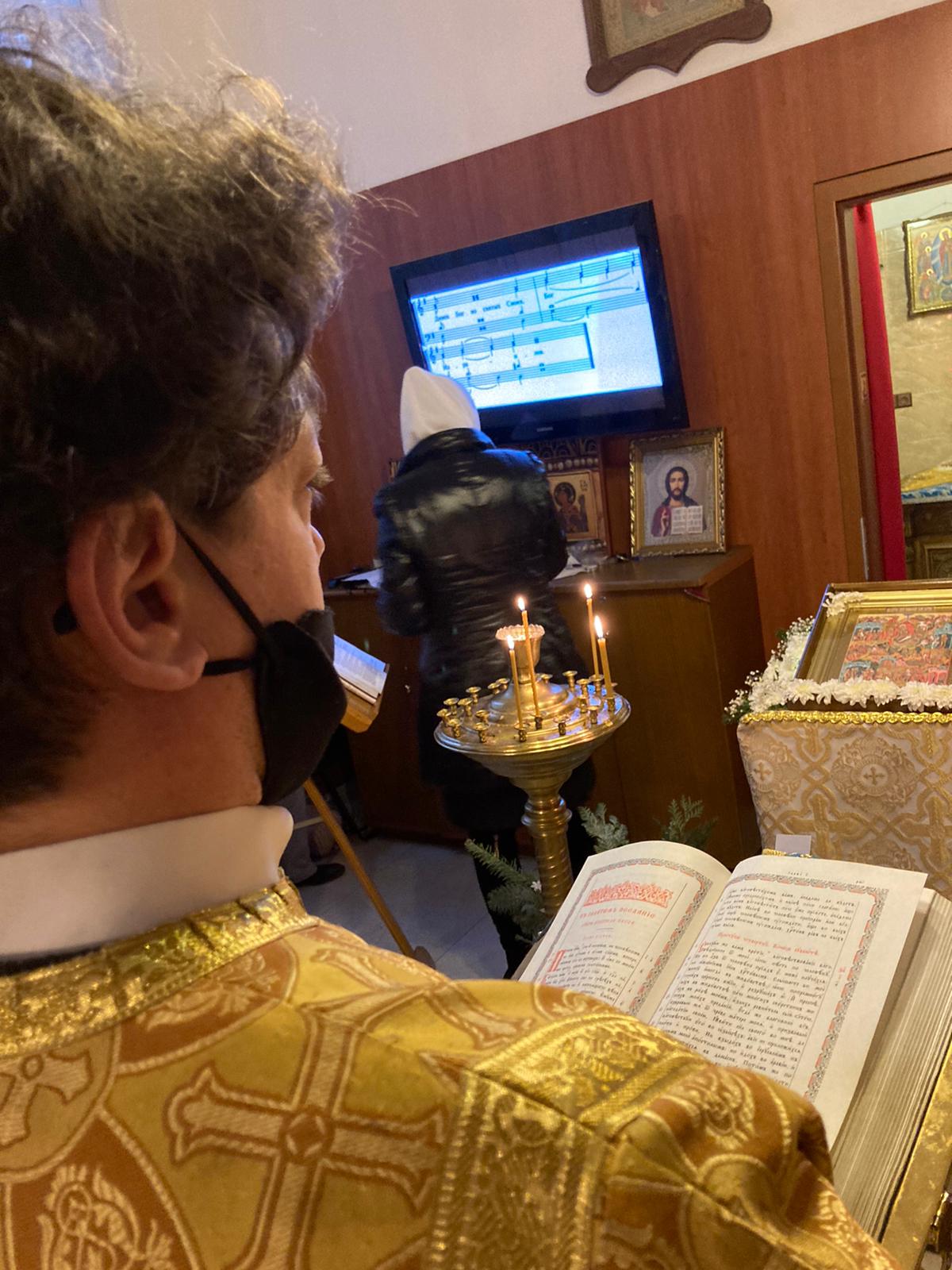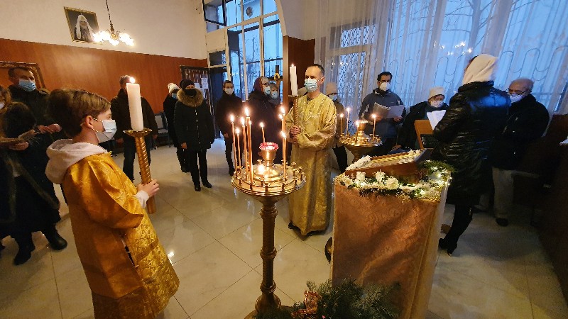 Молитвенные песнопения Рождественского попразднства, его торжественные стихиры, величественный тропарь исполнили певчие приходского хора под управлением Евы Гволик и Ольги Булгаковой. В апостольском послании к Галатам, прочитанном алтарником Владимиром Архангельским, молящимся был представлен рассказ святого Павла о его неумеренном, в прошлом, ревностном следовании отеческим преданиям.
