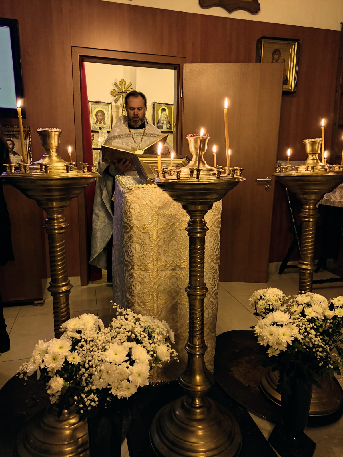 Торжественное всенощное бдение началось великим повечерием, на котором была величественно воспета песнь пророка Исайи «С нами Бог!». По завершении вступительной части праздничного богослужения настоятель прихода иерей Димитрий Корнилов в сослужении священника прихода иерея Святослава Булаха совершил чинопоследование литии, во время которого им были благословлены хлеб, пшеница, вино и елей.