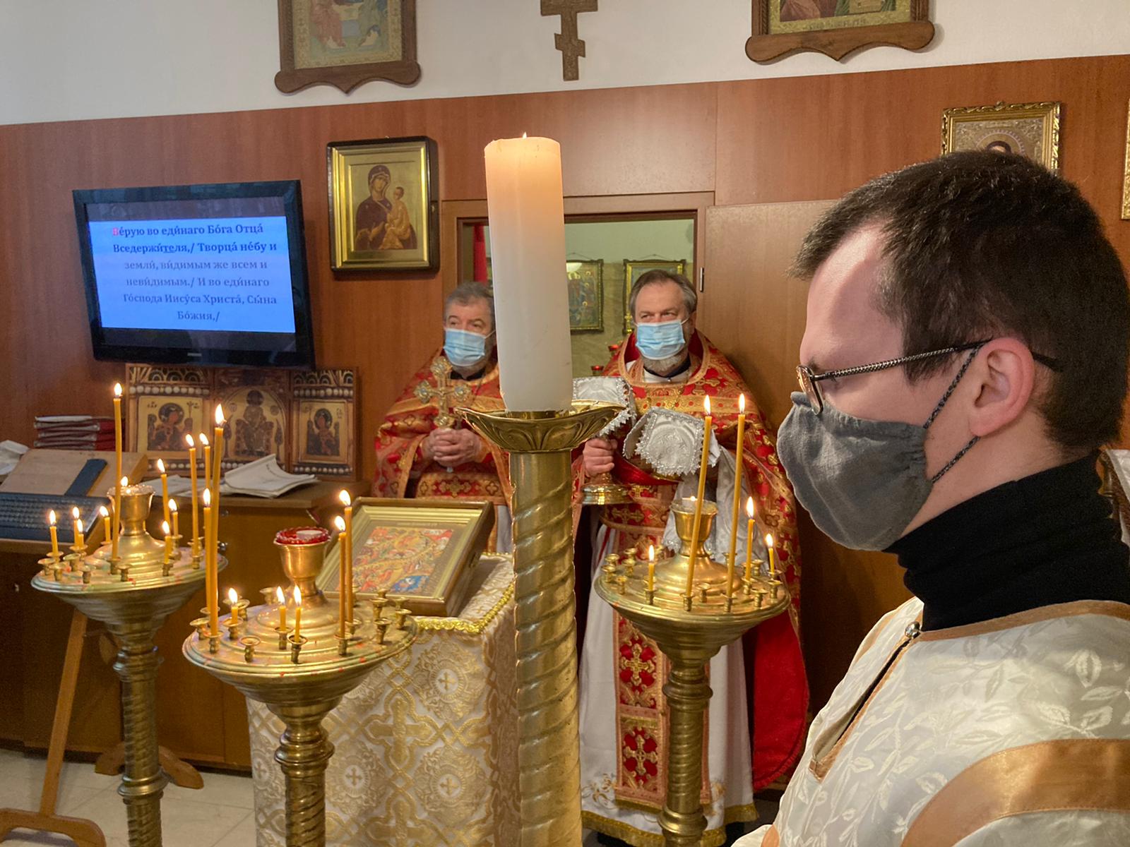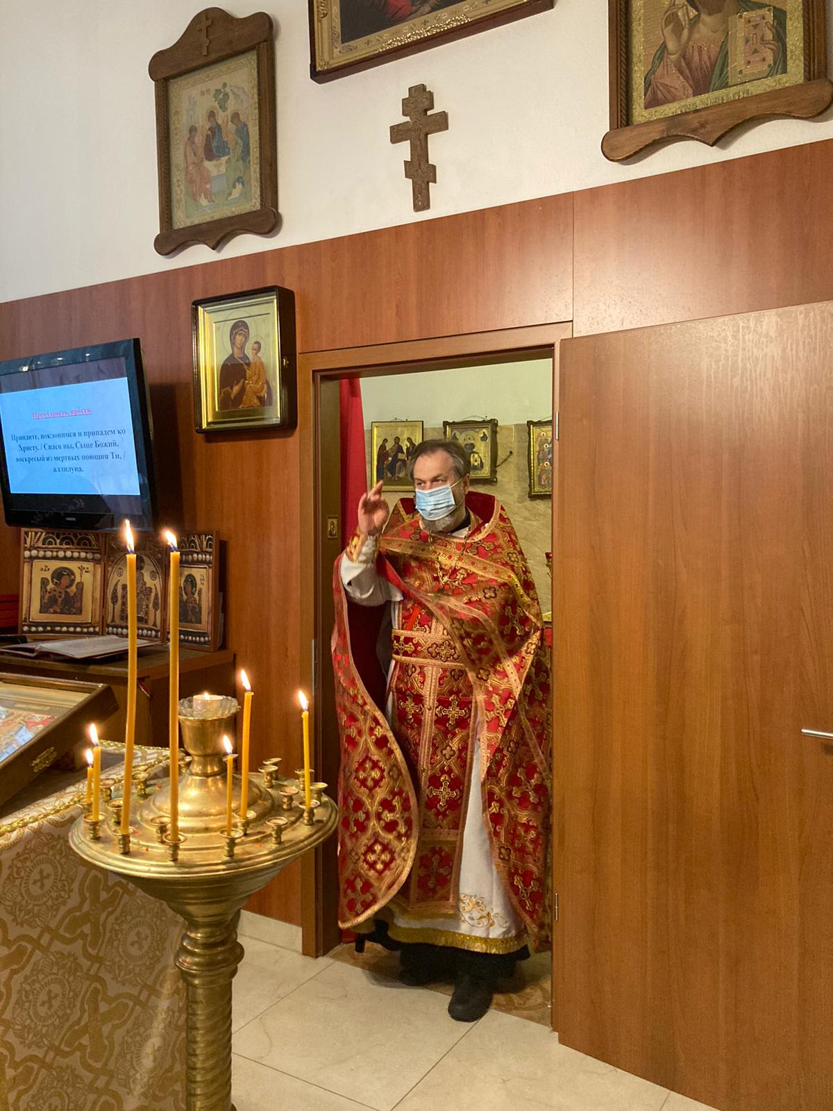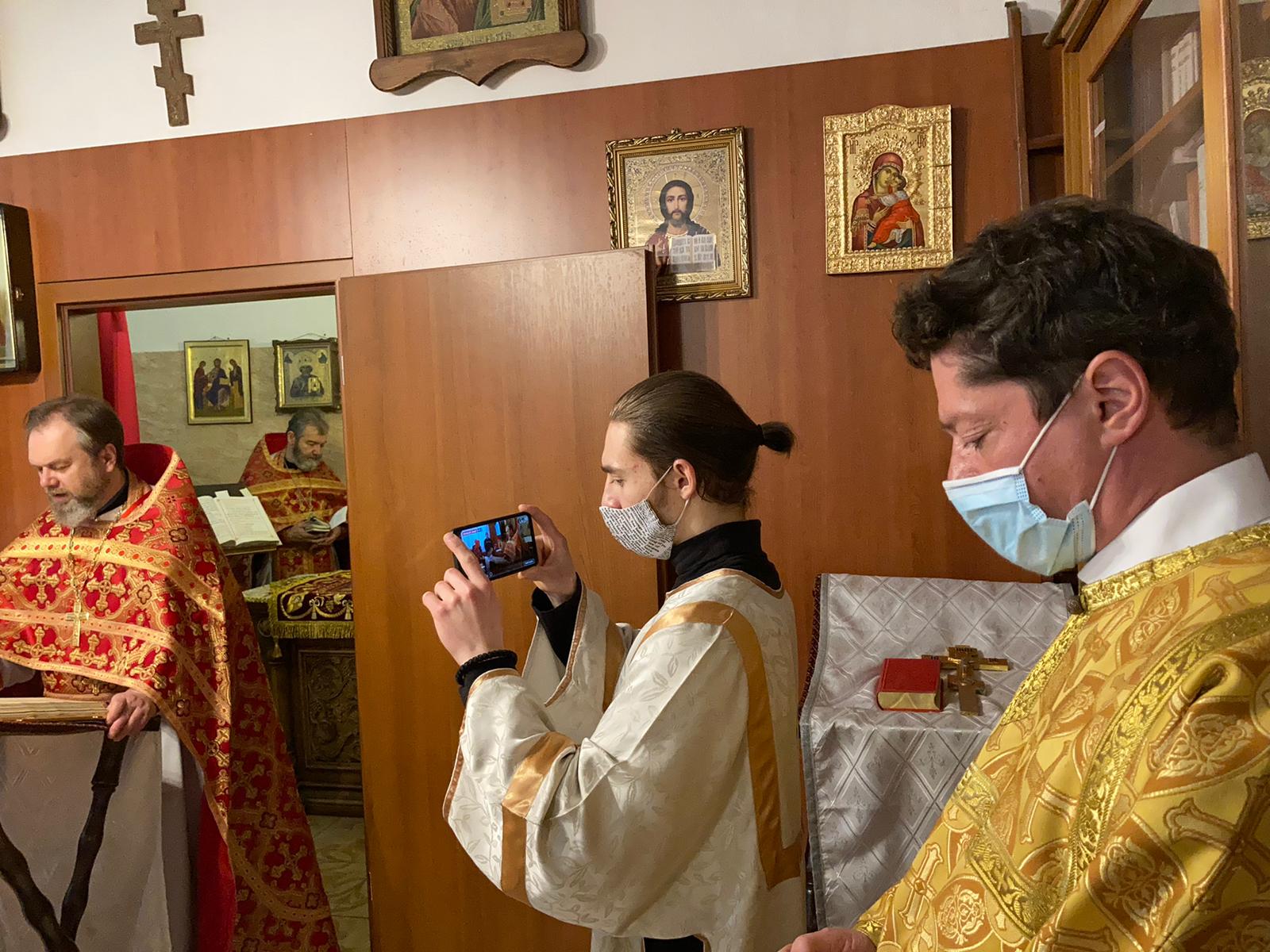 По прочтении Священного Писания, богослужение продолжилось прошениями сугубой ектеньи, после которой иерей Святослав вознес свою молитву о прекращении пагубного поветрия распространяющейся коронавирусной инфекции.