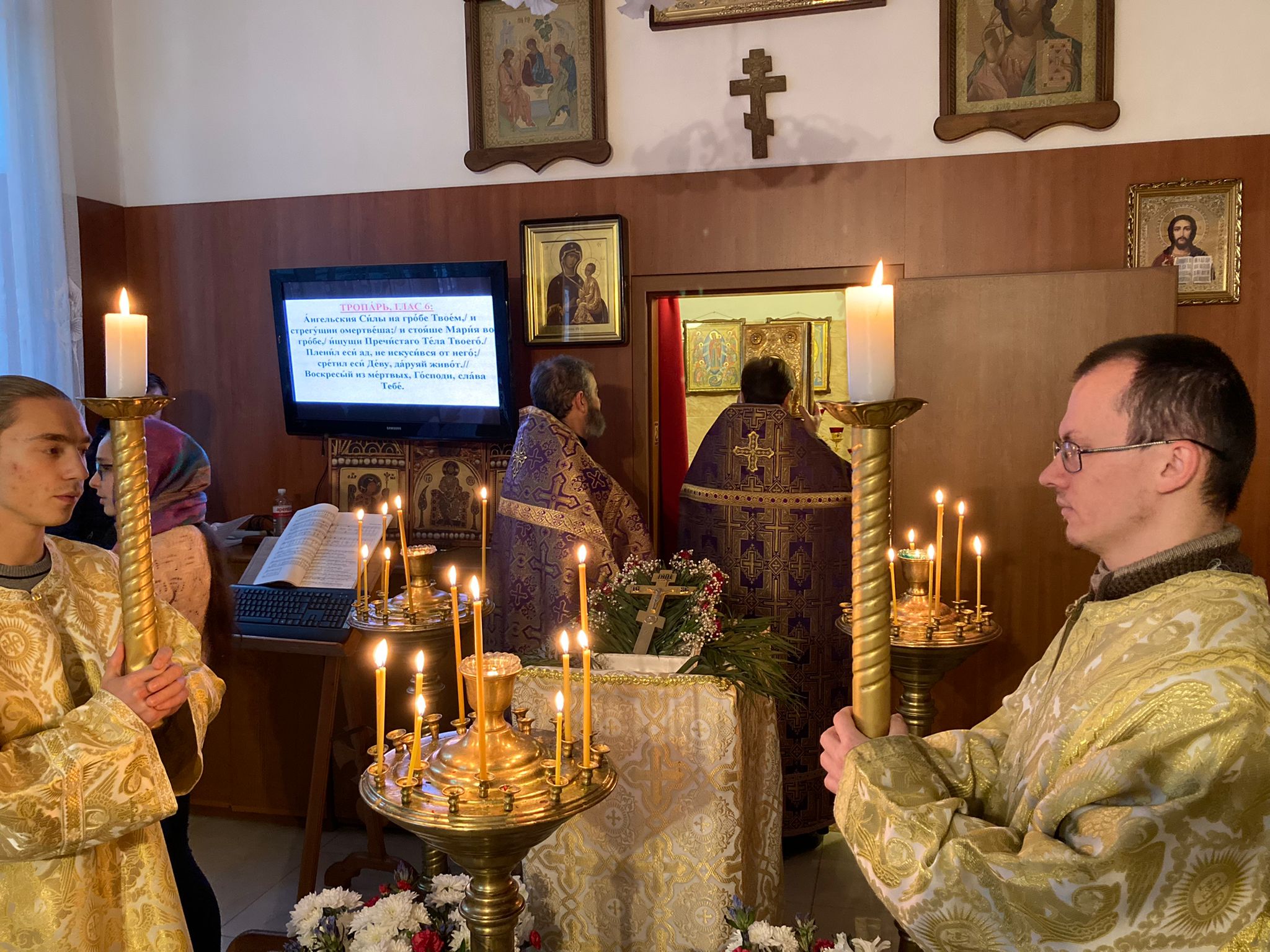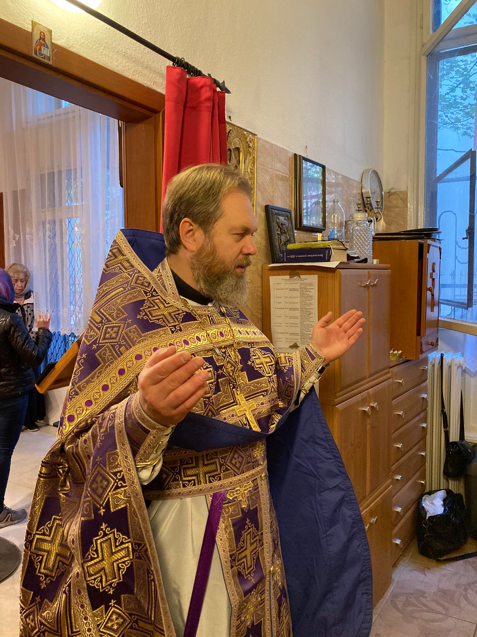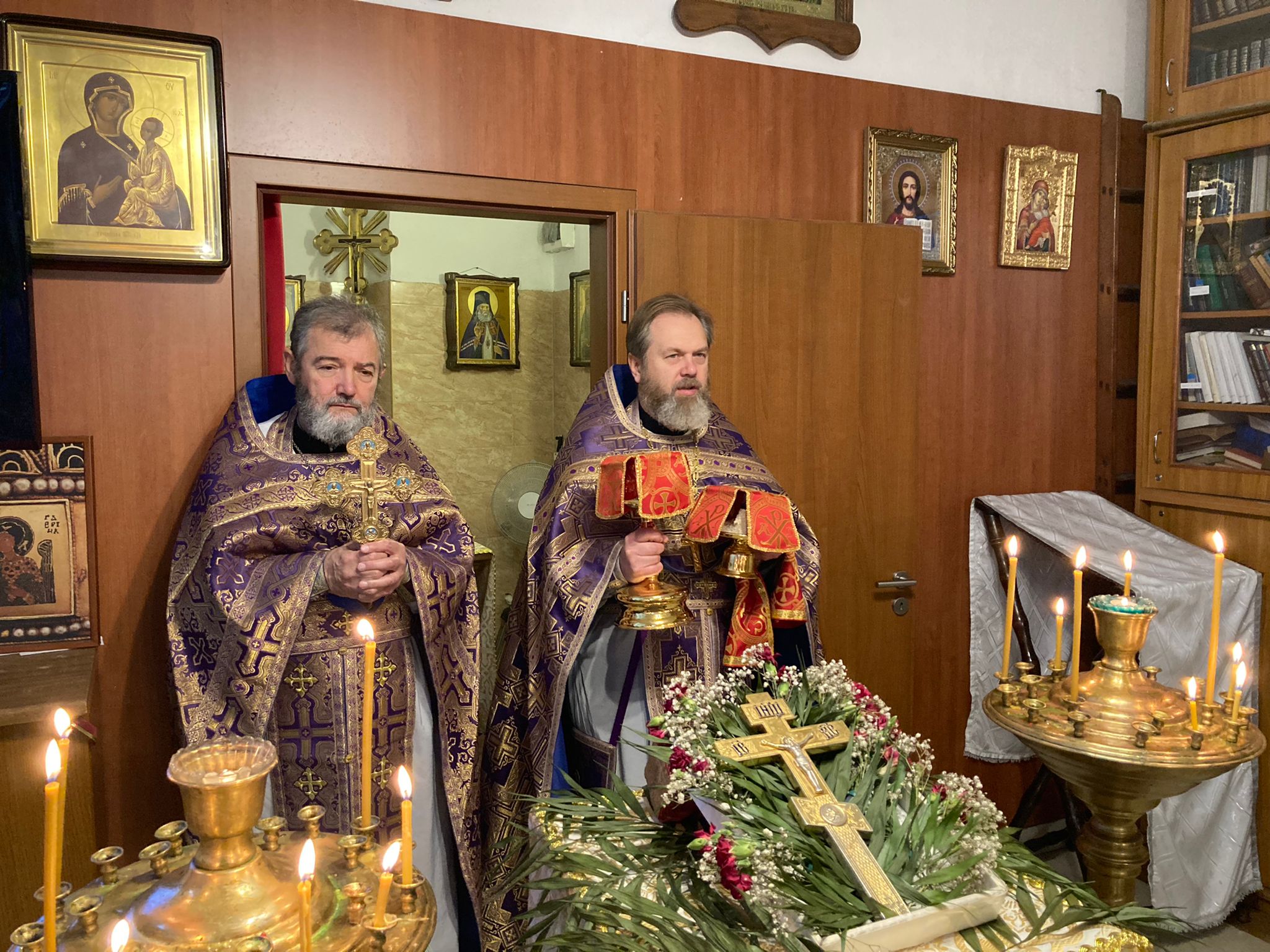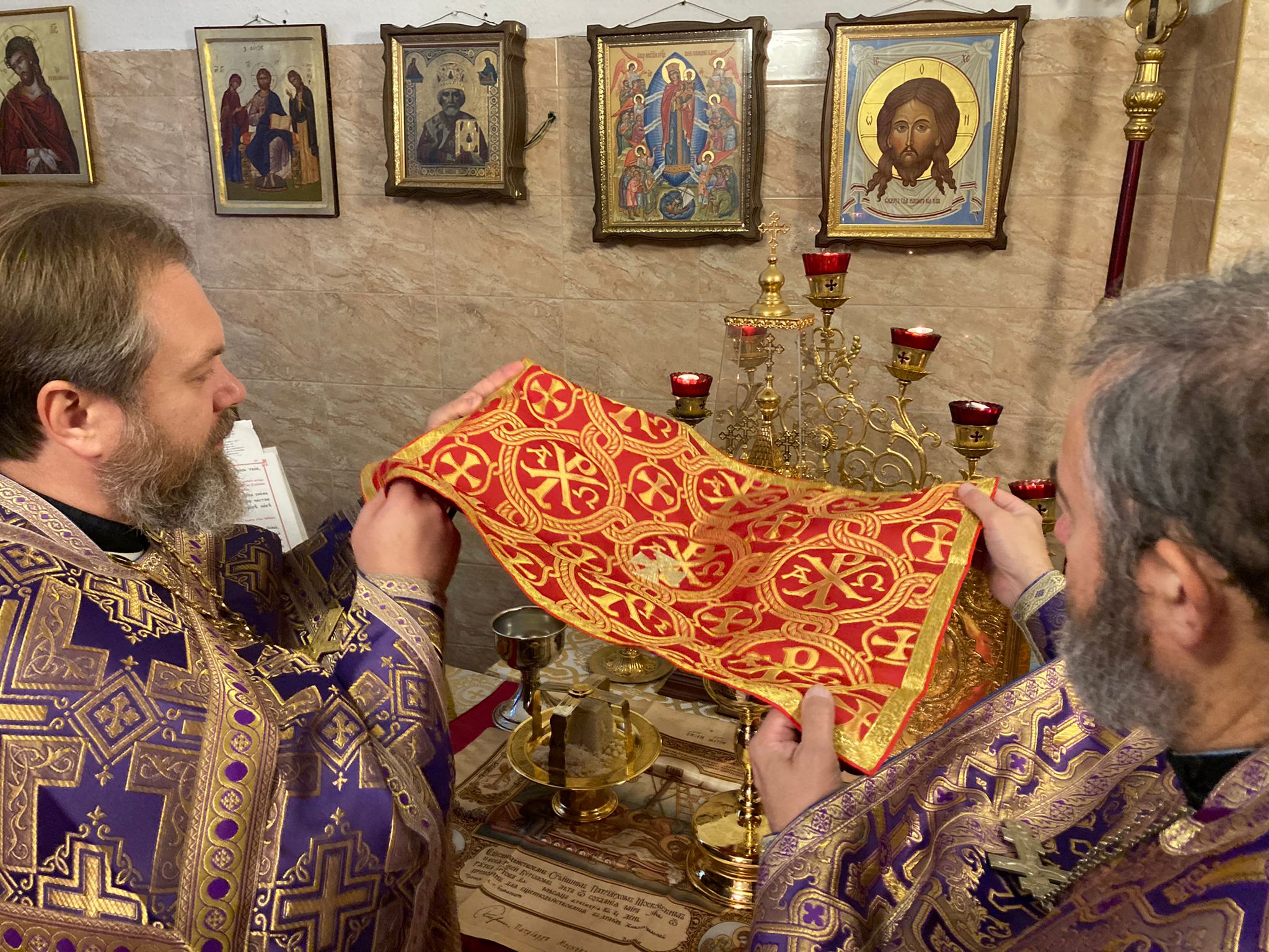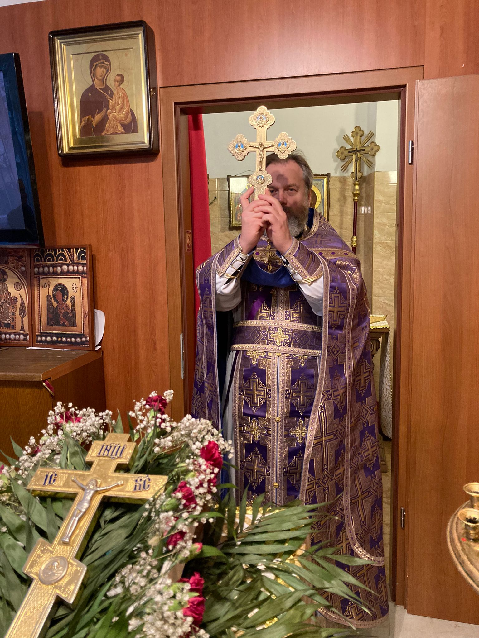 В читаемом иереем Димитрием Евангелии от Марка содержалось учение Господа Иисуса Христа о кресте, о необходимости несения сего креста каждым Его последователем для спасения души. По прочтении Священного Писания, после сугубой ектеньи, иерей Святослав вознес молитву о прекращении распространения коронавирусной инфекции.