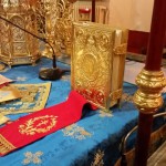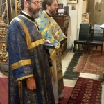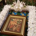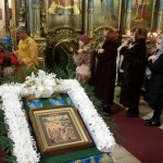 По окончании службы все молившиеся были помазаны елеем, освященным на поясе Пресвятой Богородицы, во исцелении души и тела, а также было пропето многое лета нашим именинникам Марине Лепахиной и Елене Гволик, регентам Успенского собора и нашего прихода.
