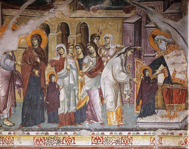 В этот день, в Успенском соборе состоялась Божественная Литургия, на которой многочисленные верующие, пришедшие на совместную молитву, обращали свои духовные взоры к Богородице Марии, некогда еще маленькой девочкой, приведенной во храм Господень. Мария была долгожданным, единственным чадом у благочестивых супругов Иоакима и Анны, которые состарились в бездетности. После сугубой молитвы ко Господу они получили откровение о рождении у них ребенка. Вскоре у них родилась дочь, которую назвали Мариам – Марией. Счастливые родители, благодарные Богу за Его великую милость, решили посвятить дочь Богу. В трехлетнем возрасте маленькую Марию привели в Иерусалимский храм, где ее встретил первосвященник Захария – по преданию, отец пророка и Крестителя Господня Иоанна. К удивлению, всех присутствовавших, Захария ввел девочку во Святая Святых – то место храма, куда мог входить лишь первосвященник однажды в году для принесения очистительной жертвы Богу. Получив откровение от Господа, первосвященник нарушил этот закон, введя во Святая Святых девочку, которой предстояло стать священным сосудом для воплотившегося через нее Сына Божия. С этого дня Мария воспитывалась при храме, обучаясь грамоте, молитве и рукоделию, и, по преданию, она часто молилась там, куда ее ввел первосвященник, и была наставляема и питаема Ангелом.