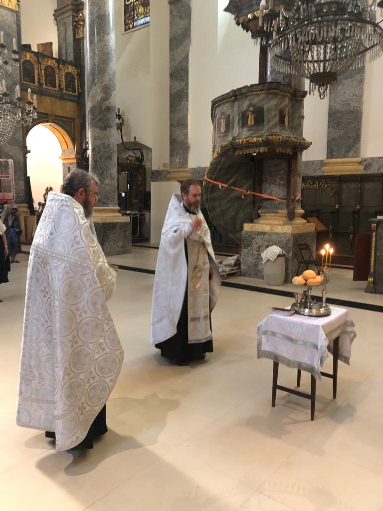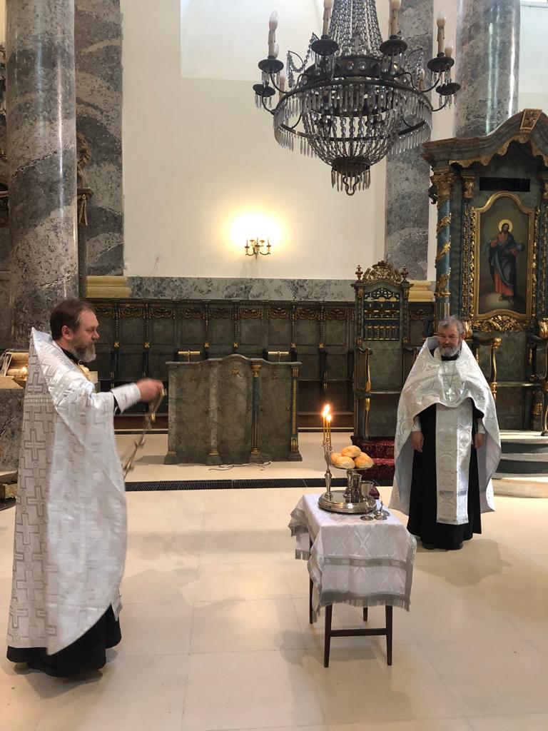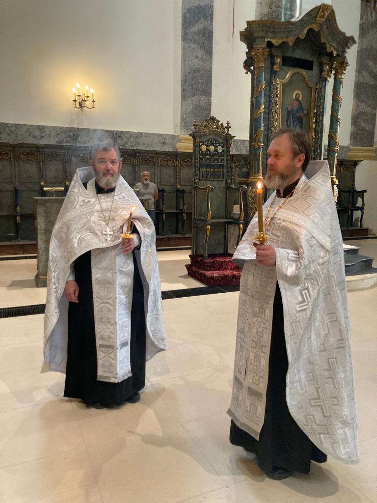 В завершение вечерни, во время литии, иерей Димитрий совершил чин благословения хлебов, пшеницы, вина и елея. Богослужение продолжилось торжественной полиелейной утреней. В Евангельском благовестии, прочитанном настоятелем, говорилось о многократных явлениях воскресшего Спасителя Своим ученикам, о Его заключительных повелениях им безбоязненно совершать проповедь слова Божиего.