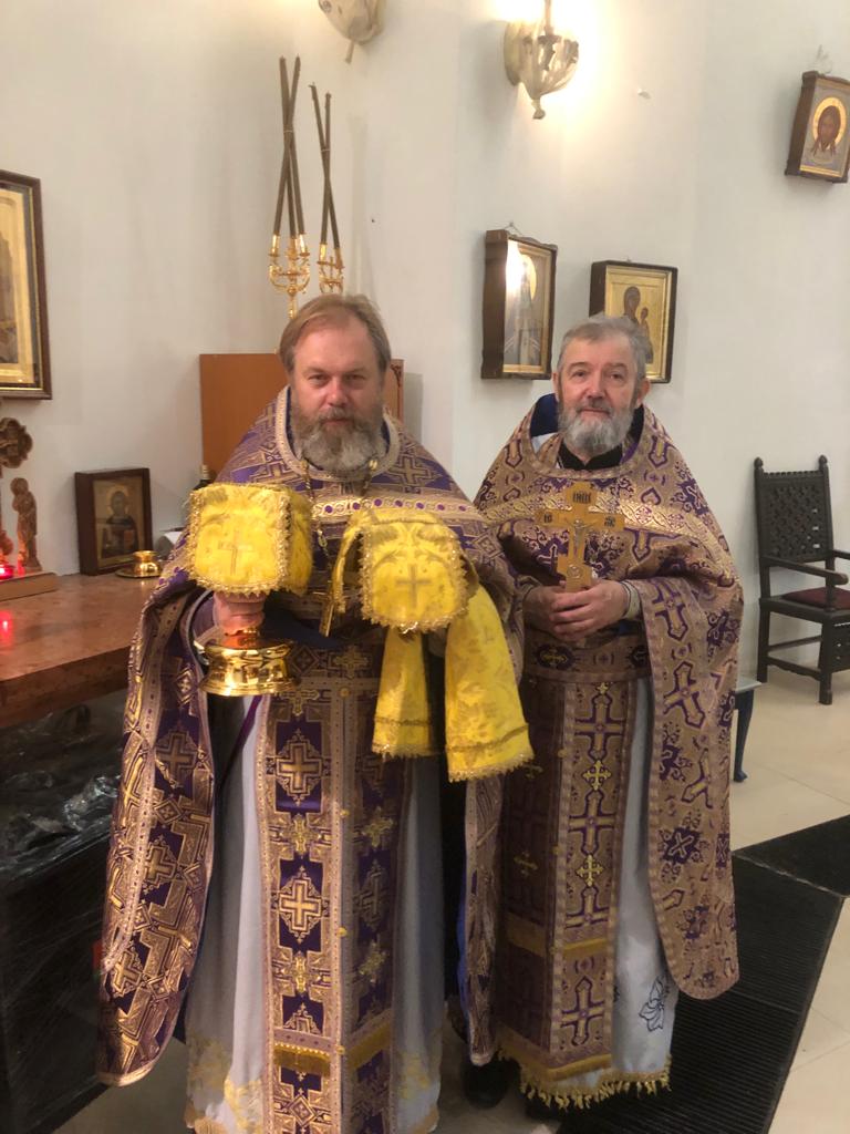 В продолжение богослужения, после сугубой ектении отец Святослав вознес молитву о восстановлении мира на Украине. Перед выносом Святых Даров настоятель обратился к прихожанам с пастырским словом.