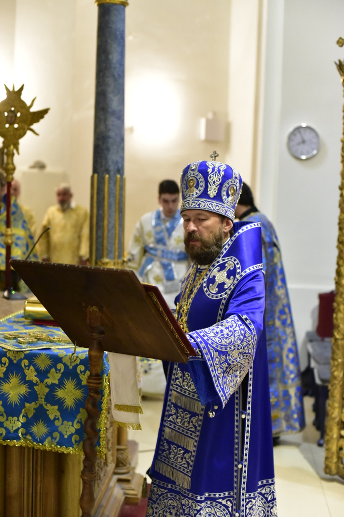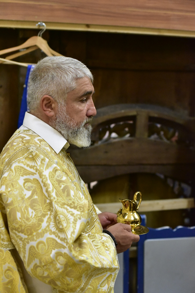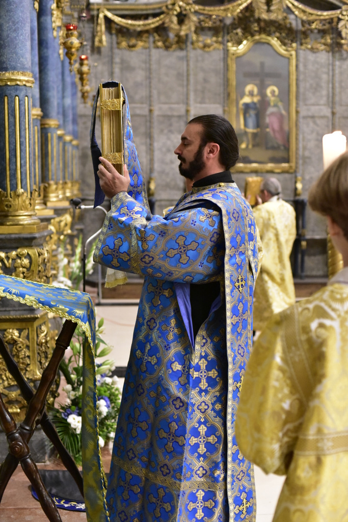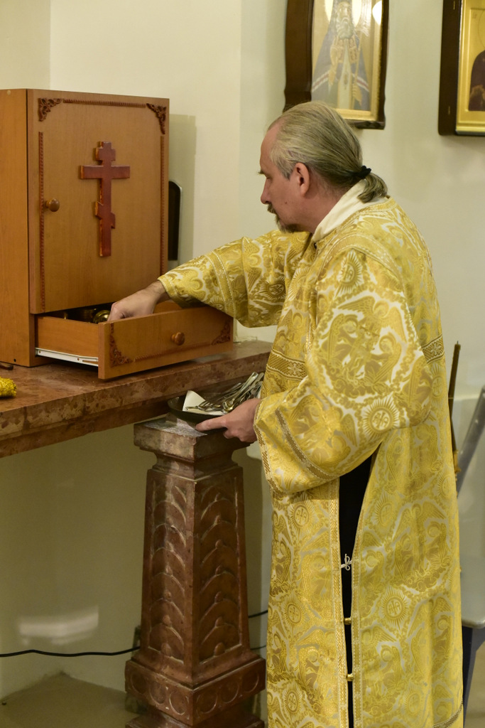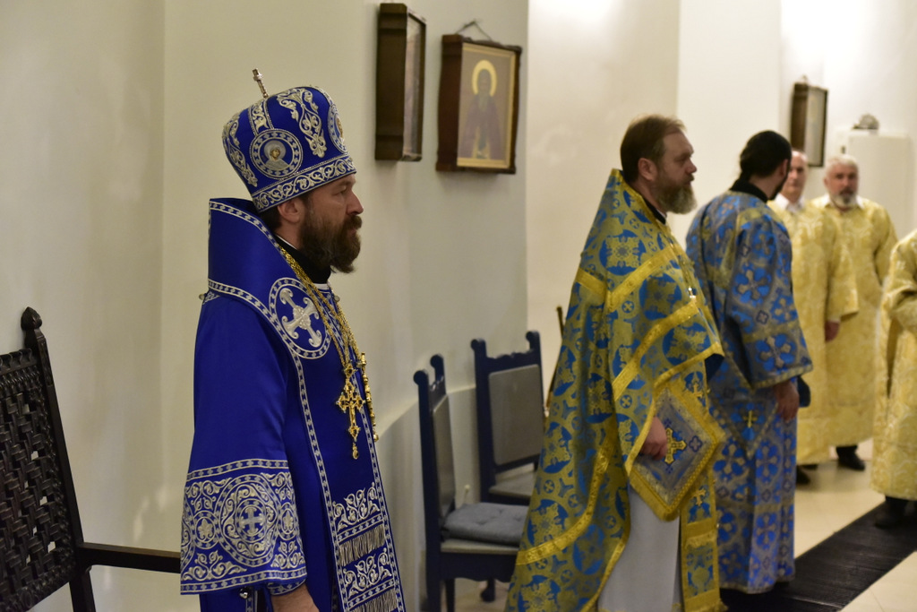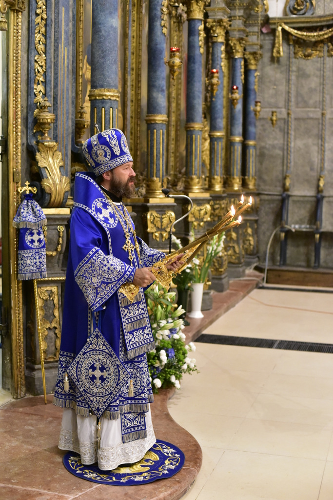 Этот евангельский рассказ, прочитанный дьяконом Стефаном Вайной, рассказал о событии принятия шествующего Господа Иисуса Христа двумя сестрами Марфой и Марией в свой дом. За Божественной литургией была совершена заупокойная ектения по почившему митрополиту Диоклийскому Ка́ллисту. После сугубой ектении Владыка Иларион вознес молитву восстановлении мира на Украине. Перед выносом Святых Даров к прихожанам обратился с проповедью на тему праздника Владыка Иларион.