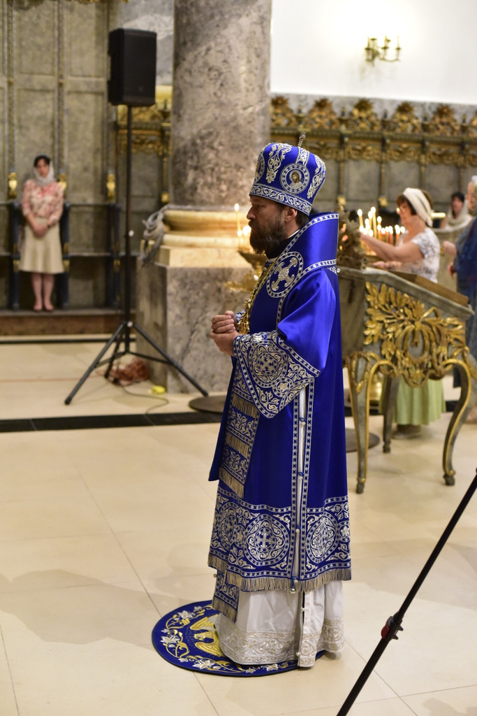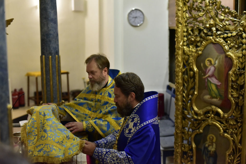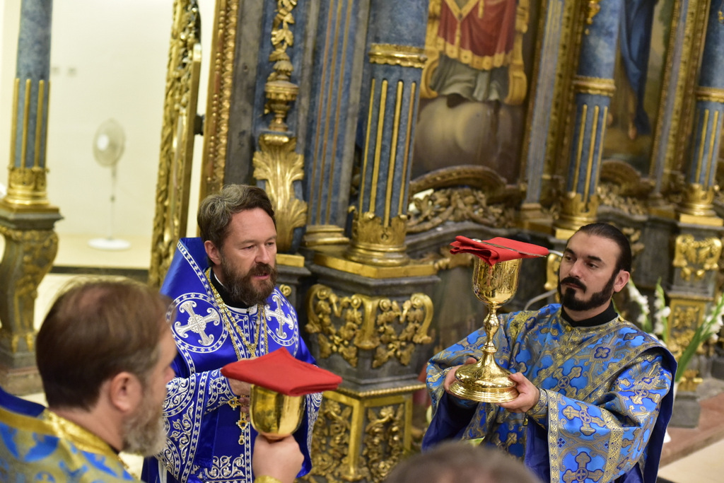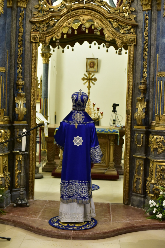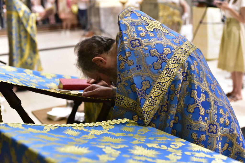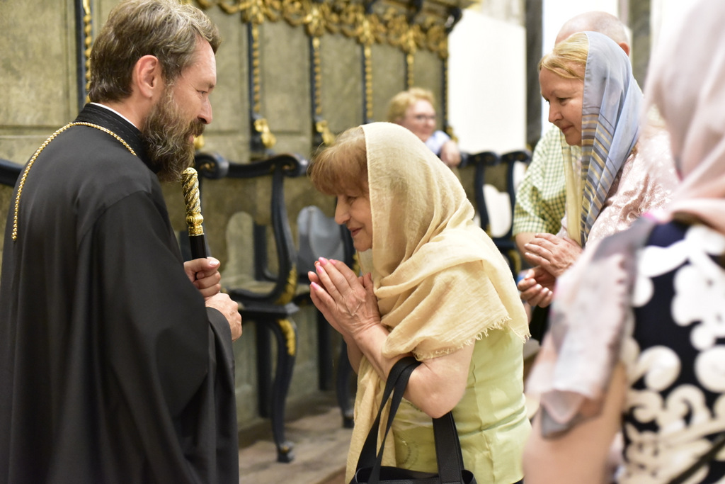 Этот евангельский рассказ, прочитанный дьяконом Стефаном Вайной, рассказал о событии принятия шествующего Господа Иисуса Христа двумя сестрами Марфой и Марией в свой дом. За Божественной литургией была совершена заупокойная ектения по почившему митрополиту Диоклийскому Ка́ллисту. После сугубой ектении Владыка Иларион вознес молитву восстановлении мира на Украине. Перед выносом Святых Даров к прихожанам обратился с проповедью на тему праздника Владыка Иларион.