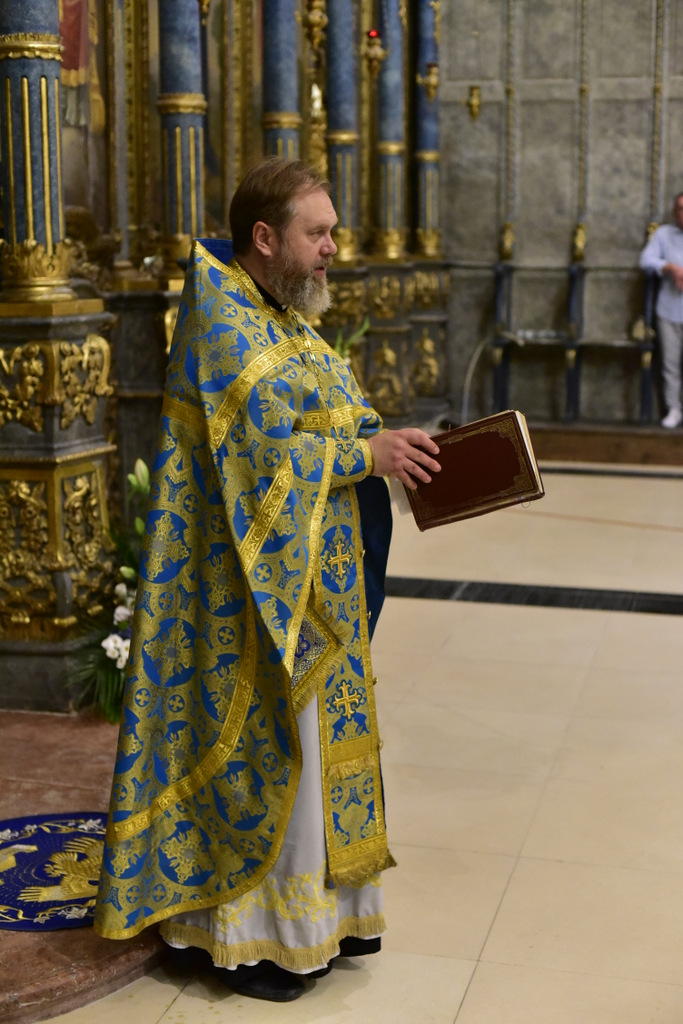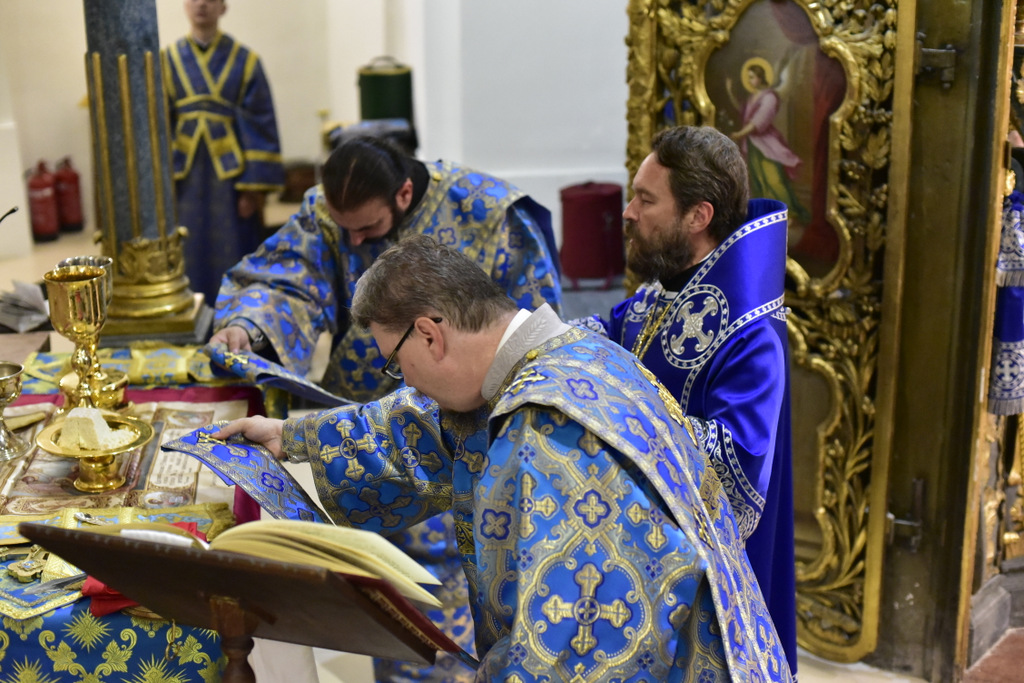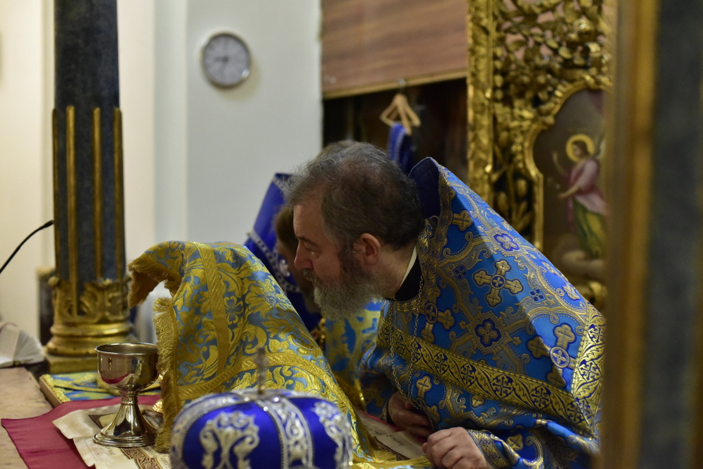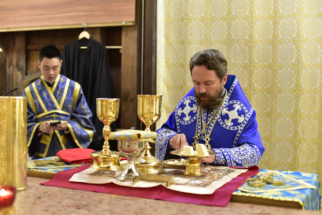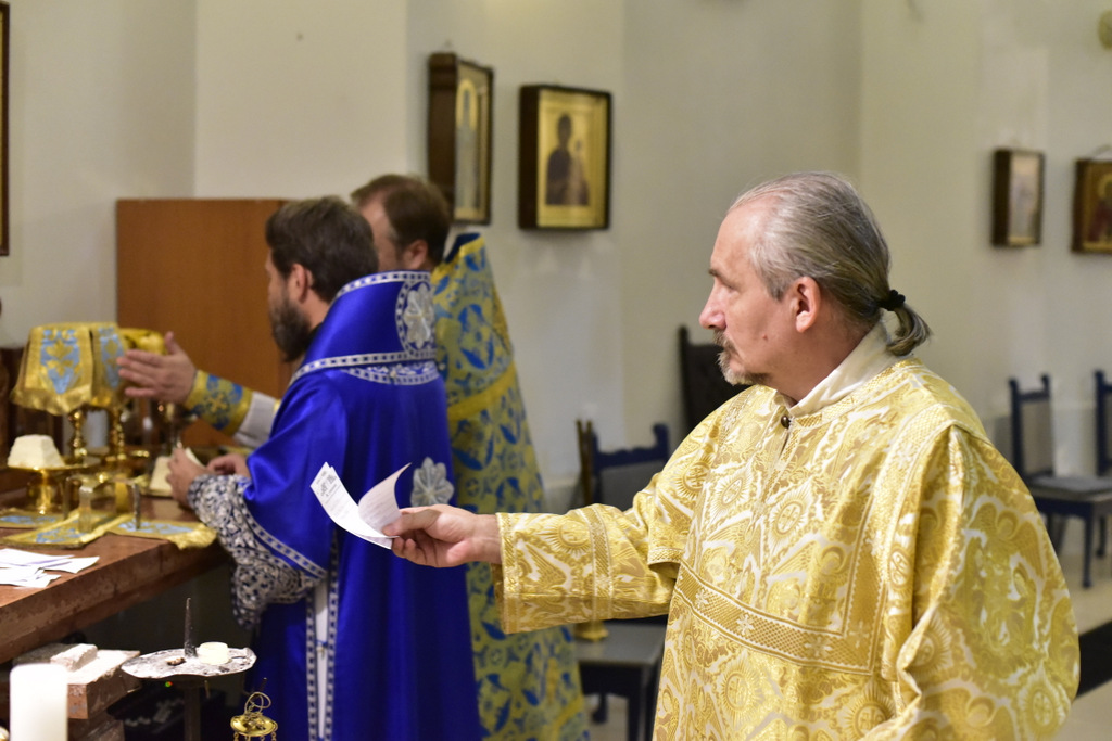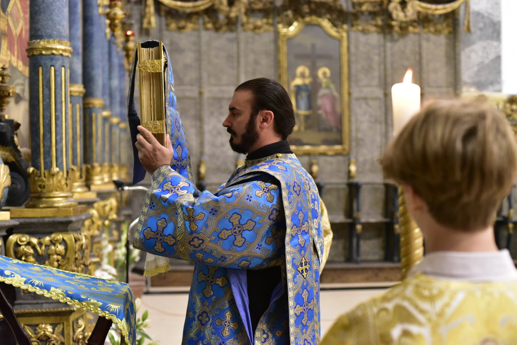 Этот евангельский рассказ, прочитанный дьяконом Стефаном Вайной, рассказал о событии принятия шествующего Господа Иисуса Христа двумя сестрами Марфой и Марией в свой дом. За Божественной литургией была совершена заупокойная ектения по почившему митрополиту Диоклийскому Ка́ллисту. После сугубой ектении Владыка Иларион вознес молитву восстановлении мира на Украине. Перед выносом Святых Даров к прихожанам обратился с проповедью на тему праздника Владыка Иларион.