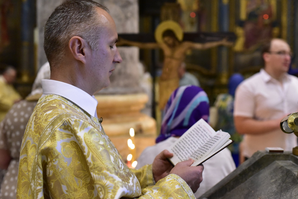 Торжественно провожаемая всеми небесными чинами, несомая на руках Господа Иисуса Христа, душа Пречистой Девы Марии вознеслась в горние селения. Молитвенные песнопения были исполнены певчими хора под управлением Евы Гволик. Евангельским чтением торжественного богослужения был отрывок из благовестия апостола Луки, установленный Святой Церковью к прочтению во все праздники, посвященные Божией Матери.