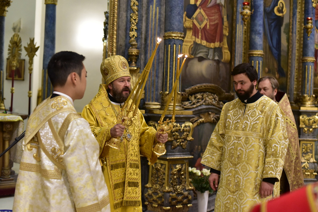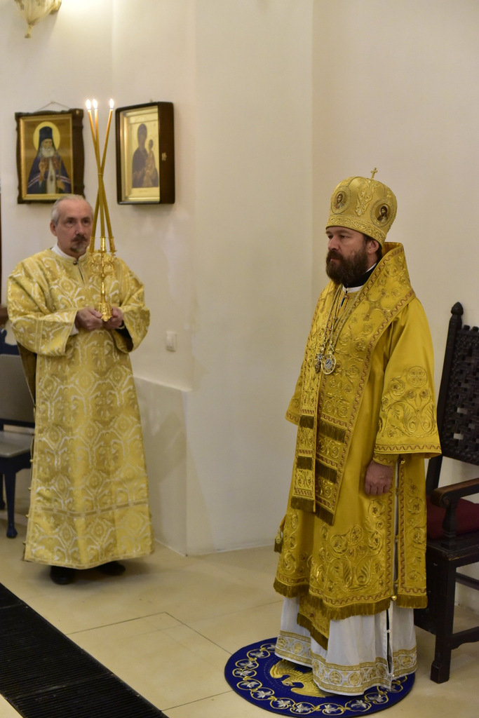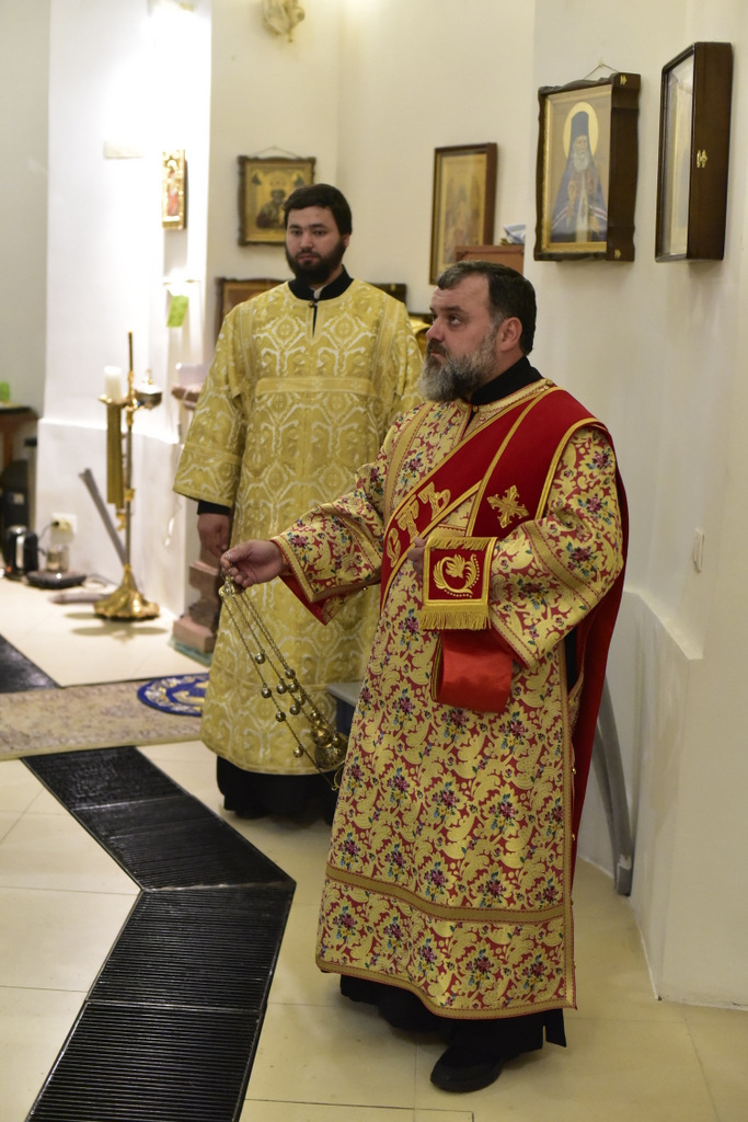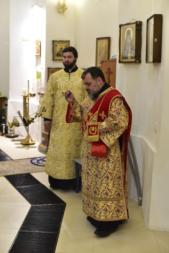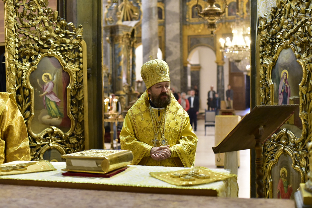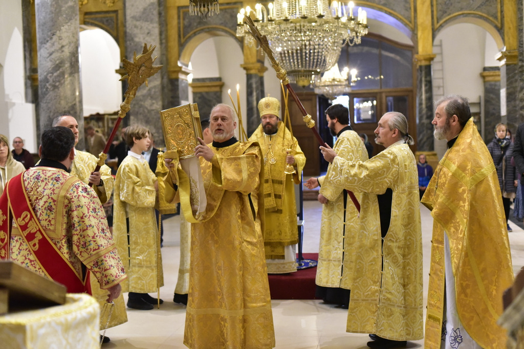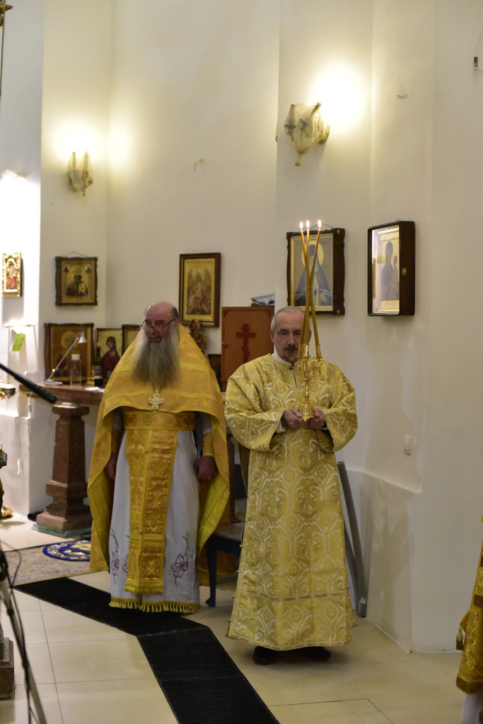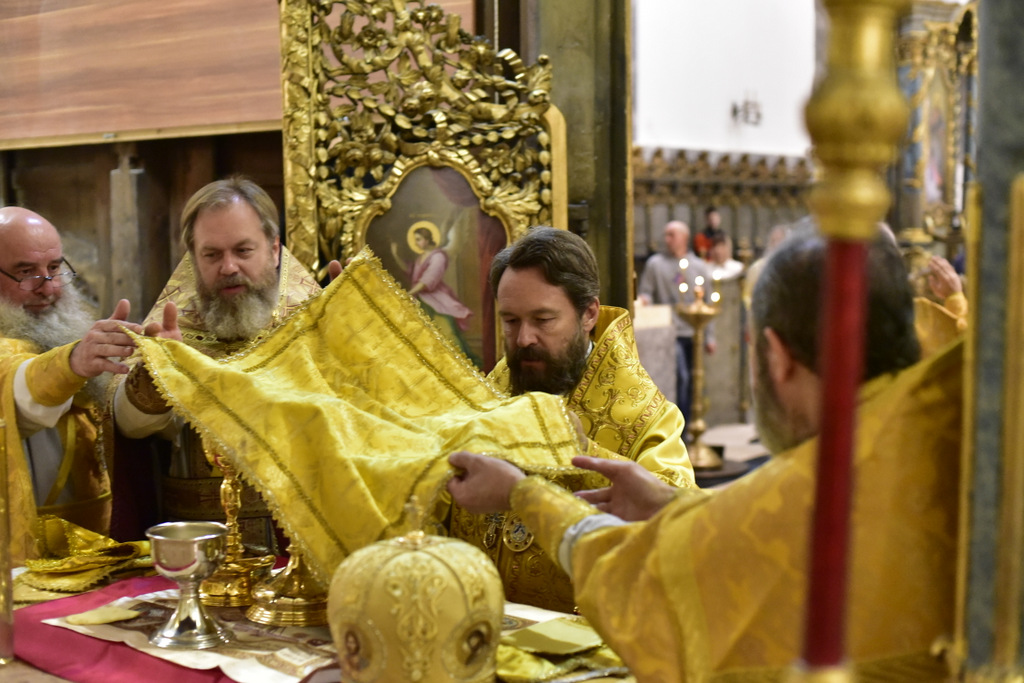 Ему сослужил настоятель Свято-Троицкого прихода иерей Димитрий Корнилов, священник прихода Святослав Булах, а также дьякон Владимир Чепыжов. Богослужение проходило в Успенском соборе г. Будапешта.