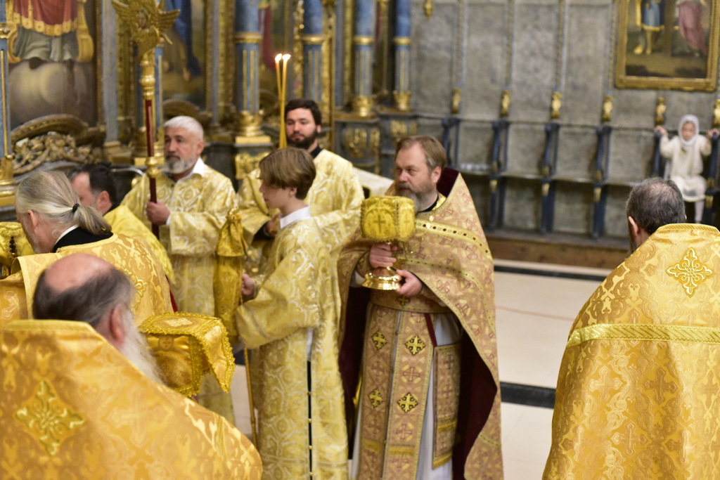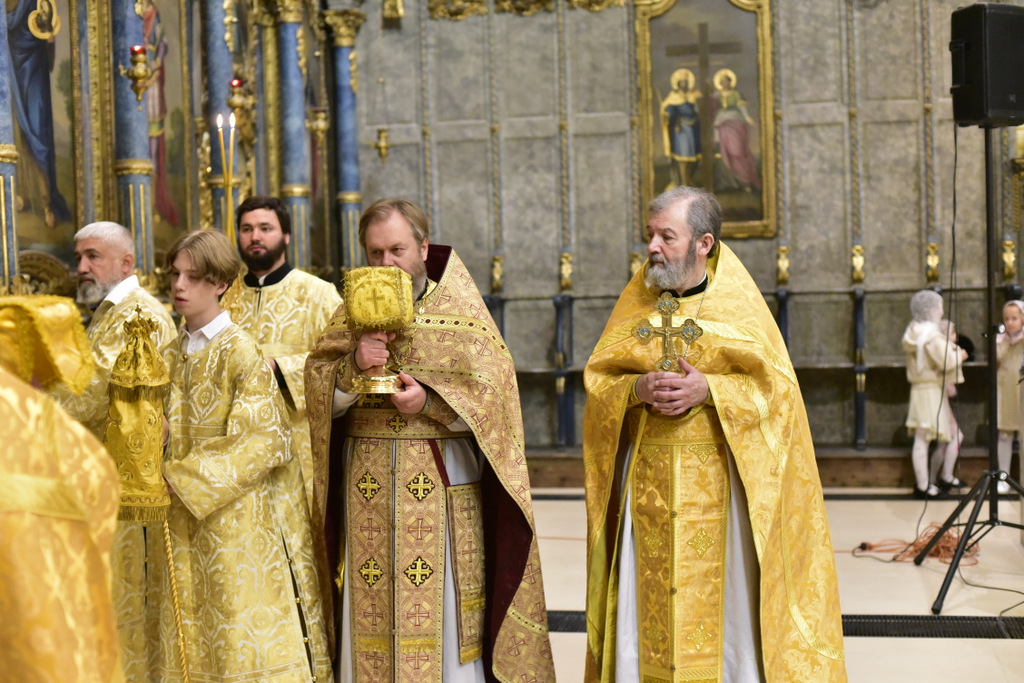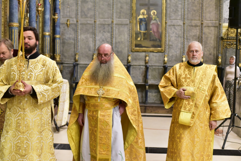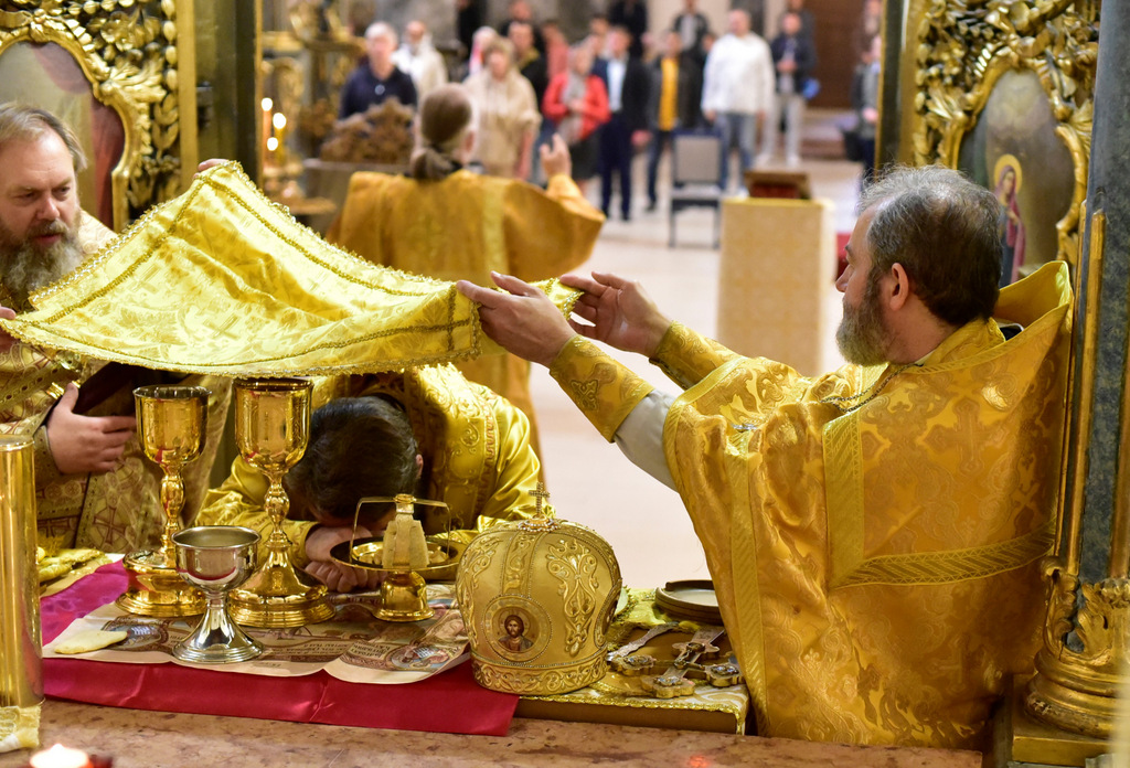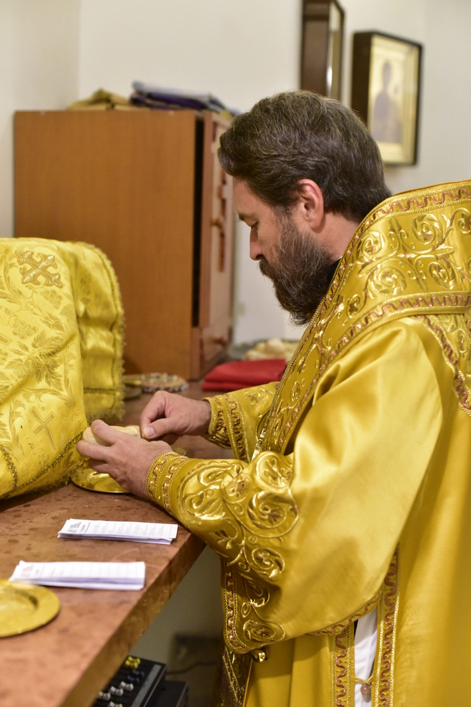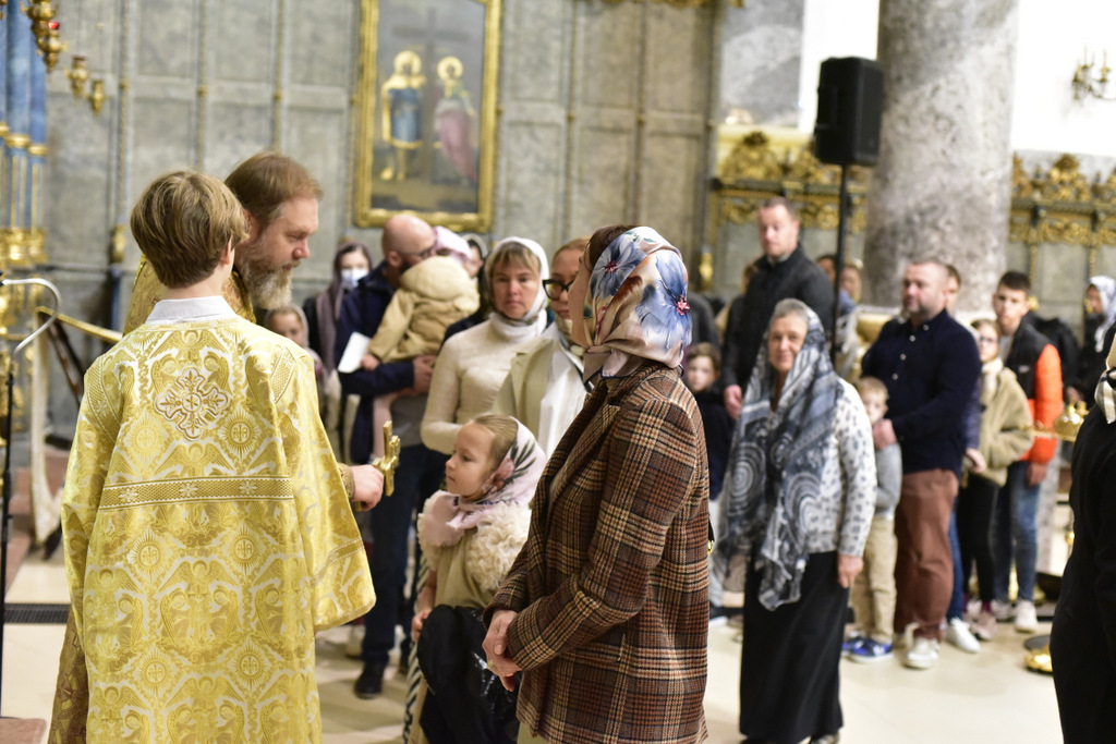 В Евангельском зачале, прочитанном дьяконом Владимиром, апостол Матфей приводит притчу, рассказанную Спасителем, о званных на брачный пир и о недостойном посетителе, позорившем это торжество, придя в нечистой, непраздничной одежде. Богослужение продолжилось сугубой ектенией, после которой предстоятель вознес молитву о восстановлении мира на Украине. Далее состоялось причащение прихожан Святыми Христовыми Тайнами.