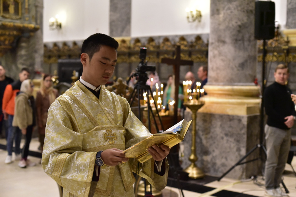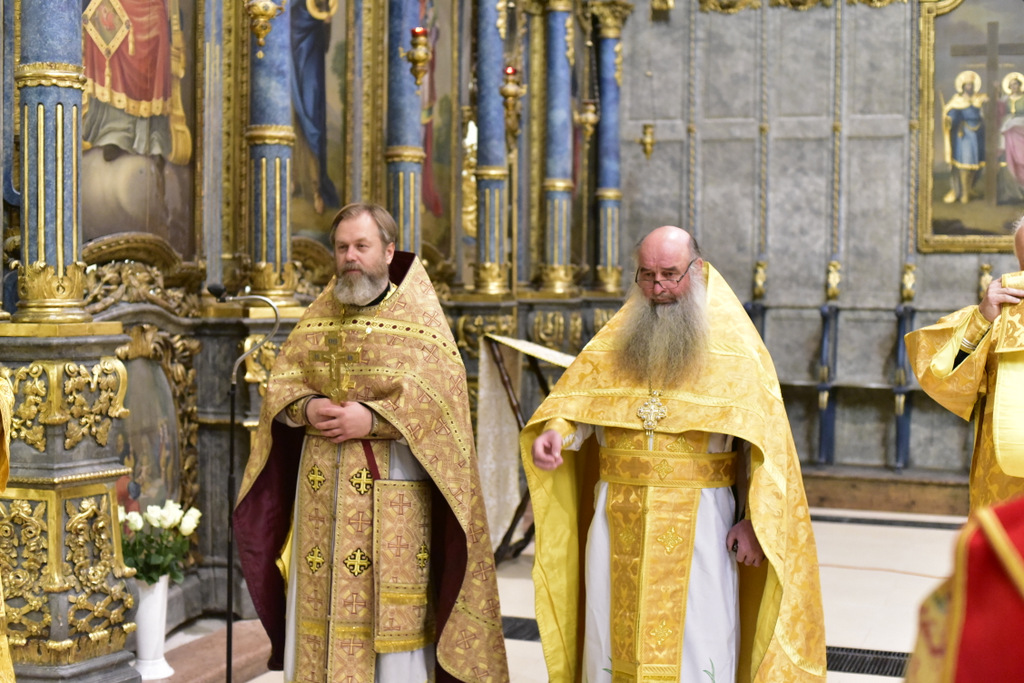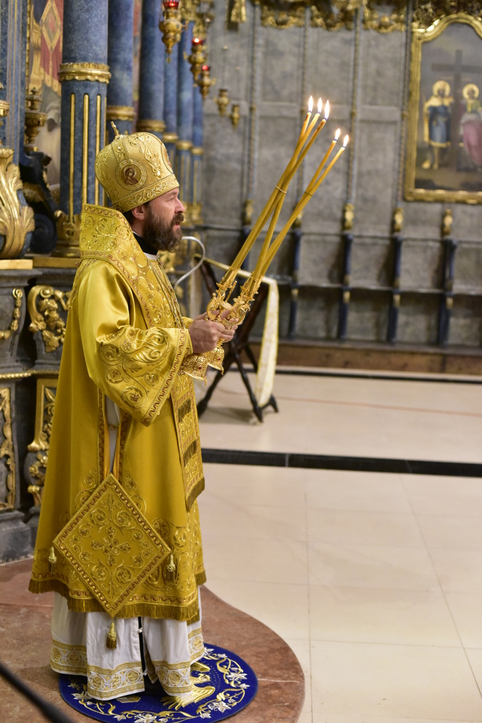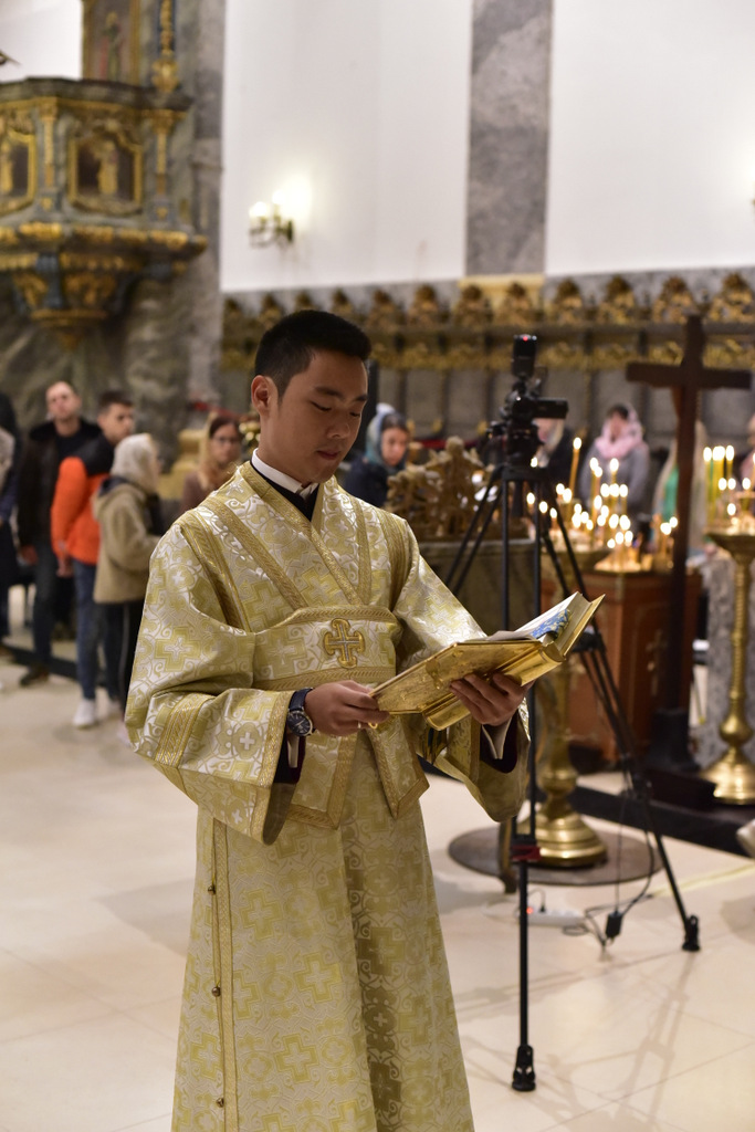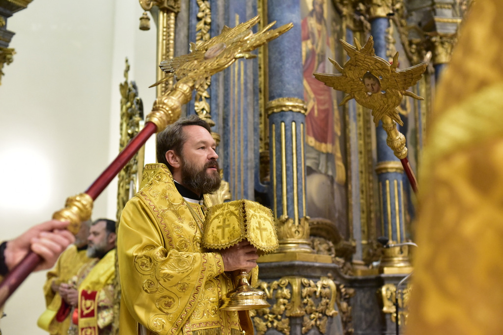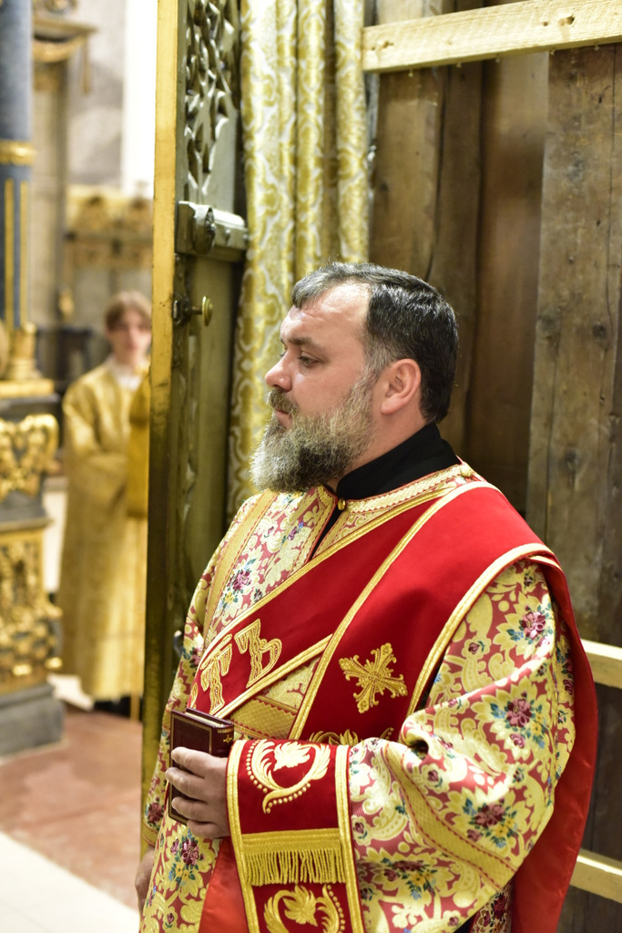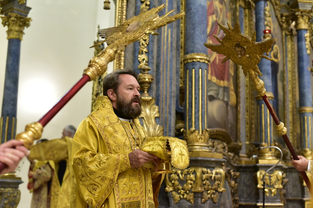 В Евангельском зачале, прочитанном дьяконом Владимиром, апостол Матфей приводит притчу, рассказанную Спасителем, о званных на брачный пир и о недостойном посетителе, позорившем это торжество, придя в нечистой, непраздничной одежде. Богослужение продолжилось сугубой ектенией, после которой предстоятель вознес молитву о восстановлении мира на Украине. Далее состоялось причащение прихожан Святыми Христовыми Тайнами.