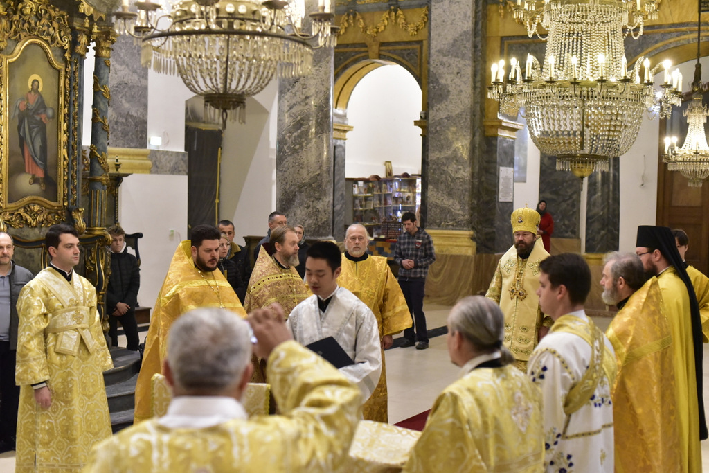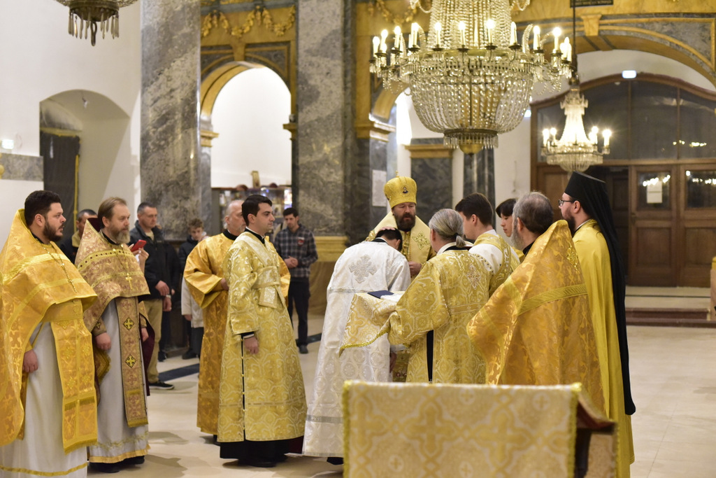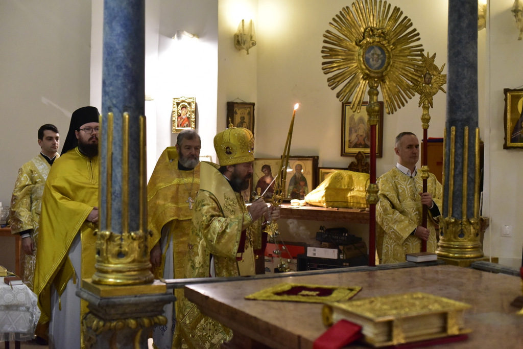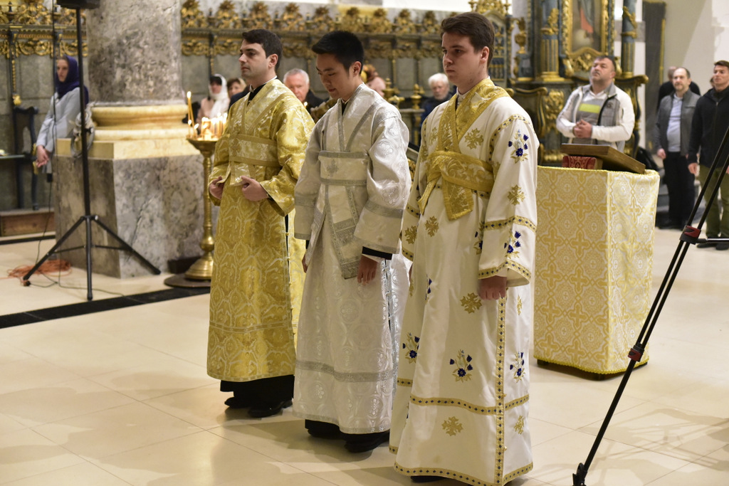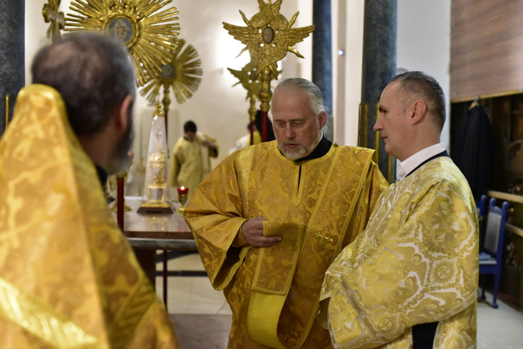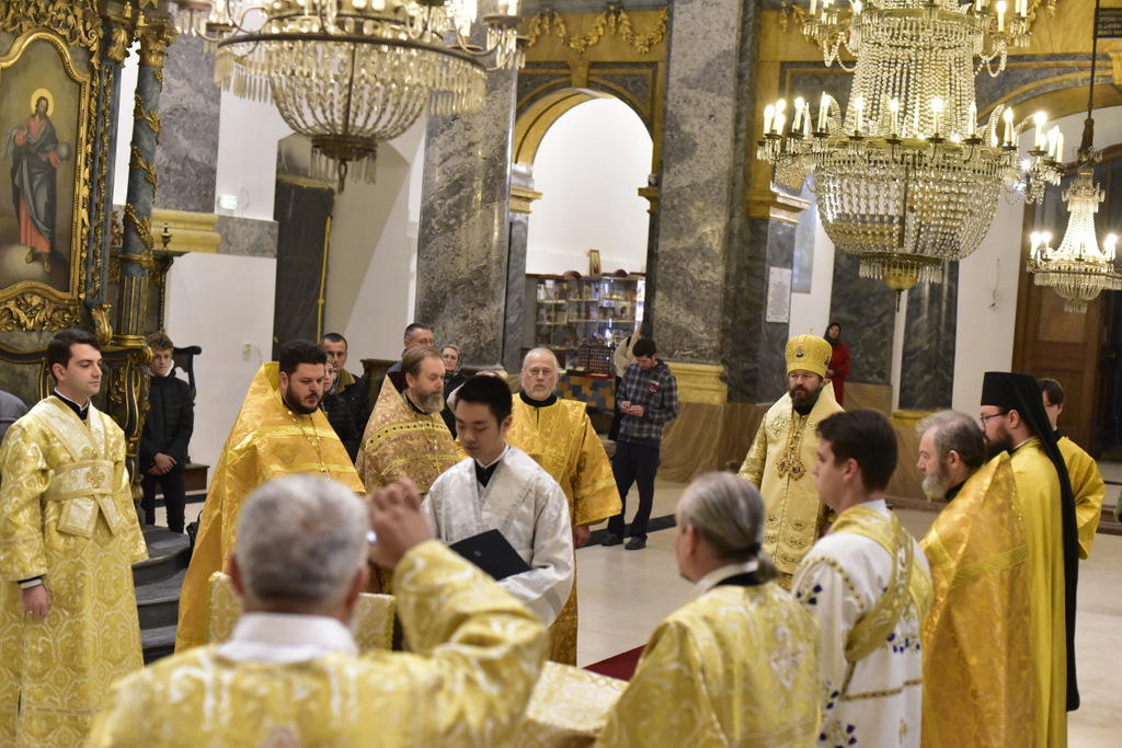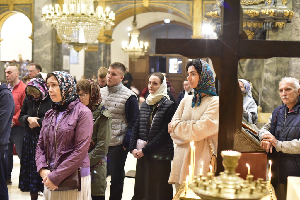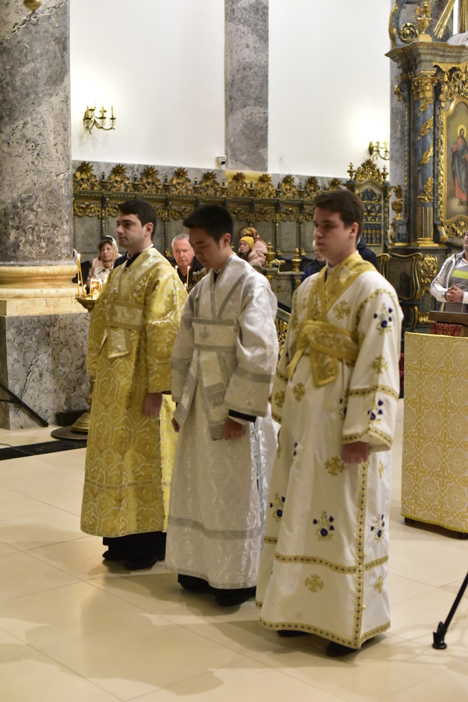В читаемом дьяконом Владимиром Евангелии от Иоанна был представлен рассказ о том, как Господь Иисус Христос находясь на Кресте в смертельных муках вверяет Свою Мать попечению Своего возлюбленного ученика – апостола Иоанна. По прочтении Священного Писания, после сугубой ектеньи предстоятель вознес молитву о восстановлении мира на Украине. В этот день митрополит Будапештский и Венгерский Иларион совершил диаконскую хиротонию иподиакона Вячеслава Ли.