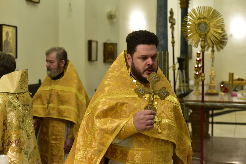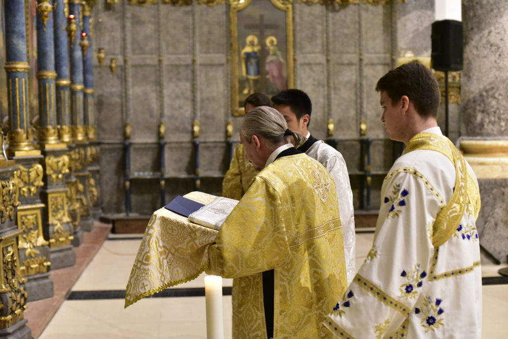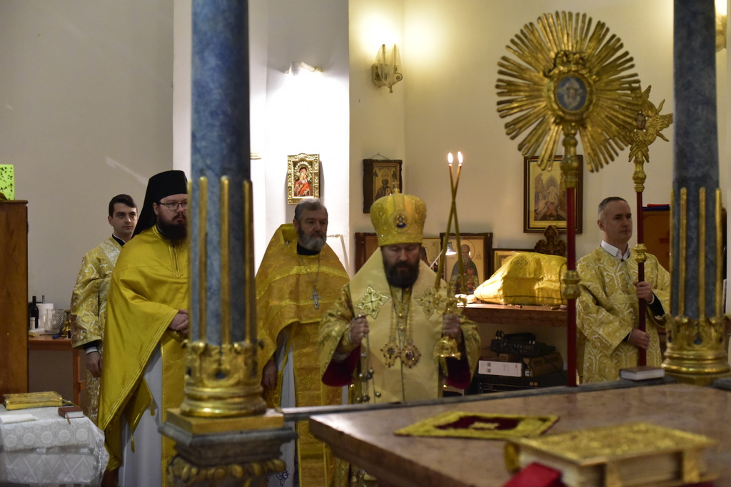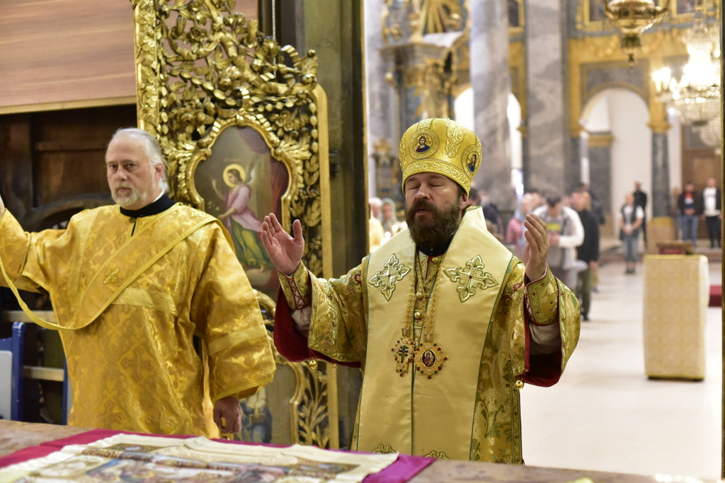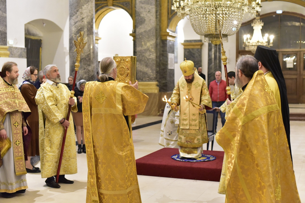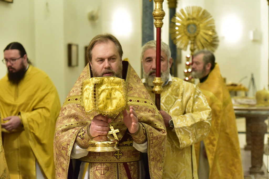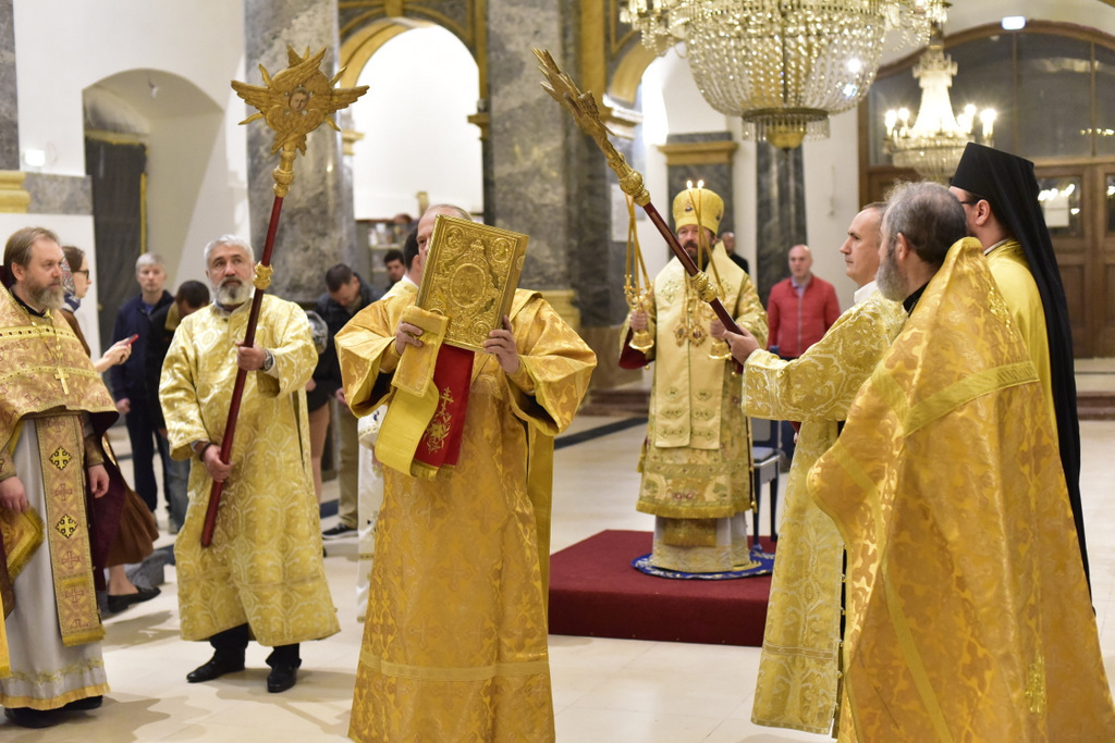 В читаемом дьяконом Владимиром Евангелии от Иоанна был представлен рассказ о том, как Господь Иисус Христос находясь на Кресте в смертельных муках вверяет Свою Мать попечению Своего возлюбленного ученика – апостола Иоанна. По прочтении Священного Писания, после сугубой ектеньи предстоятель вознес молитву о восстановлении мира на Украине. В этот день митрополит Будапештский и Венгерский Иларион совершил диаконскую хиротонию иподиакона Вячеслава Ли.