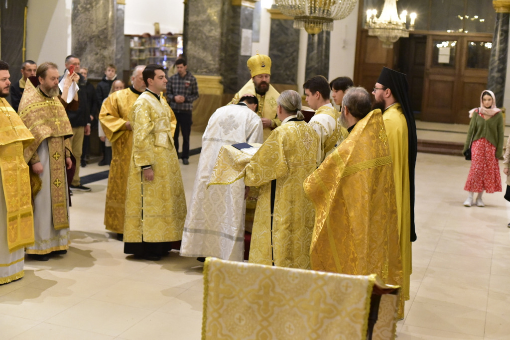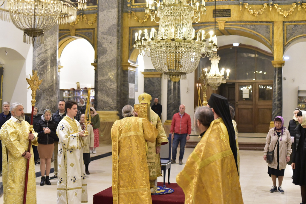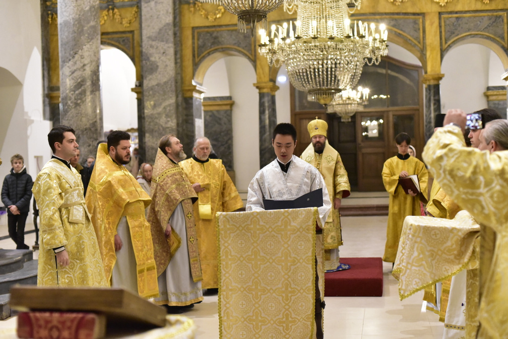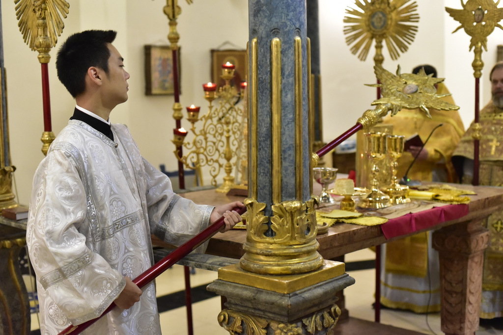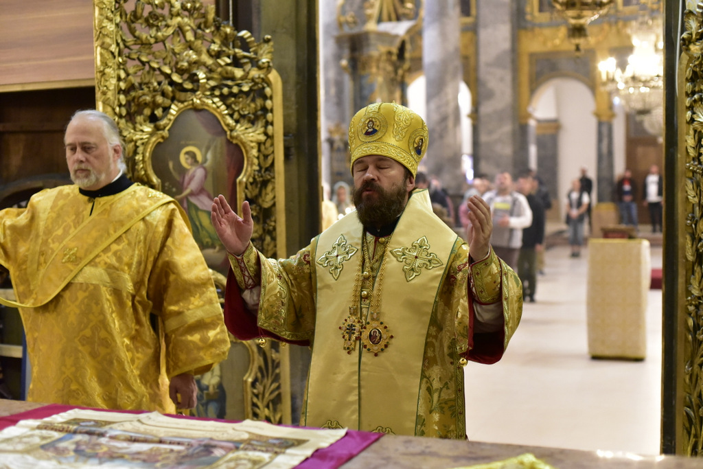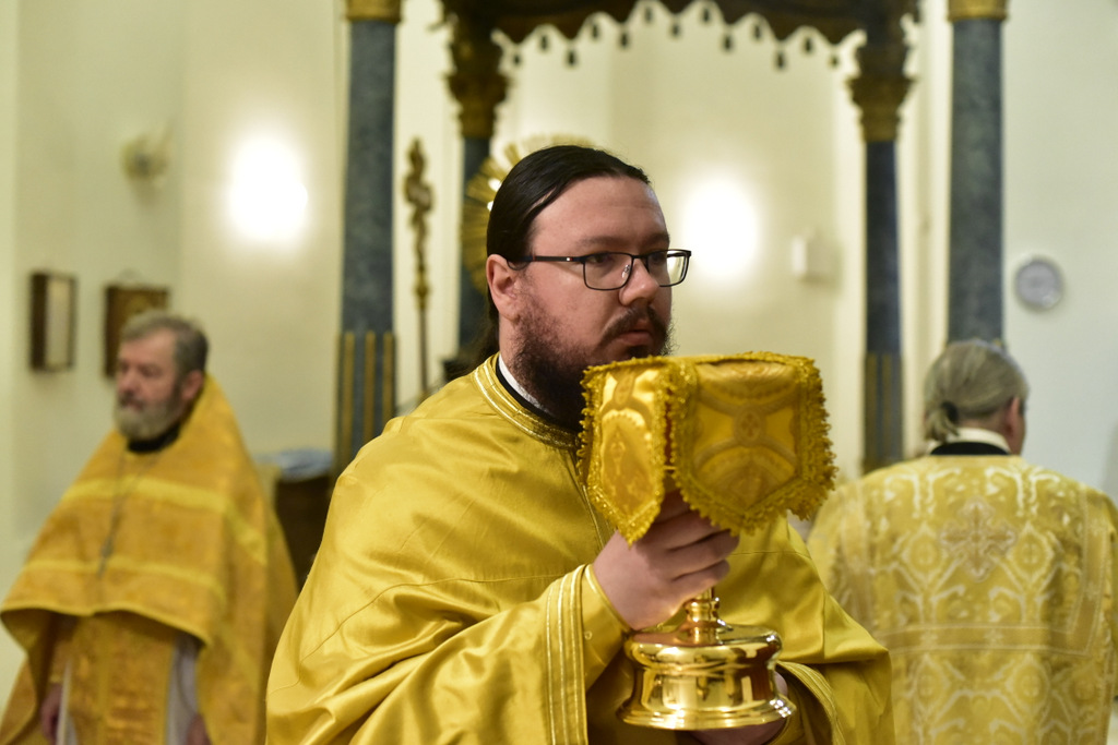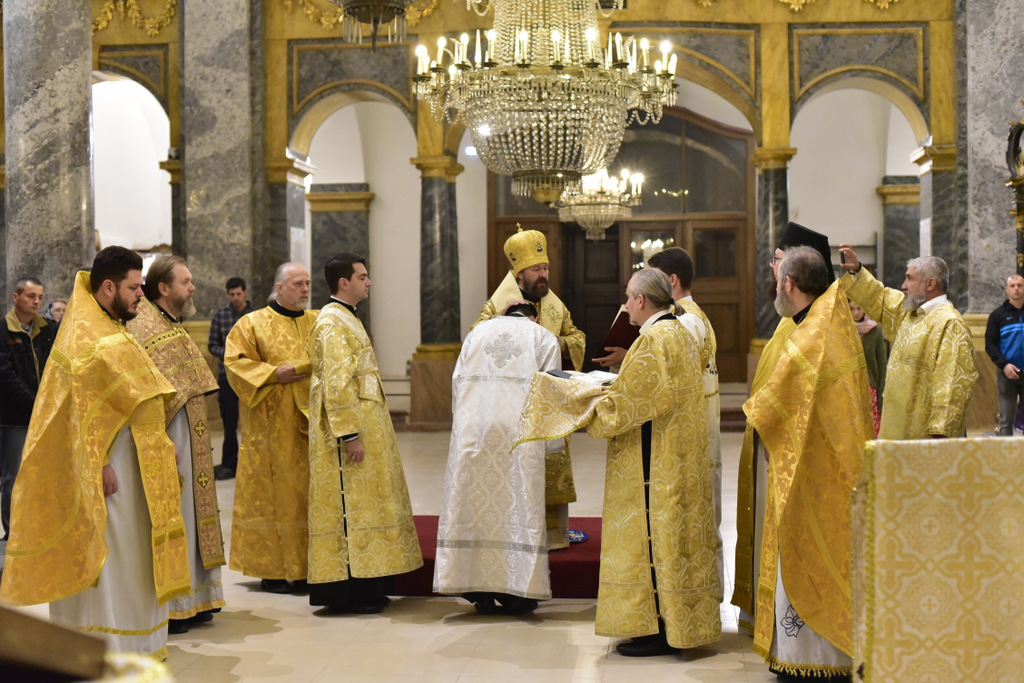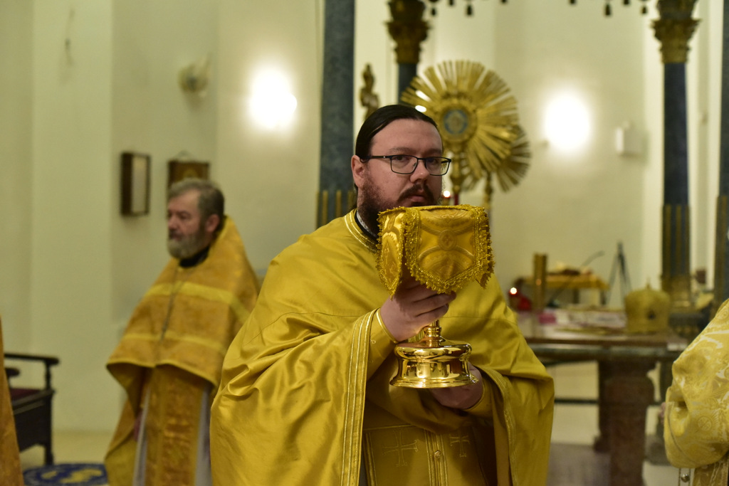 В читаемом дьяконом Владимиром Евангелии от Иоанна был представлен рассказ о том, как Господь Иисус Христос находясь на Кресте в смертельных муках вверяет Свою Мать попечению Своего возлюбленного ученика – апостола Иоанна. По прочтении Священного Писания, после сугубой ектеньи предстоятель вознес молитву о восстановлении мира на Украине. В этот день митрополит Будапештский и Венгерский Иларион совершил диаконскую хиротонию иподиакона Вячеслава Ли.