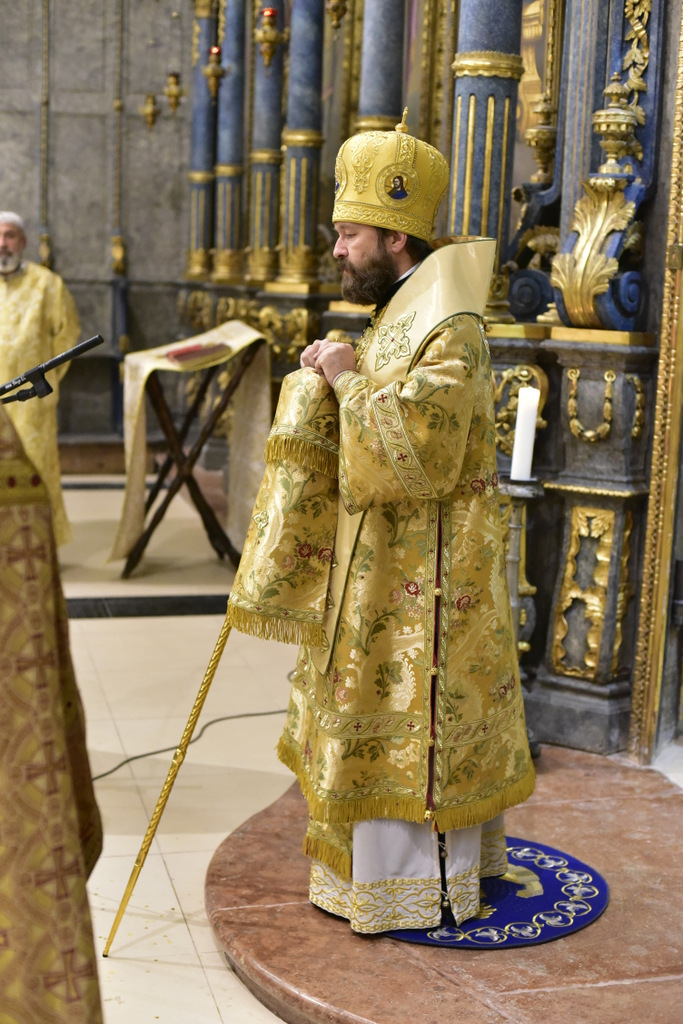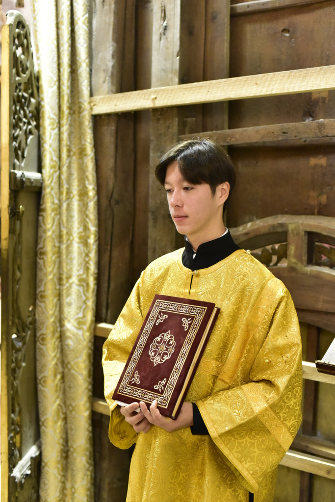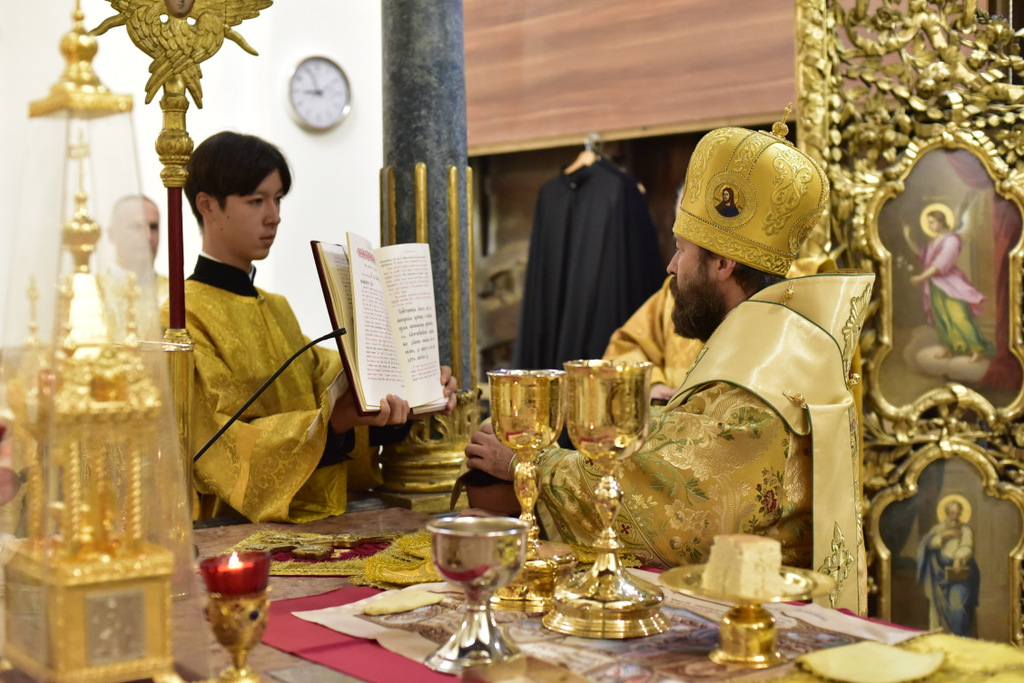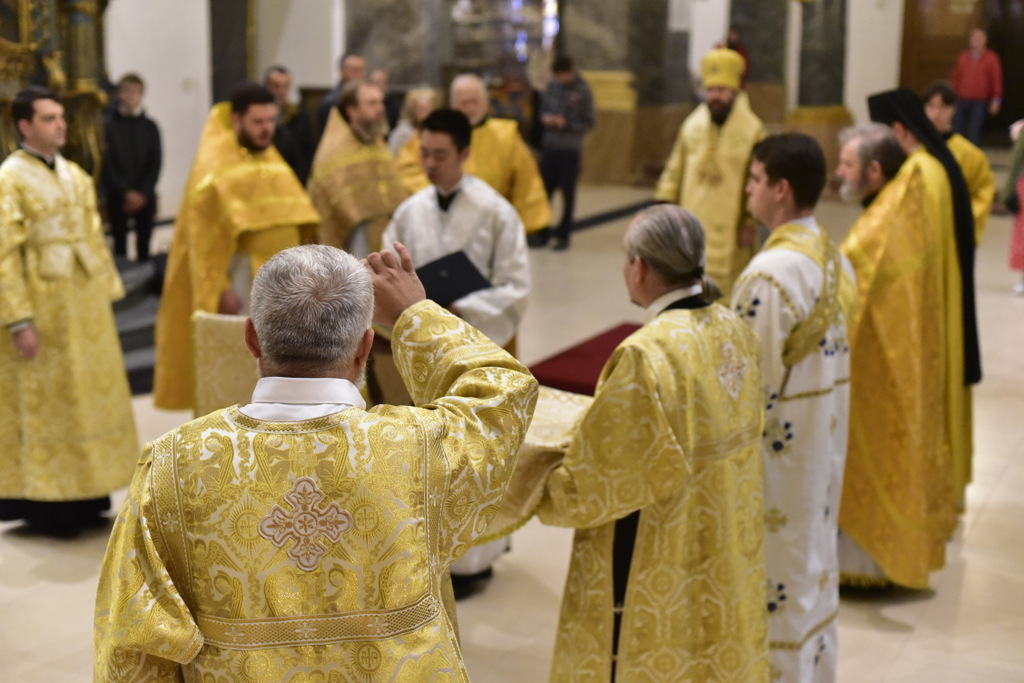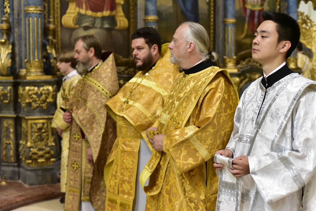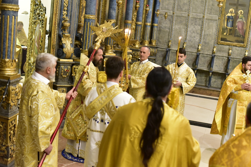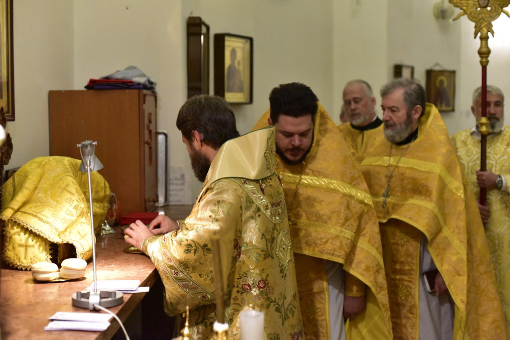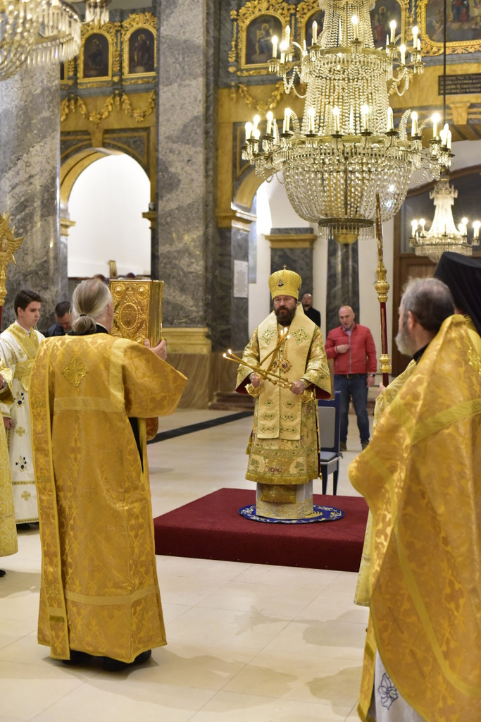 В читаемом дьяконом Владимиром Евангелии от Иоанна был представлен рассказ о том, как Господь Иисус Христос находясь на Кресте в смертельных муках вверяет Свою Мать попечению Своего возлюбленного ученика – апостола Иоанна. По прочтении Священного Писания, после сугубой ектеньи предстоятель вознес молитву о восстановлении мира на Украине. В этот день митрополит Будапештский и Венгерский Иларион совершил диаконскую хиротонию иподиакона Вячеслава Ли.