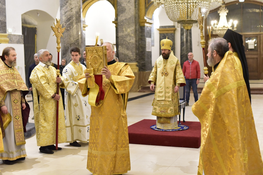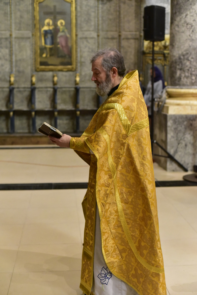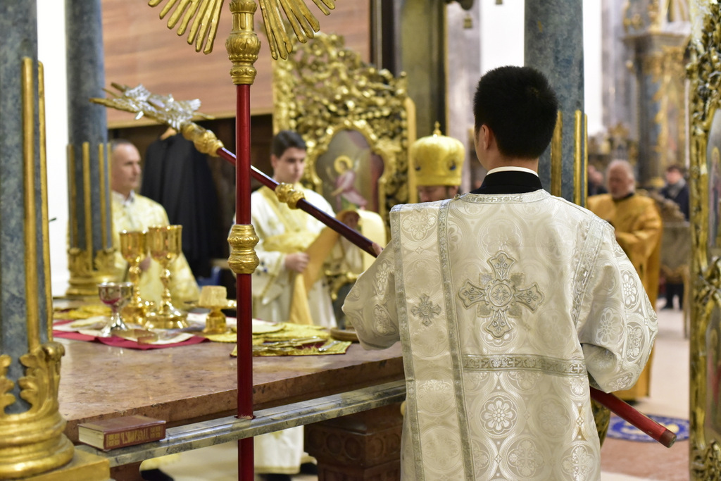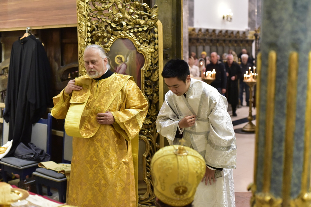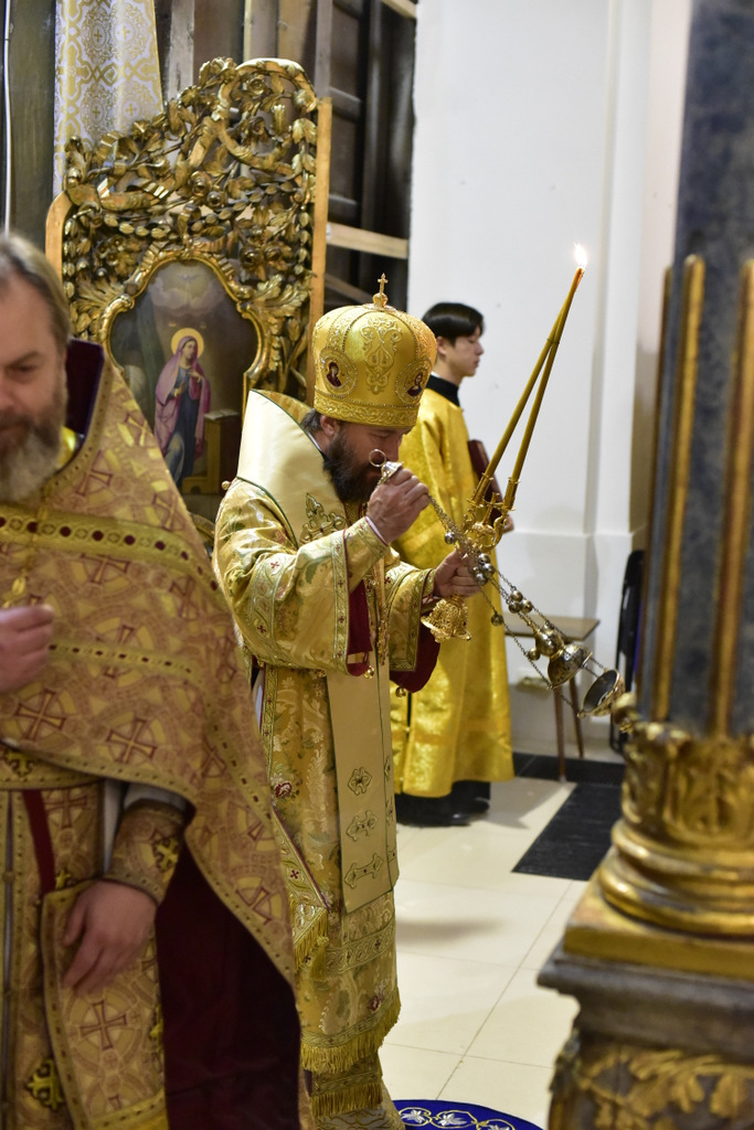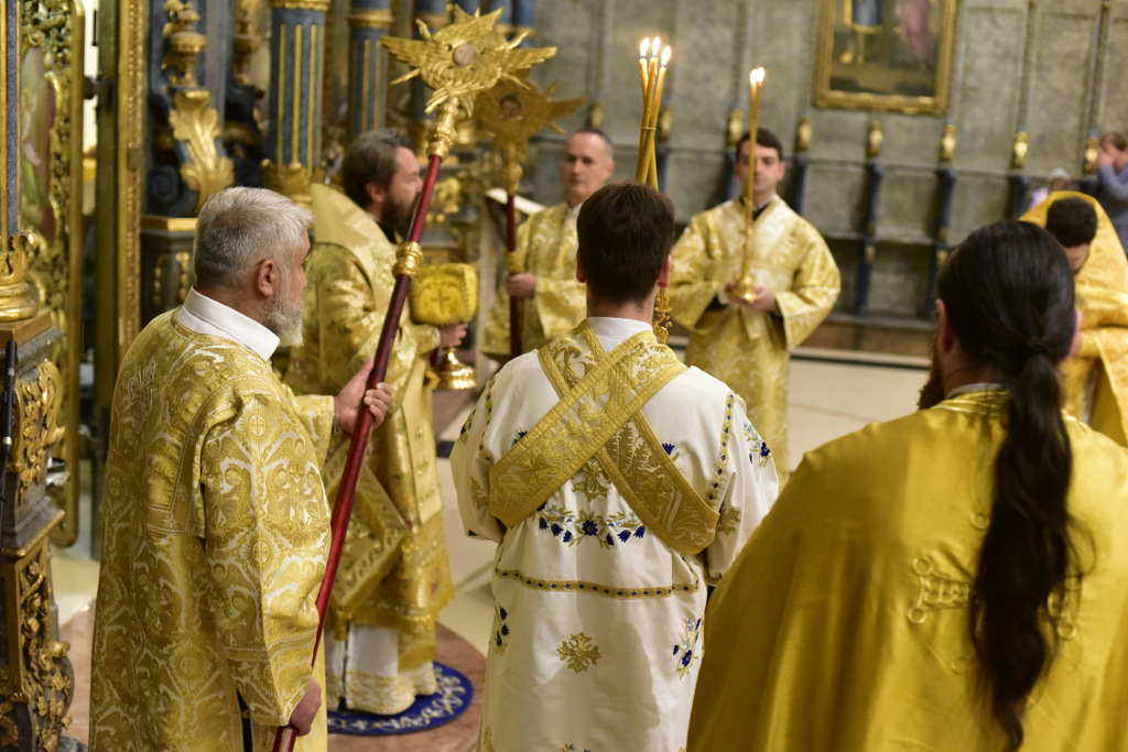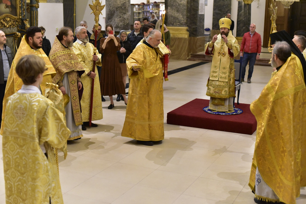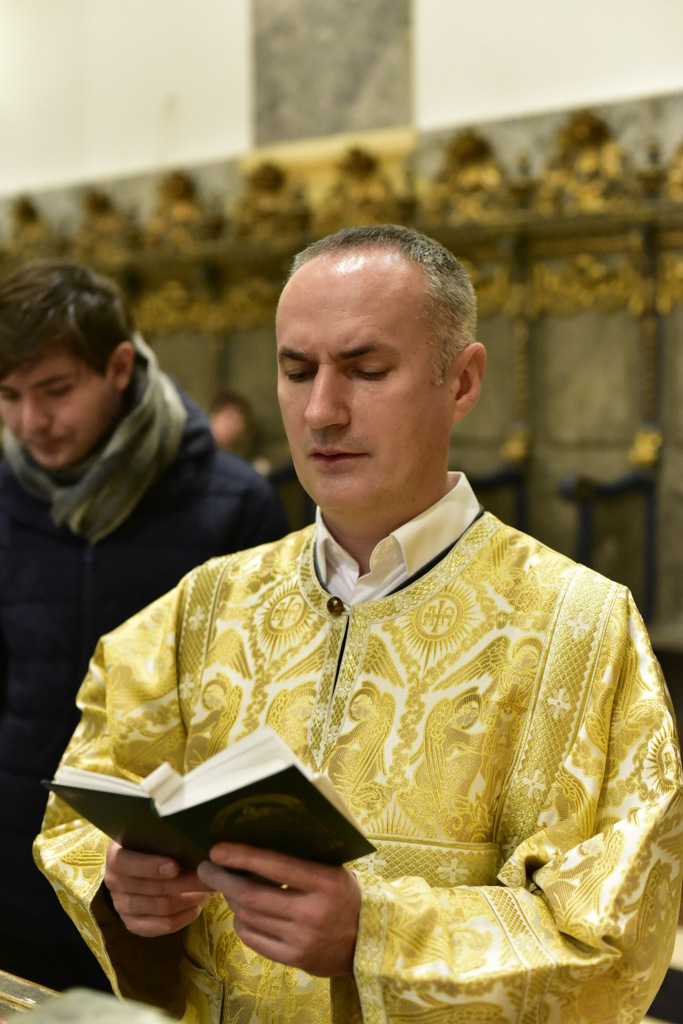 В читаемом дьяконом Владимиром Евангелии от Иоанна был представлен рассказ о том, как Господь Иисус Христос находясь на Кресте в смертельных муках вверяет Свою Мать попечению Своего возлюбленного ученика – апостола Иоанна. По прочтении Священного Писания, после сугубой ектеньи предстоятель вознес молитву о восстановлении мира на Украине. В этот день митрополит Будапештский и Венгерский Иларион совершил диаконскую хиротонию иподиакона Вячеслава Ли.