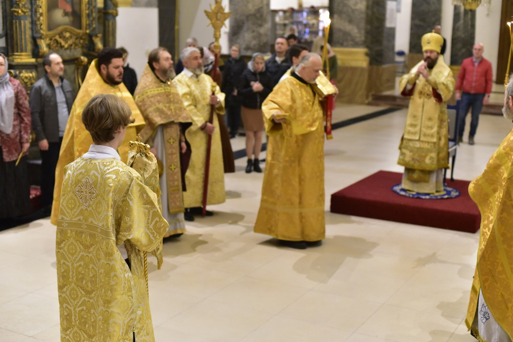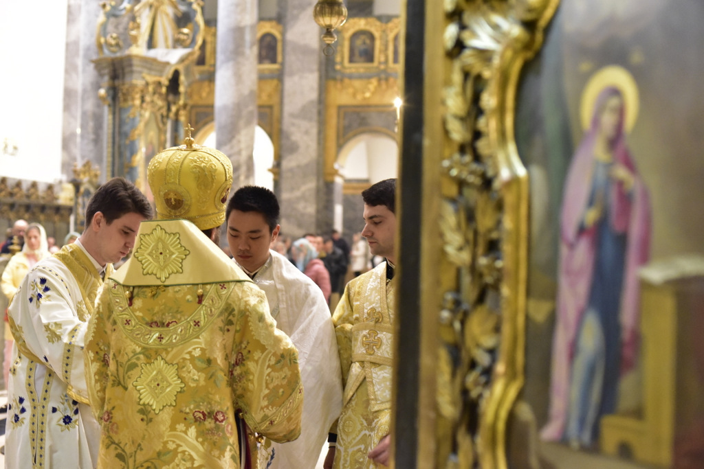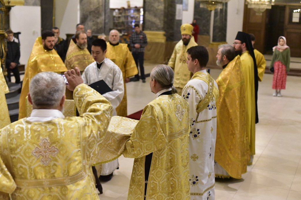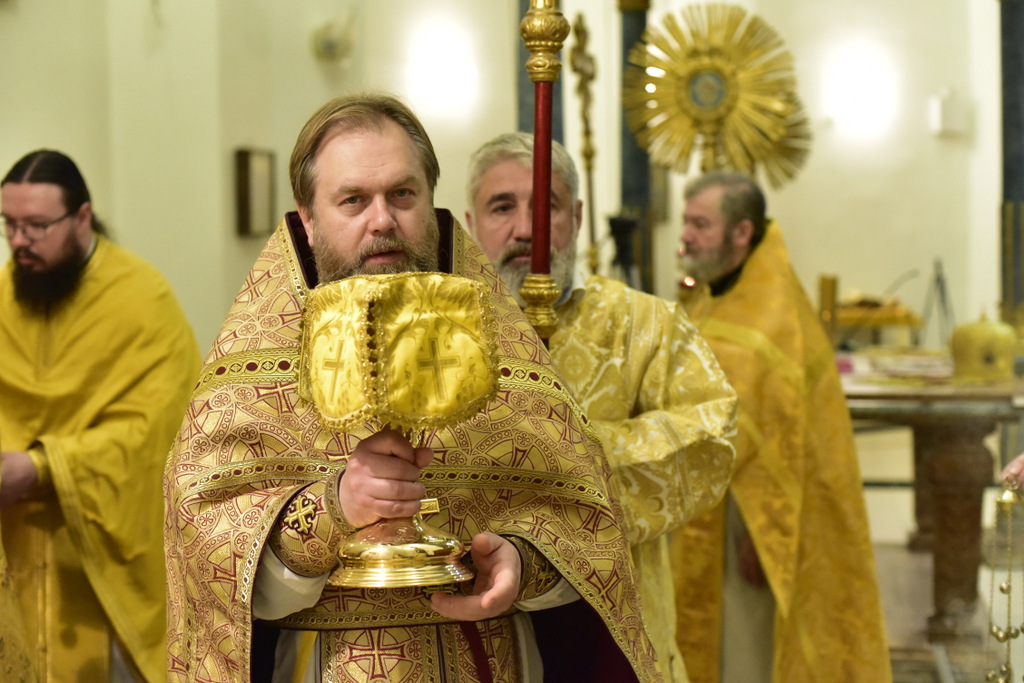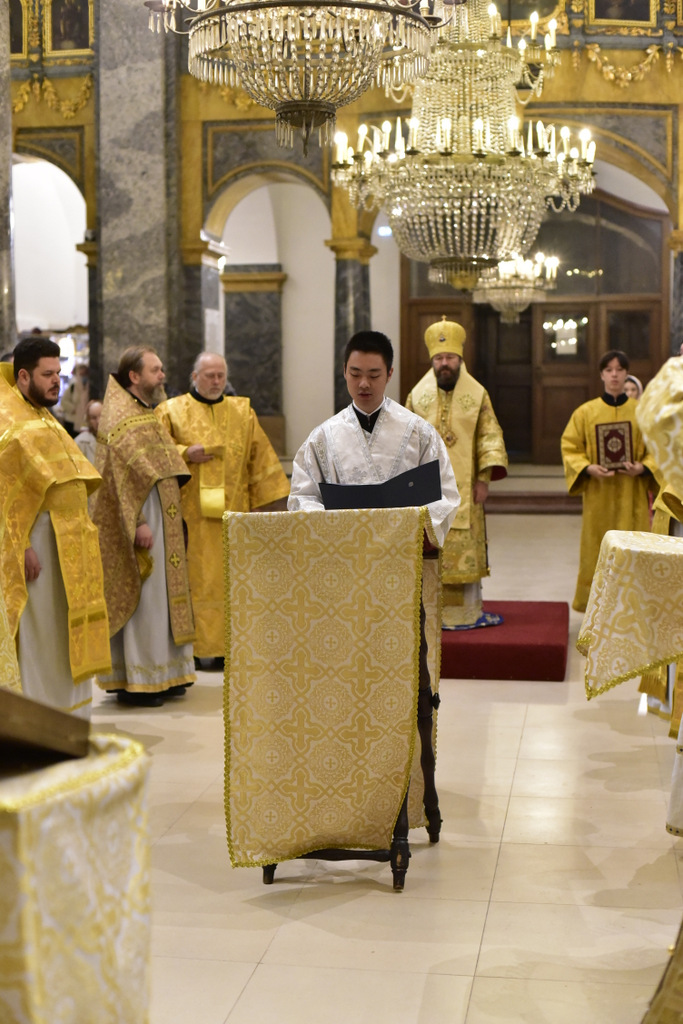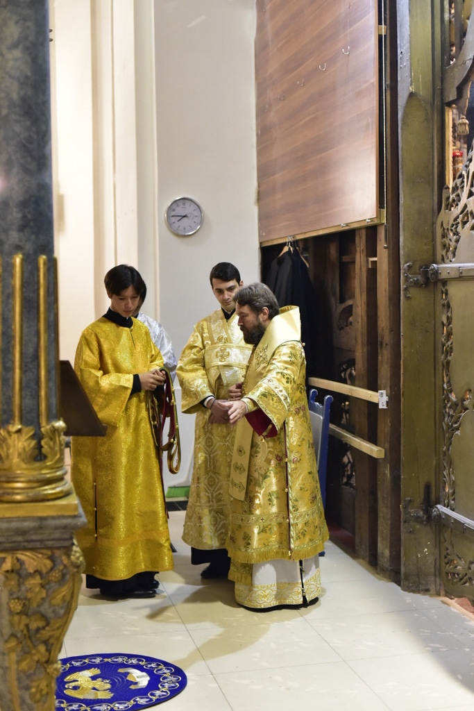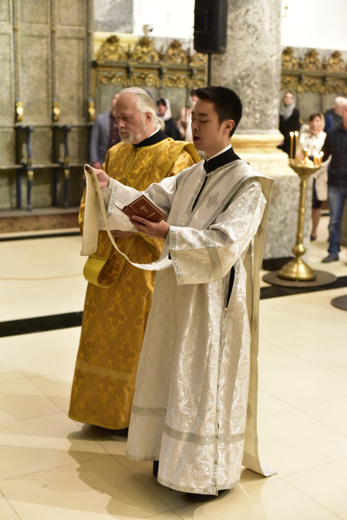 В читаемом дьяконом Владимиром Евангелии от Иоанна был представлен рассказ о том, как Господь Иисус Христос находясь на Кресте в смертельных муках вверяет Свою Мать попечению Своего возлюбленного ученика – апостола Иоанна. По прочтении Священного Писания, после сугубой ектеньи предстоятель вознес молитву о восстановлении мира на Украине. В этот день митрополит Будапештский и Венгерский Иларион совершил диаконскую хиротонию иподиакона Вячеслава Ли.