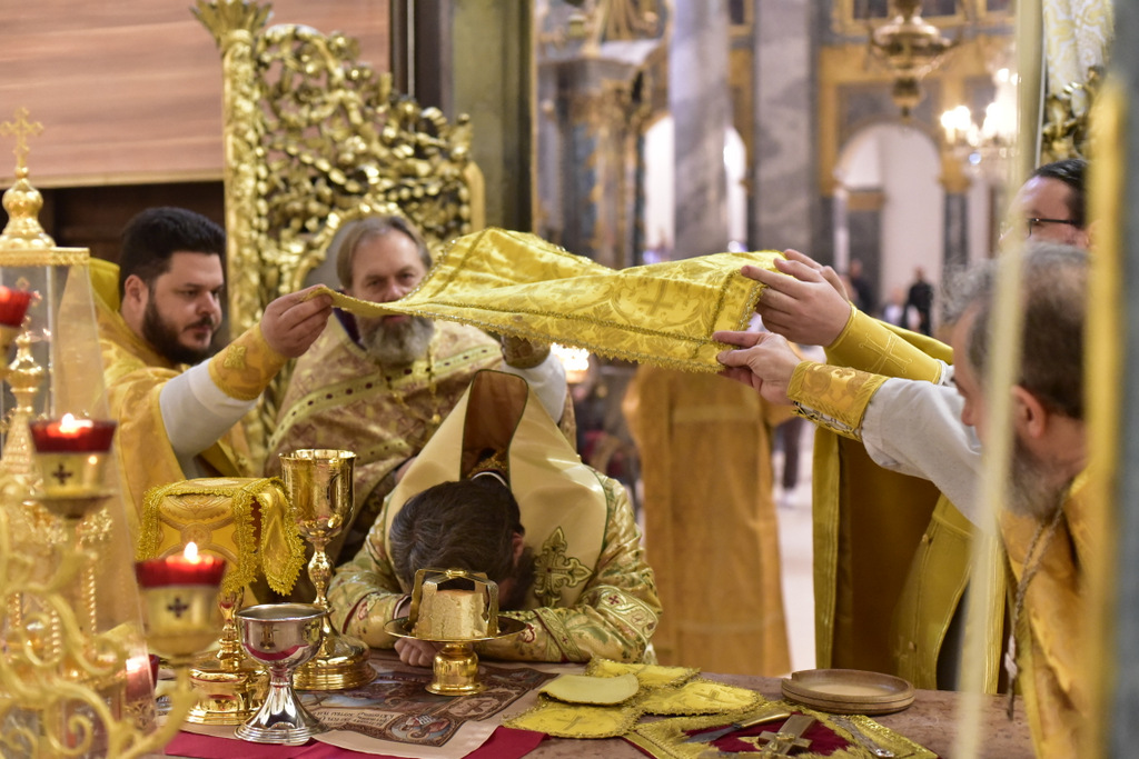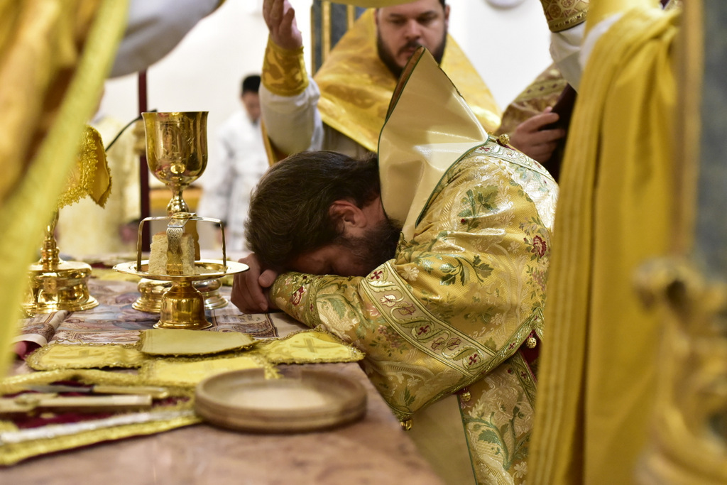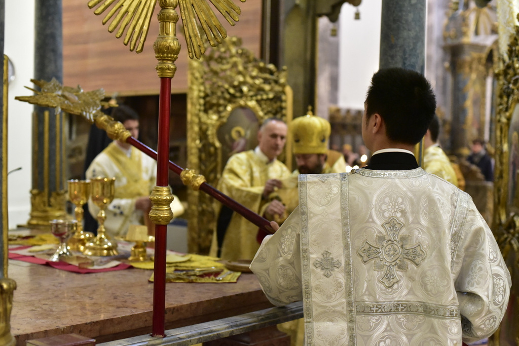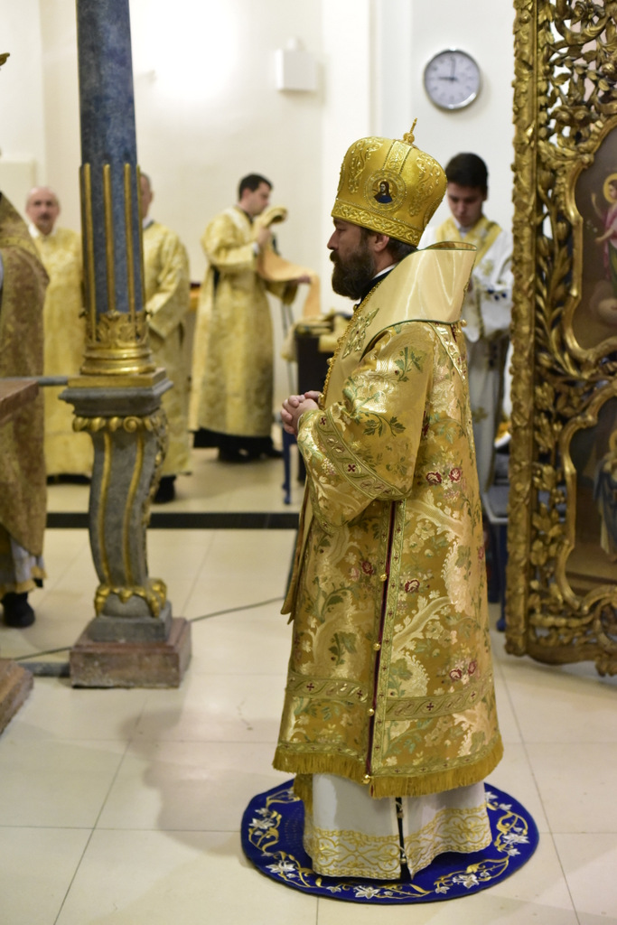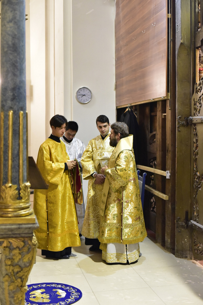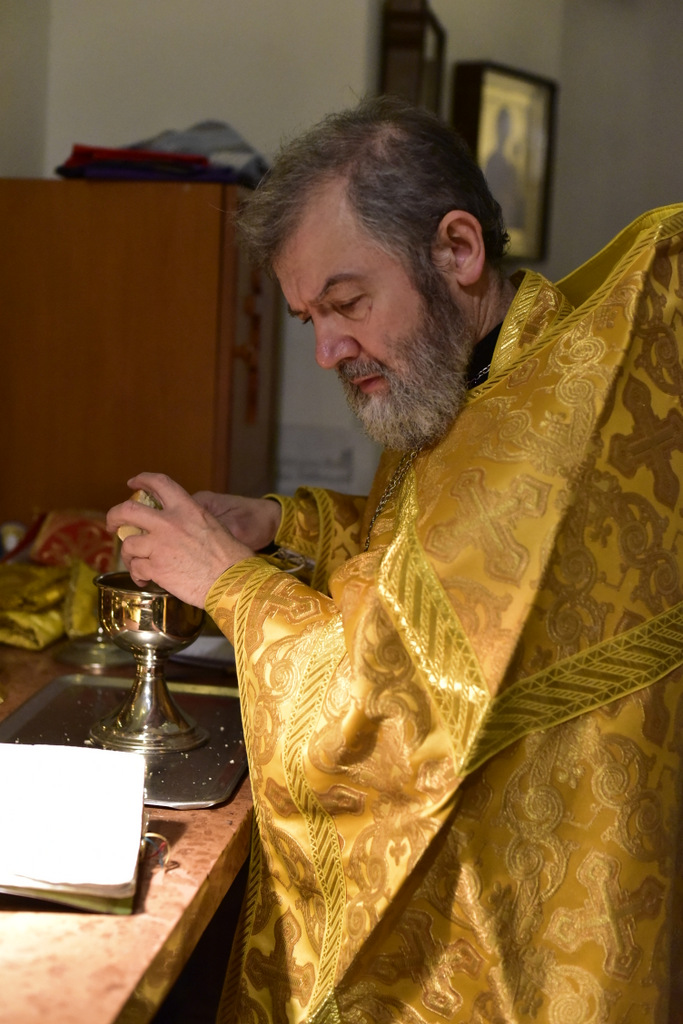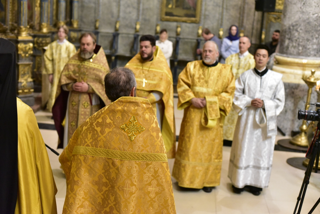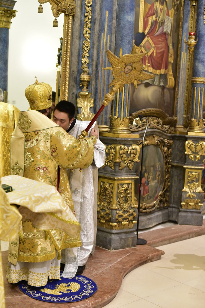 В читаемом дьяконом Владимиром Евангелии от Иоанна был представлен рассказ о том, как Господь Иисус Христос находясь на Кресте в смертельных муках вверяет Свою Мать попечению Своего возлюбленного ученика – апостола Иоанна. По прочтении Священного Писания, после сугубой ектеньи предстоятель вознес молитву о восстановлении мира на Украине. В этот день митрополит Будапештский и Венгерский Иларион совершил диаконскую хиротонию иподиакона Вячеслава Ли.
