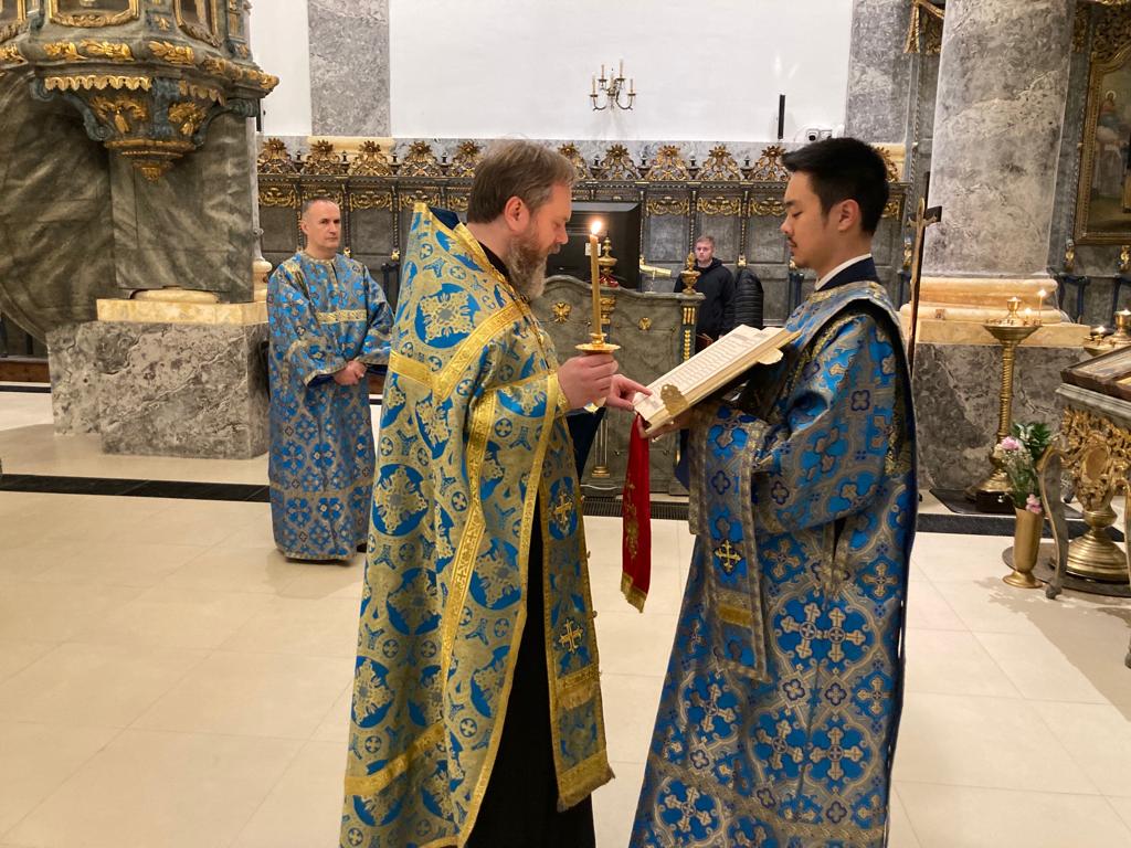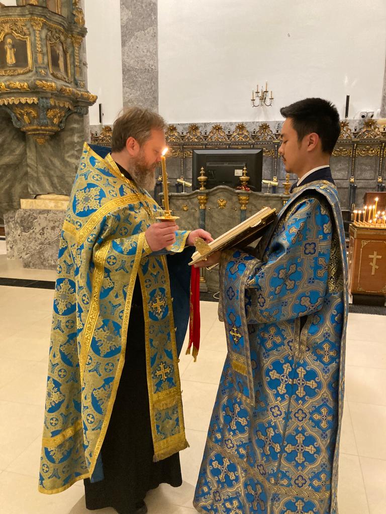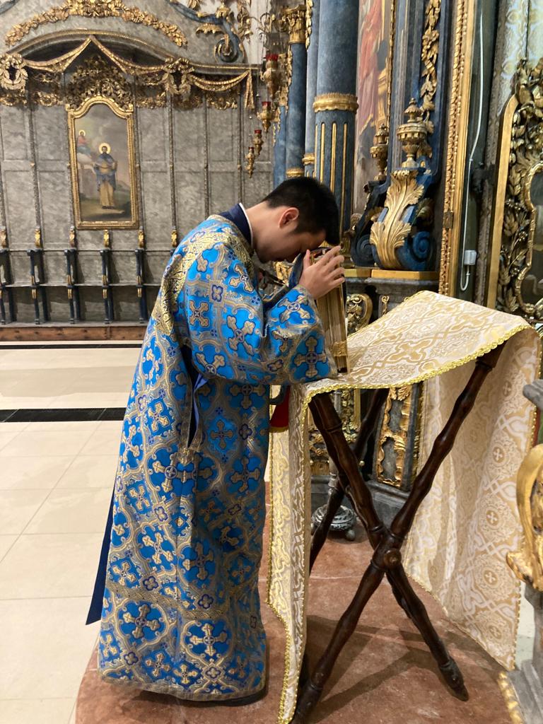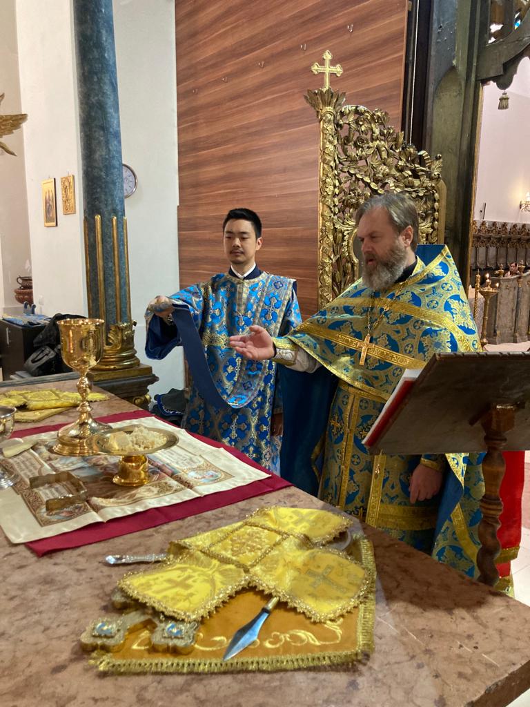 В Евангельском фрагменте, прочитанном дьяконом Вячеславом Ли, был представлен рассказ апостола Луки о двух сестрах – Марфе и Марии, принявших в своем доме Господа Иисуса Христа. Евангельское благовестие, традиционно читаемое в Богородичные праздники, указало на то, как оба образа жизни этих сестер – деятельной и молитвенной созерцательности – совместила в Себе Пречистая Божия Матерь.