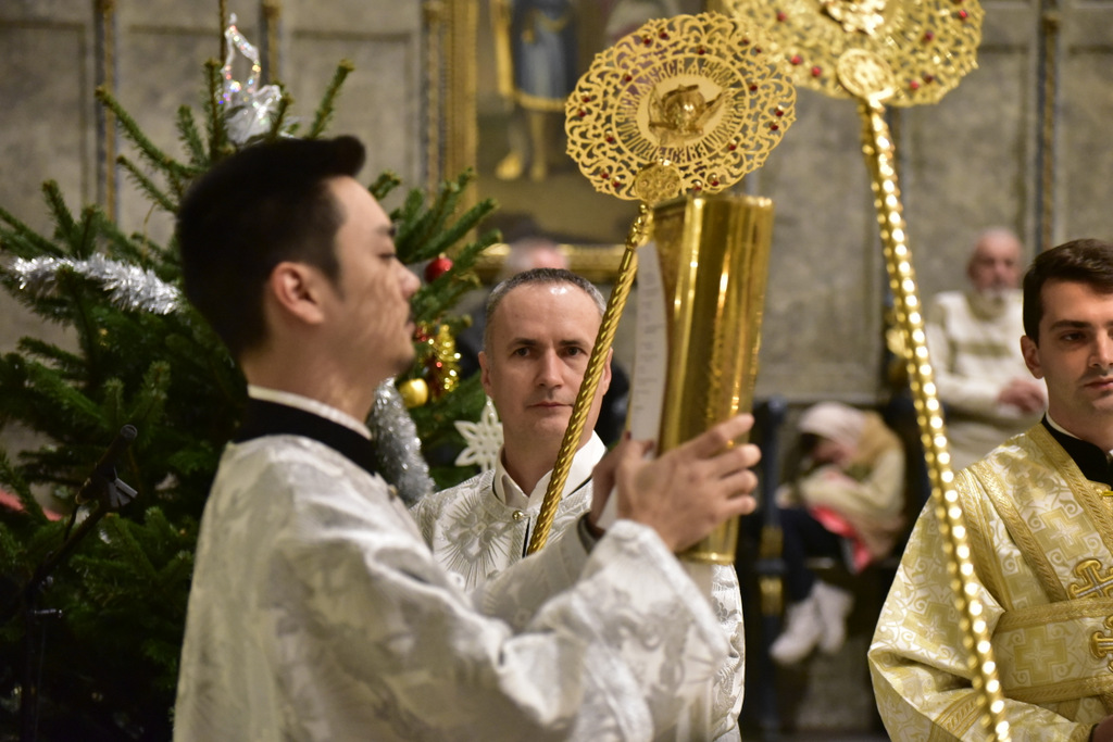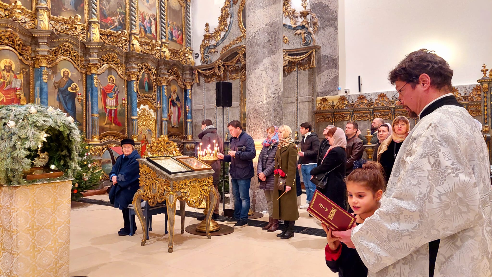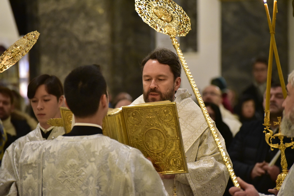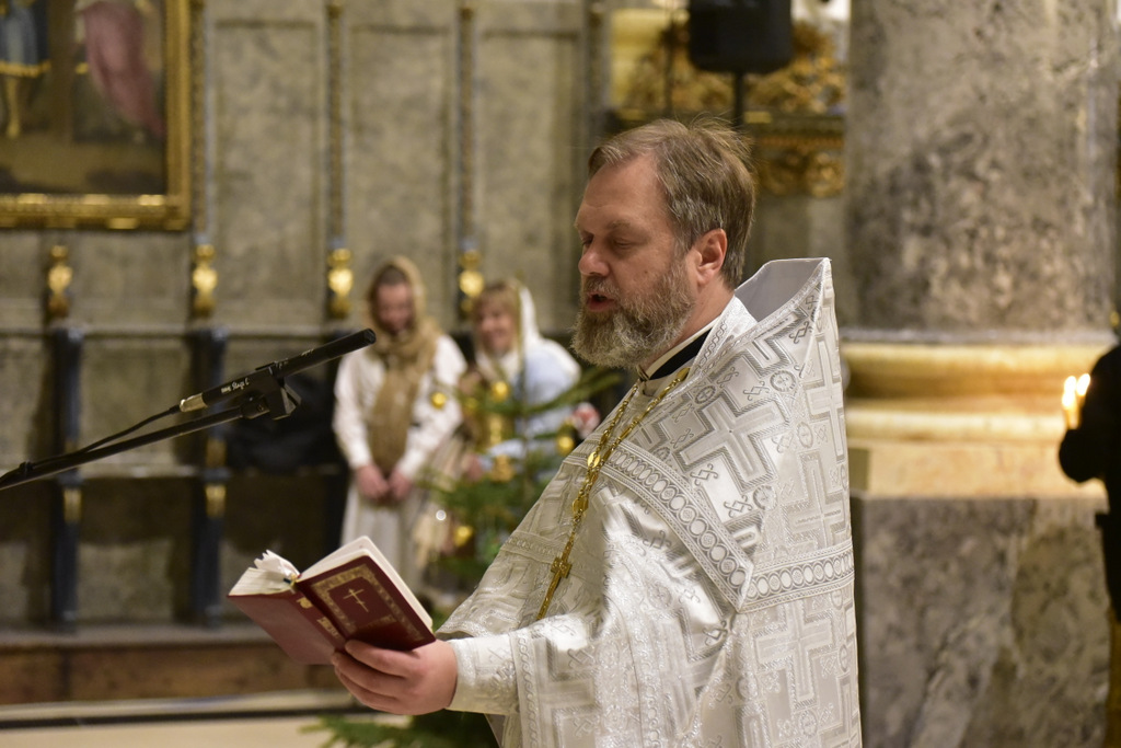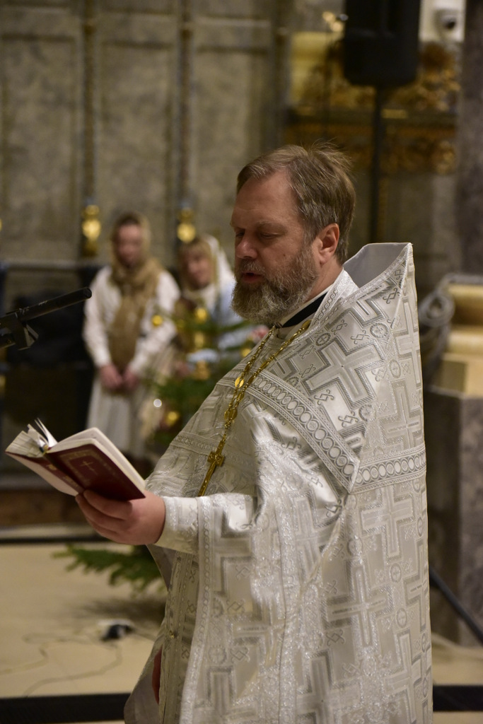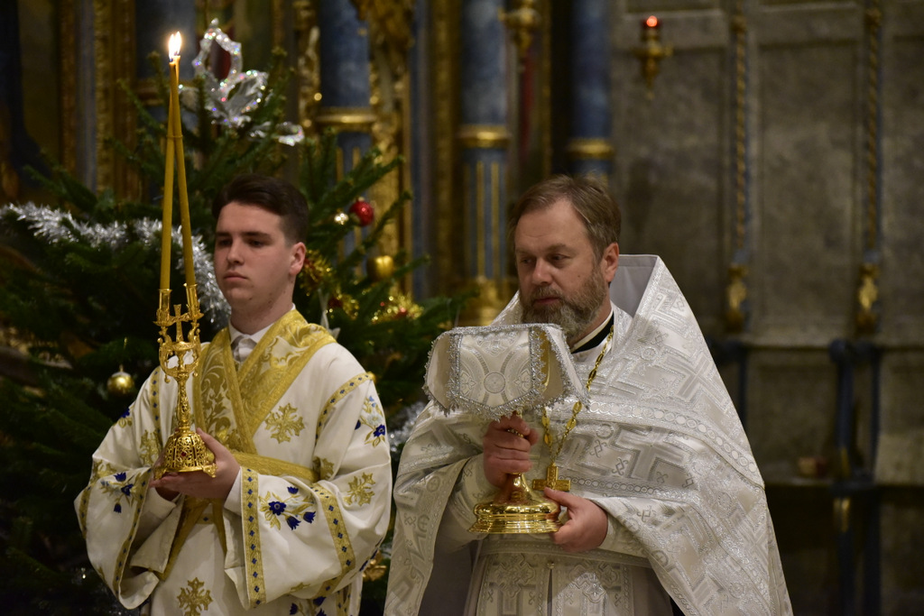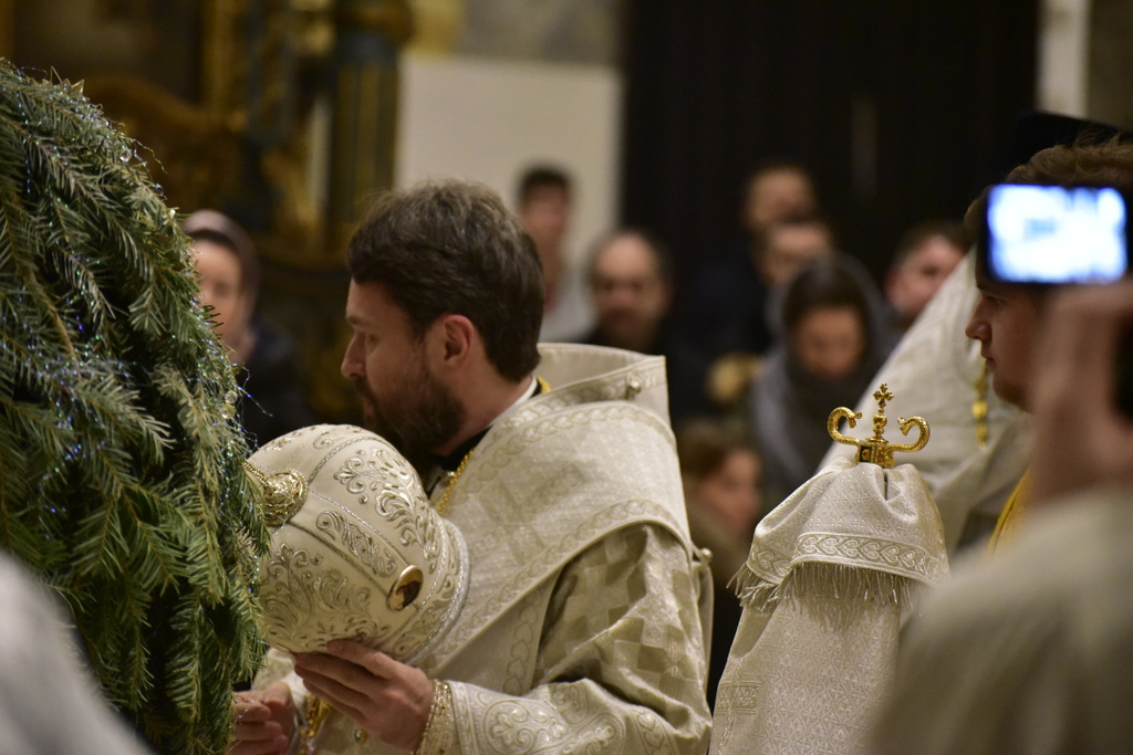 Перед выносом Святых Даров было прочитано Рождественское приветствие Святейшего Патриарха Московского и всея Руси Кирилла, содержащее сердечные поздравления с великим, радостным и мироспасительным праздником Рождества Христова.