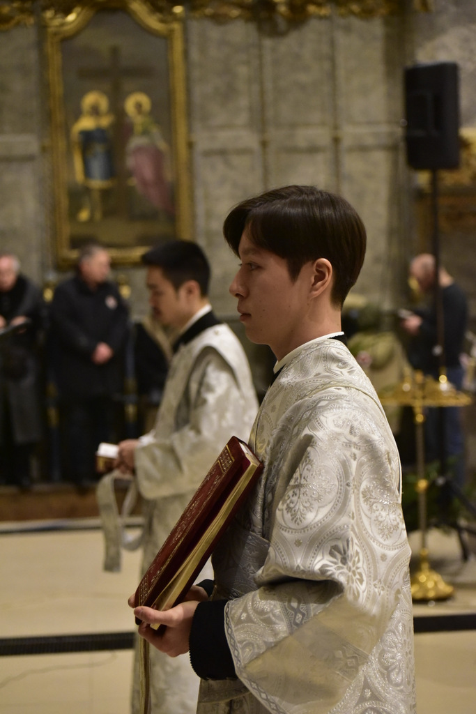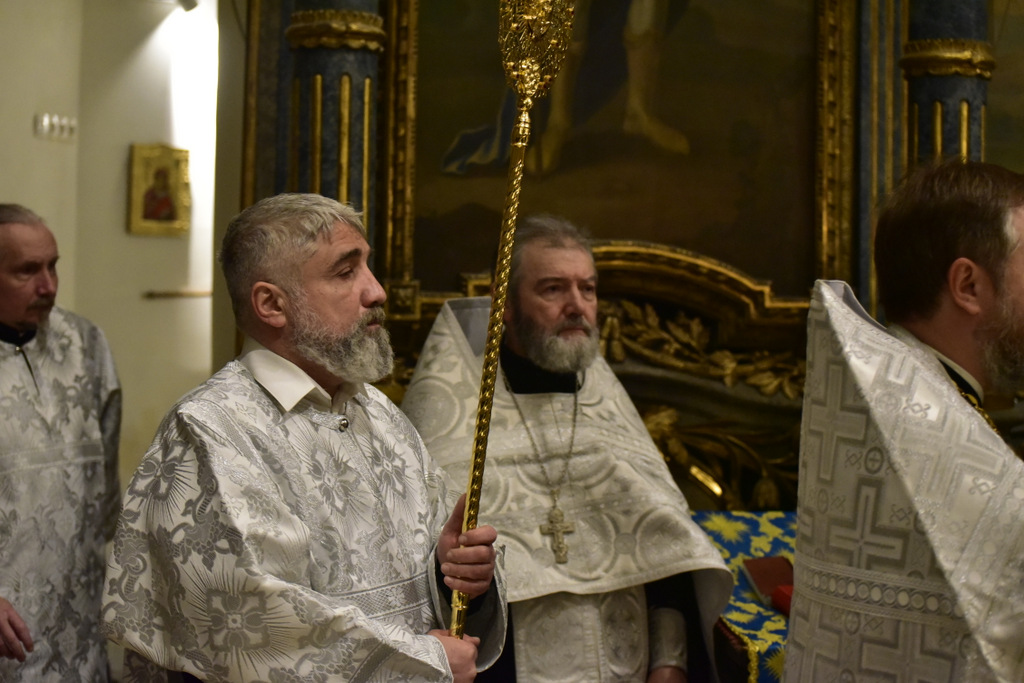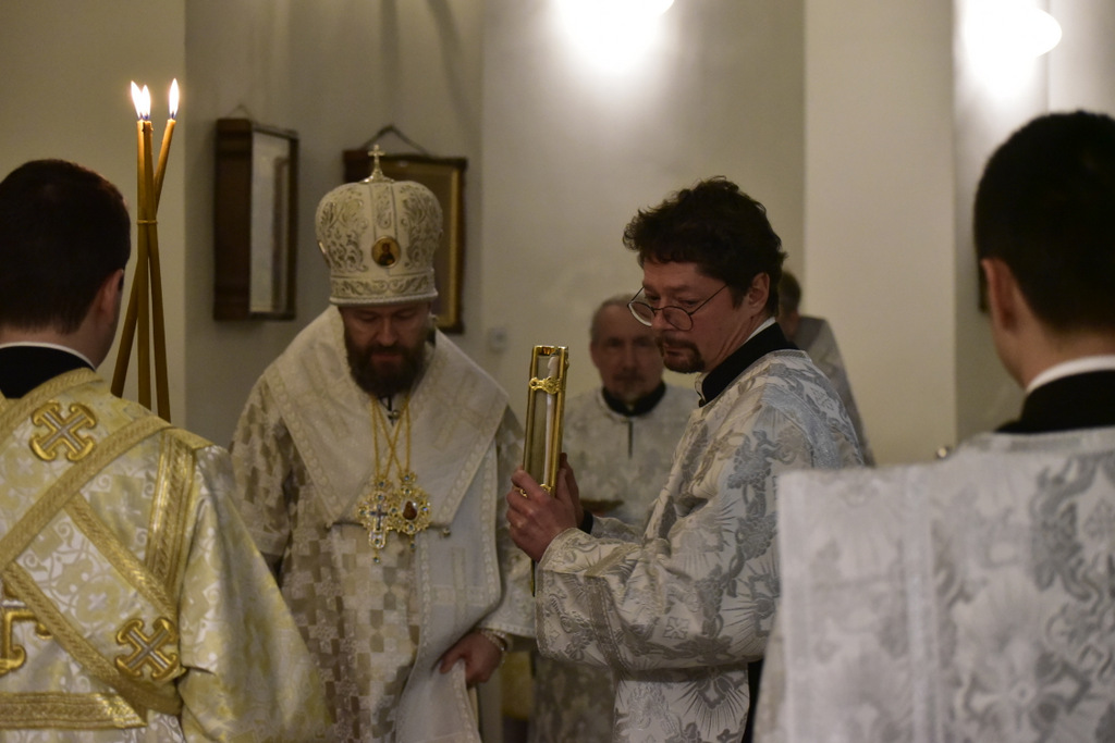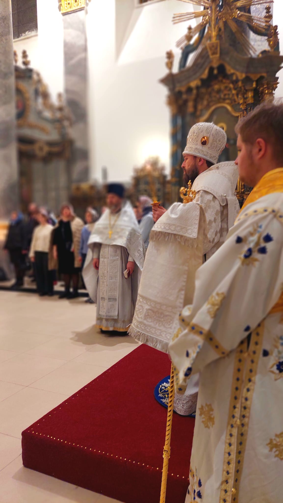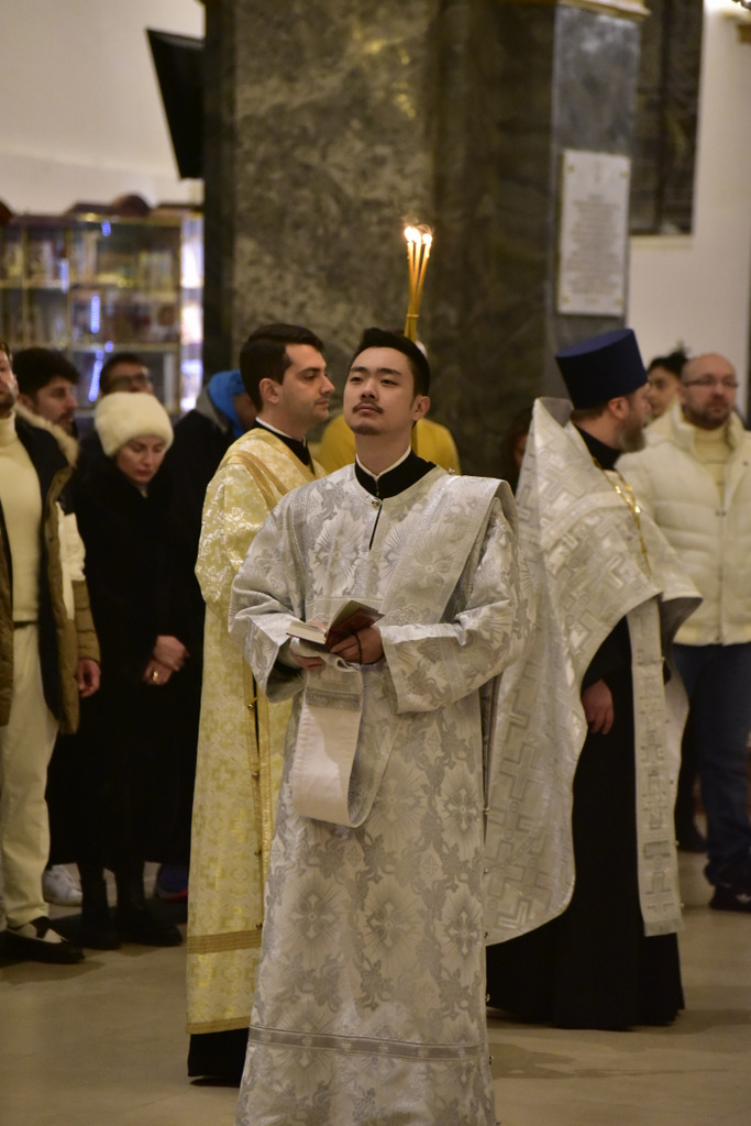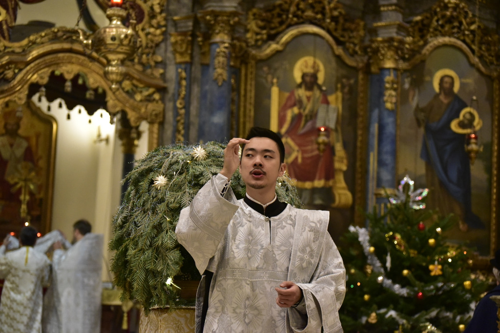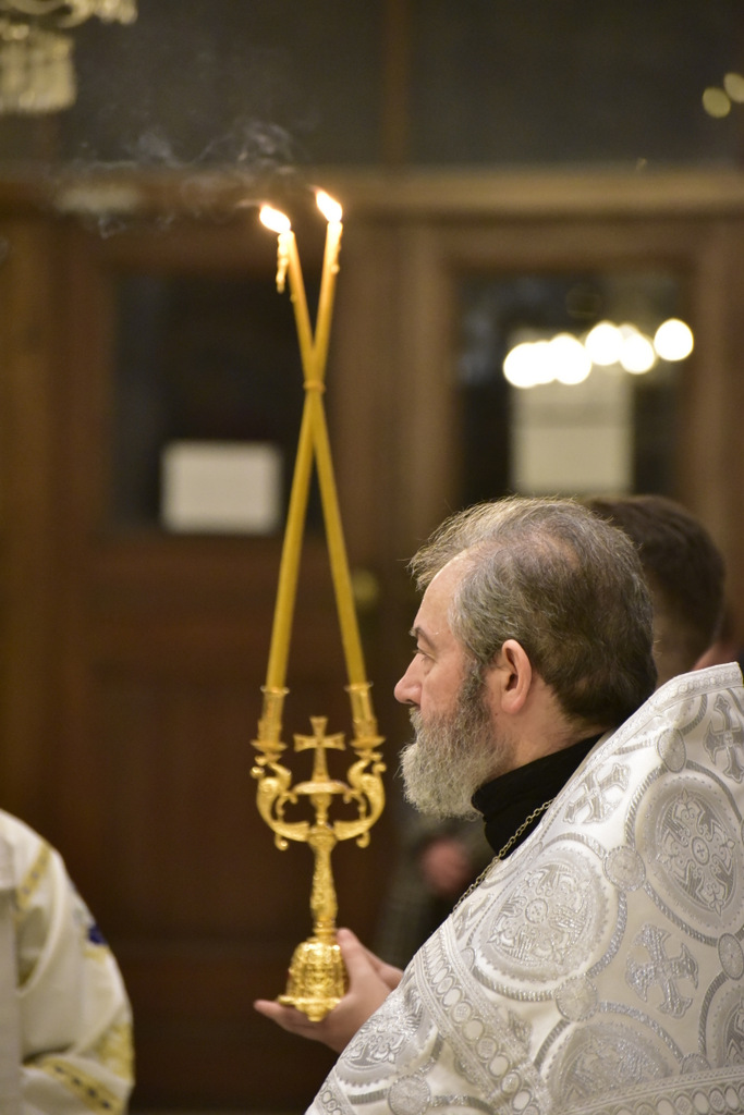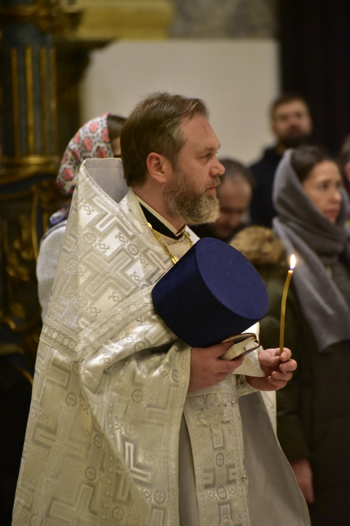 Перед выносом Святых Даров было прочитано Рождественское приветствие Святейшего Патриарха Московского и всея Руси Кирилла, содержащее сердечные поздравления с великим, радостным и мироспасительным праздником Рождества Христова.