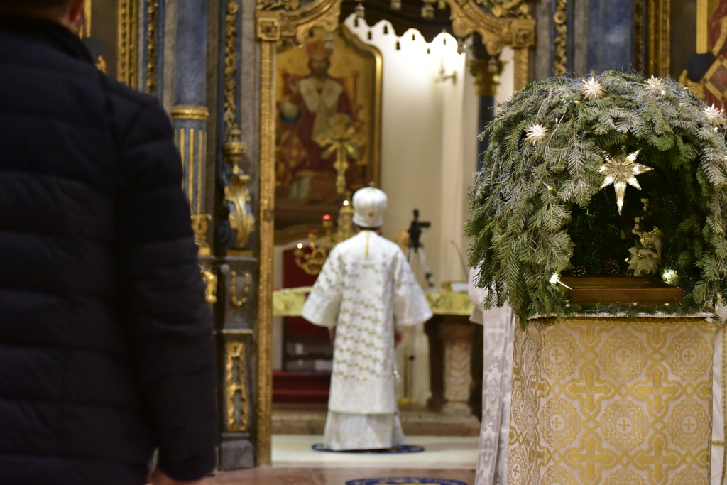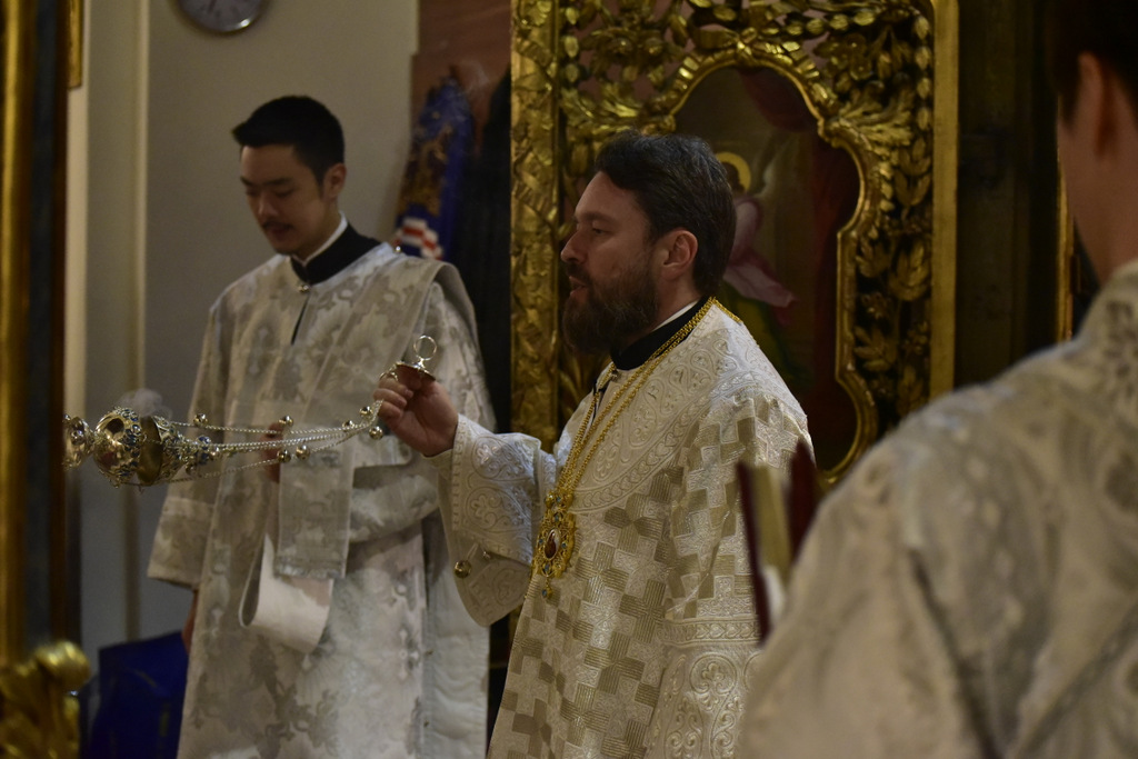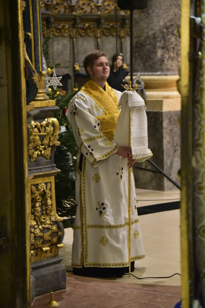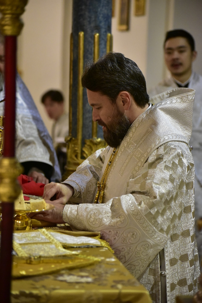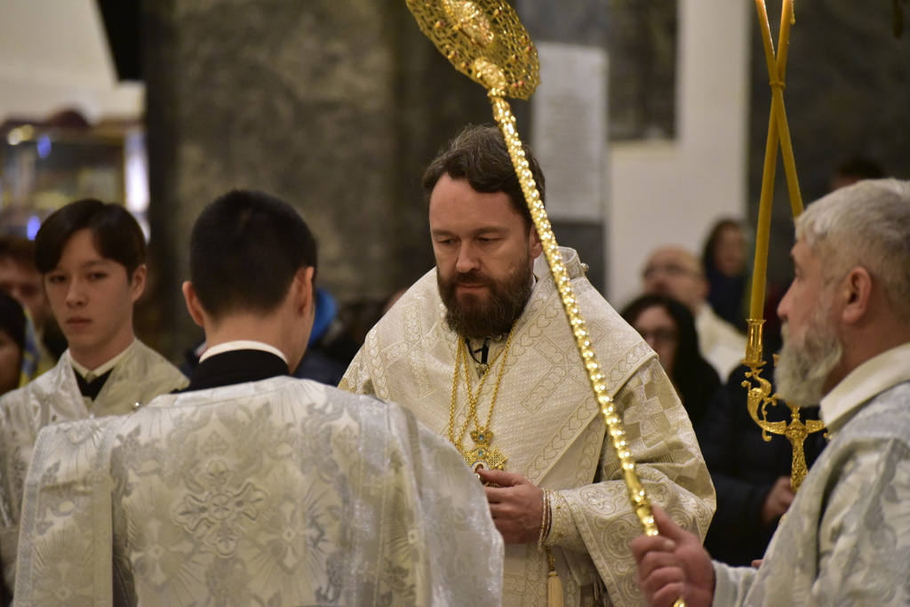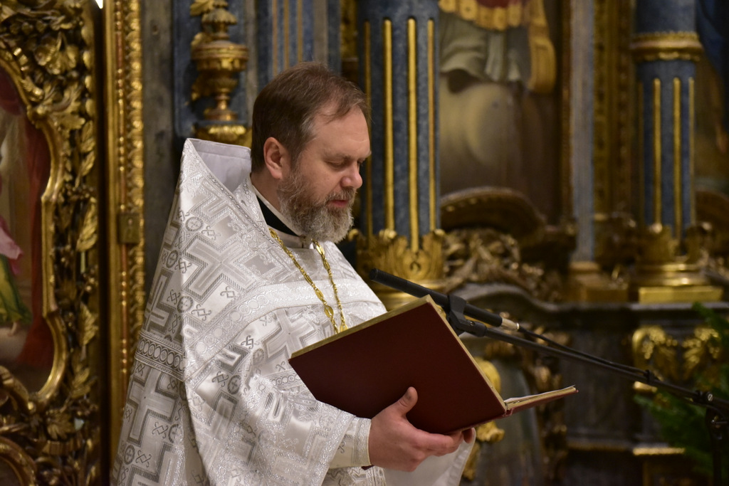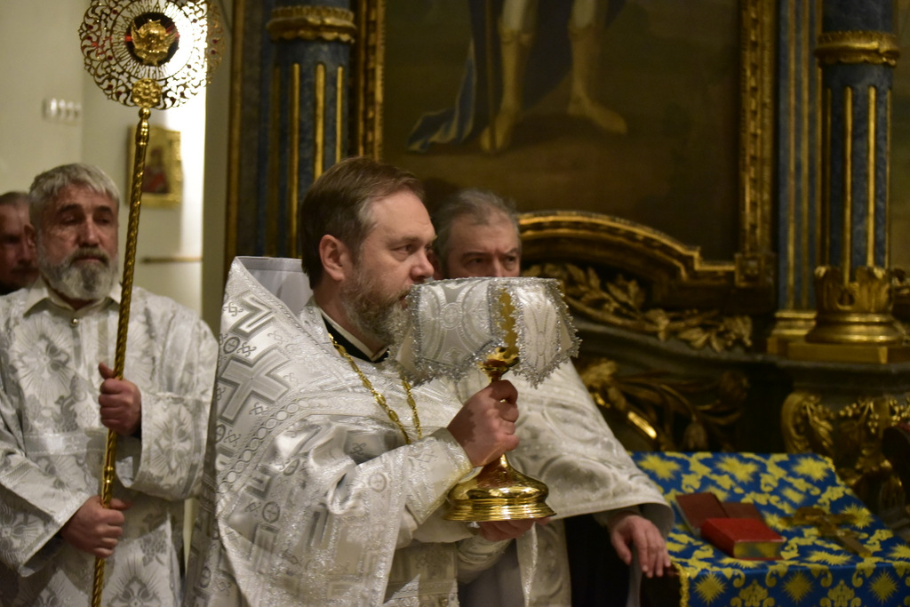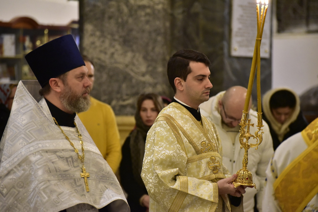 Перед выносом Святых Даров было прочитано Рождественское приветствие Святейшего Патриарха Московского и всея Руси Кирилла, содержащее сердечные поздравления с великим, радостным и мироспасительным праздником Рождества Христова.