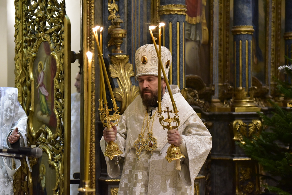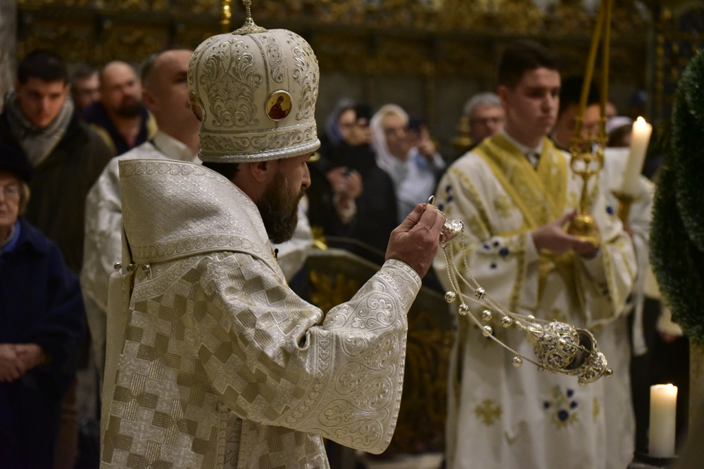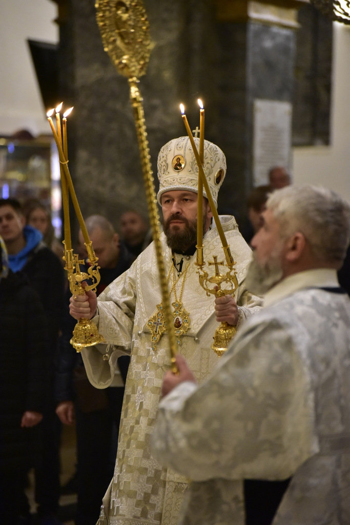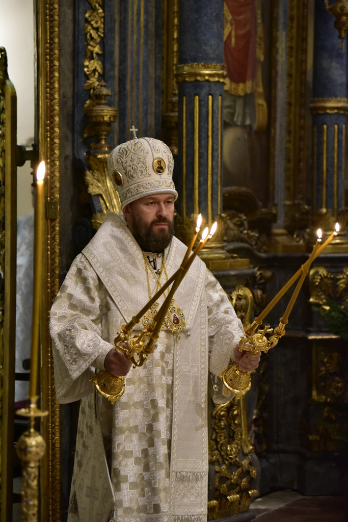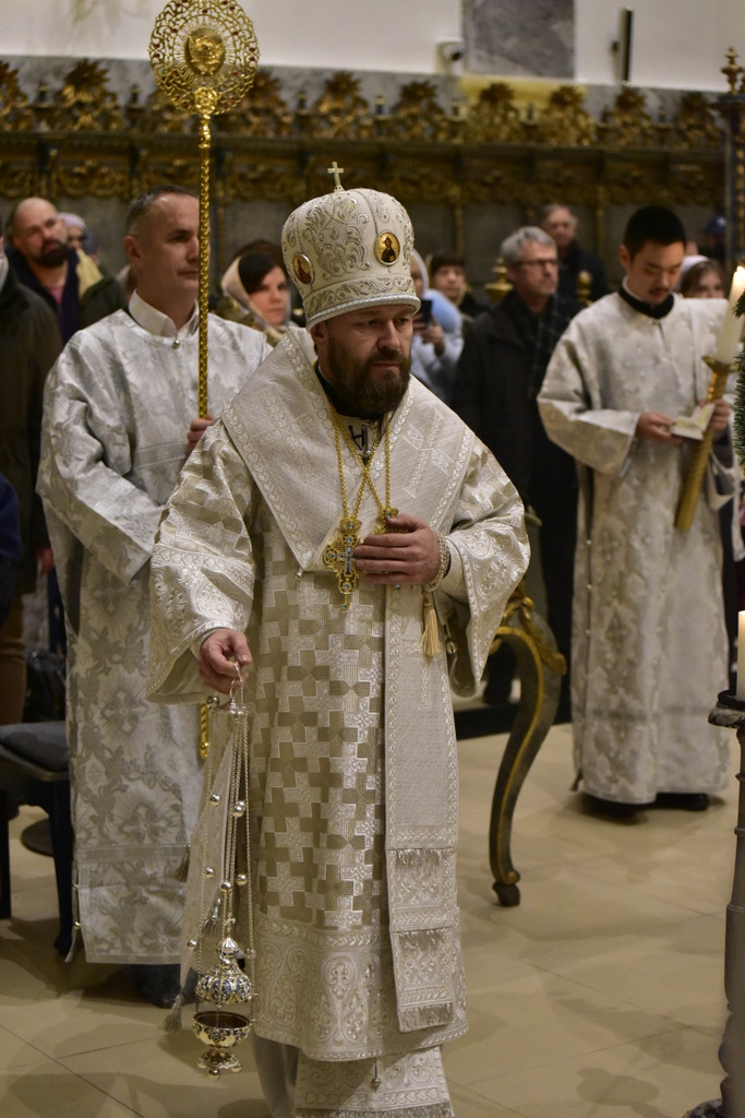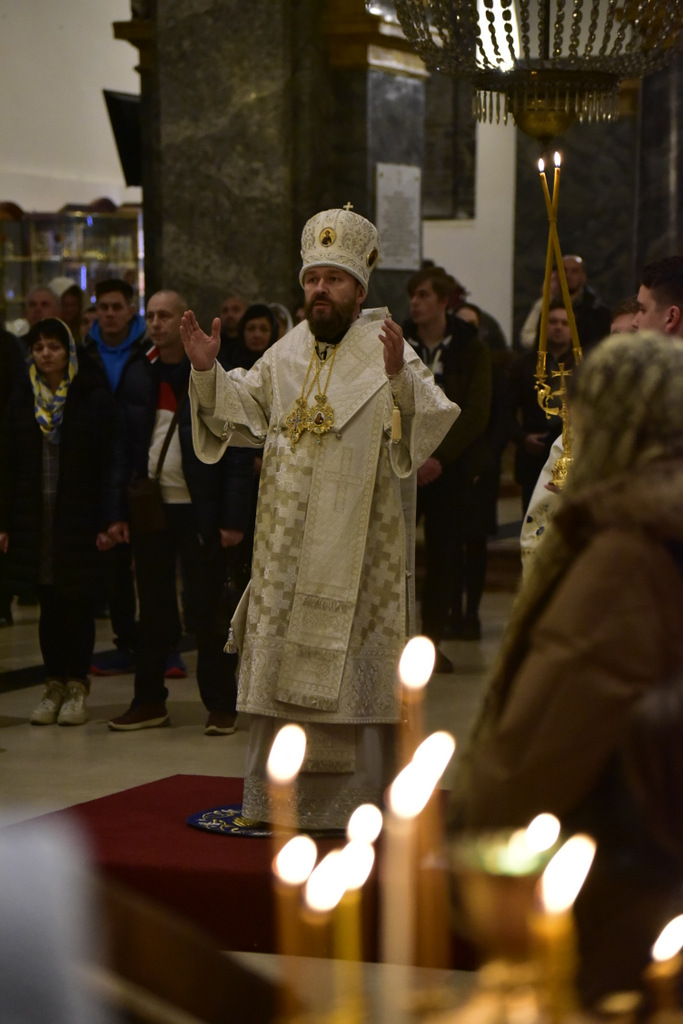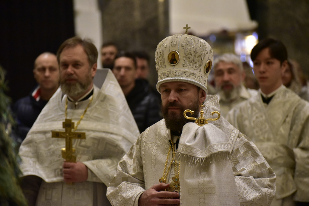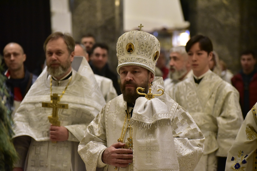 В евангельском отрывке начальных глав апостола Матфея был представлен рассказ о Рождении Спасителя мира, Господа Иисуса Христа и о тех обстоятельствах, которые сопутствовали этому великому событию. В продолжение праздничной литургии, после сугубой ектеньи, митрополит Иларион вознес молитву о мире на Украине.