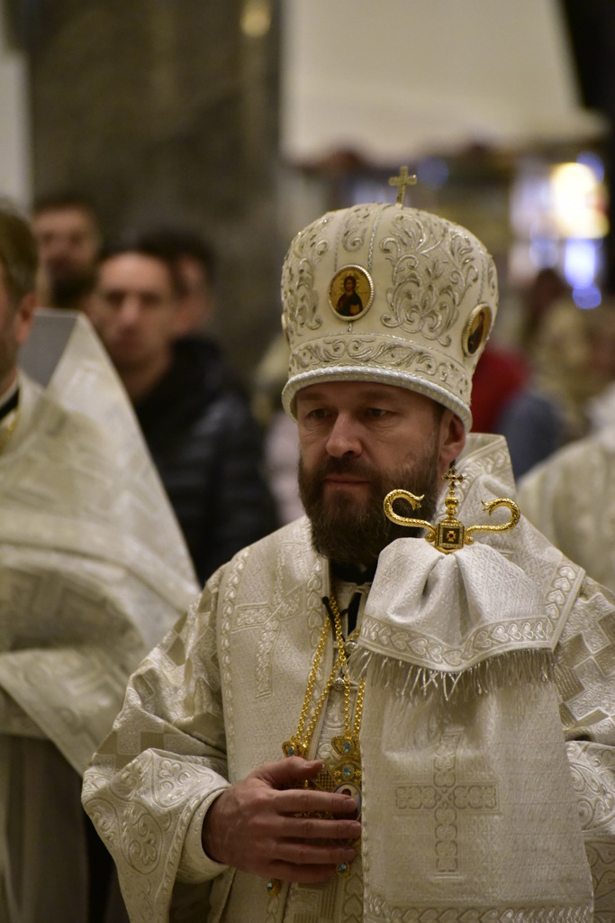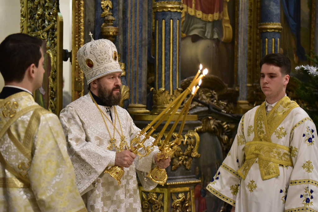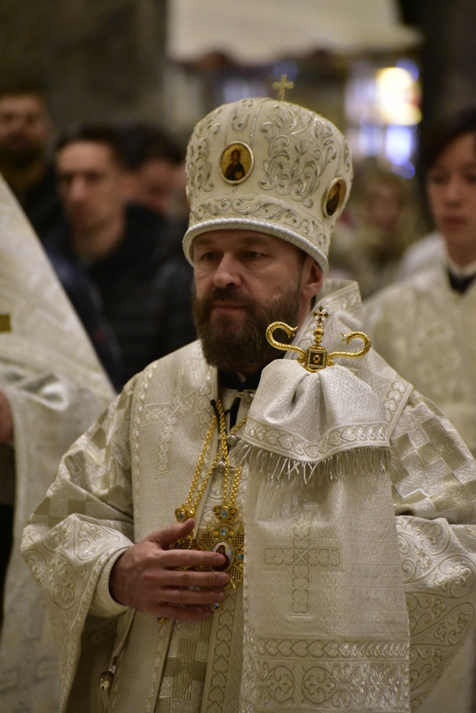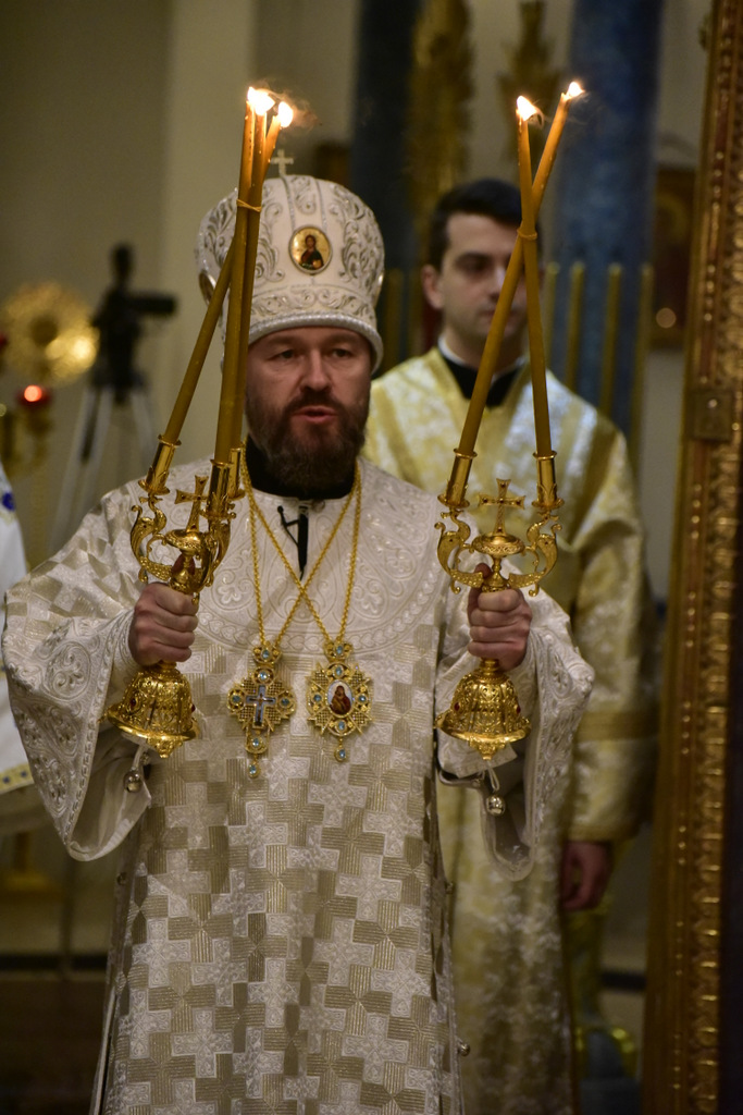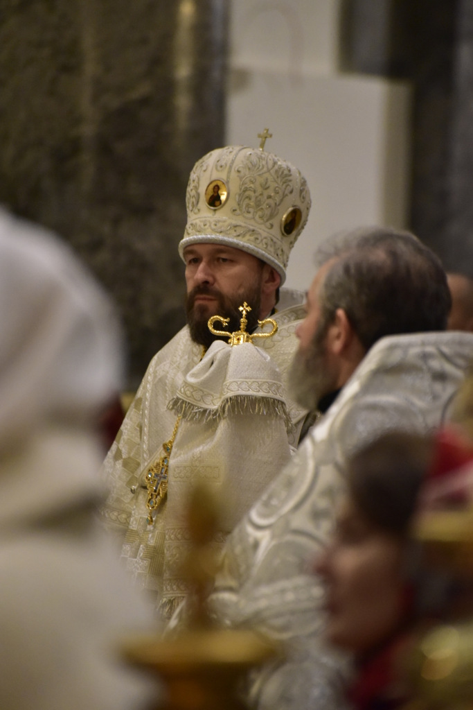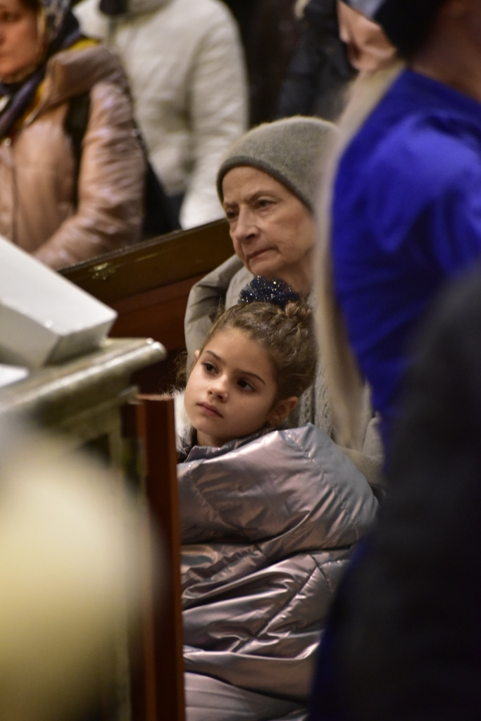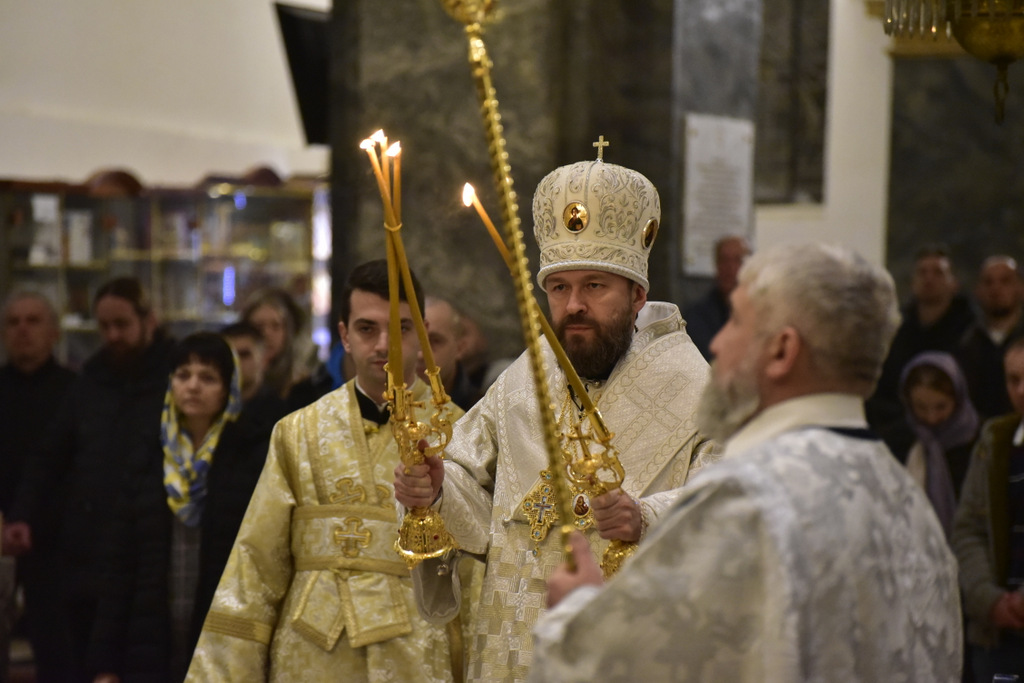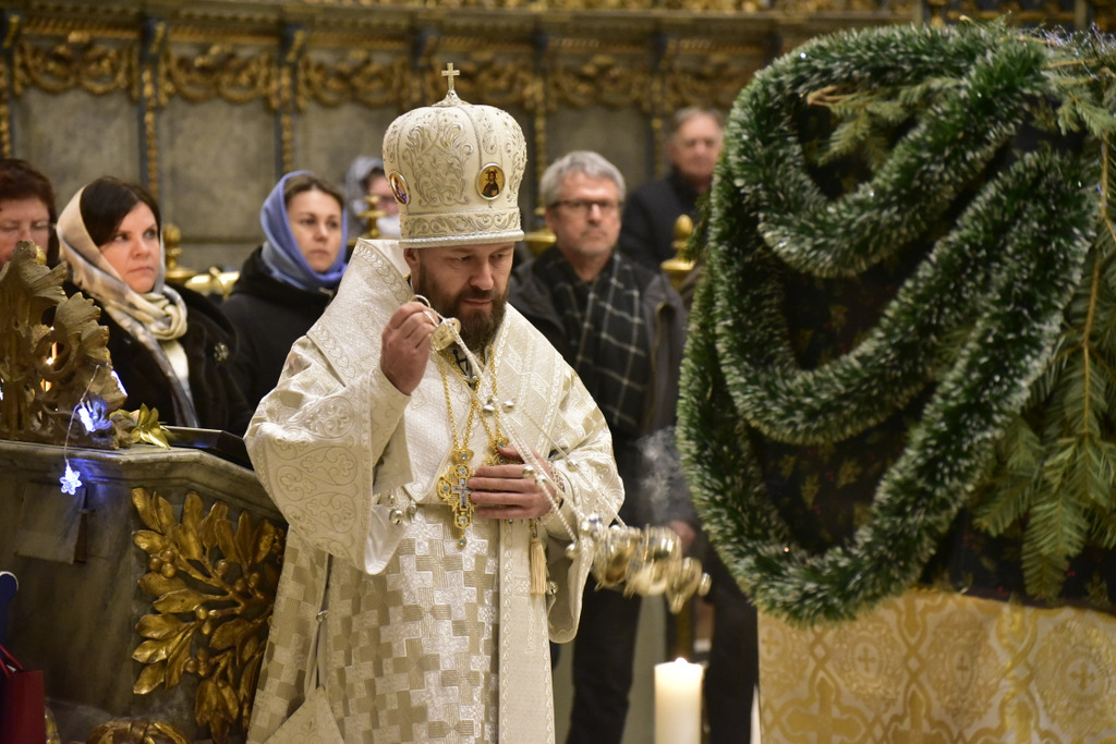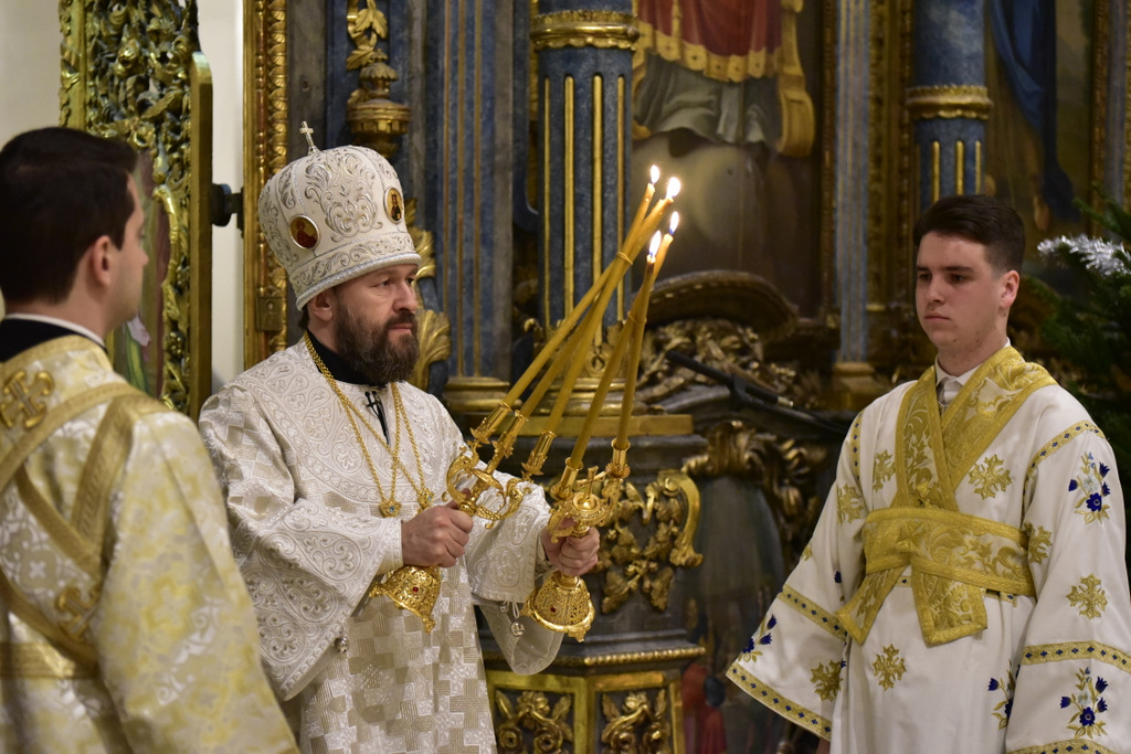 В евангельском отрывке начальных глав апостола Матфея был представлен рассказ о Рождении Спасителя мира, Господа Иисуса Христа и о тех обстоятельствах, которые сопутствовали этому великому событию. В продолжение праздничной литургии, после сугубой ектеньи, митрополит Иларион вознес молитву о мире на Украине.