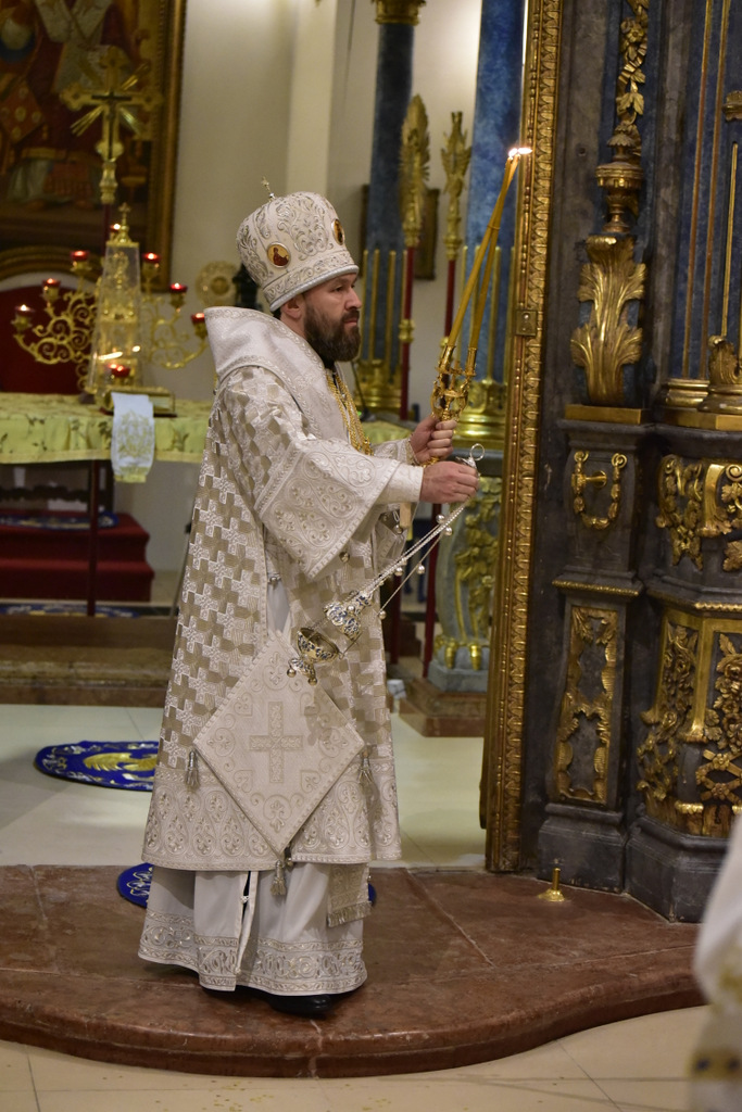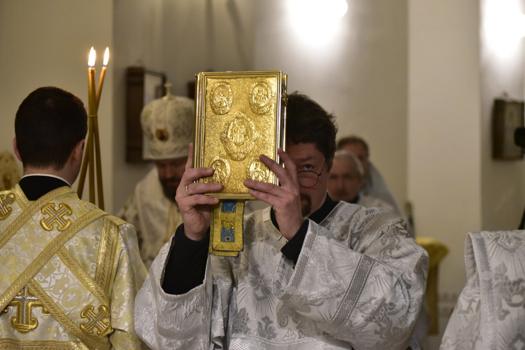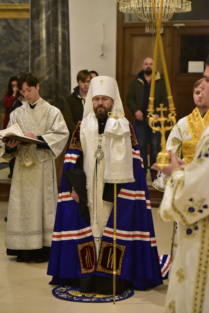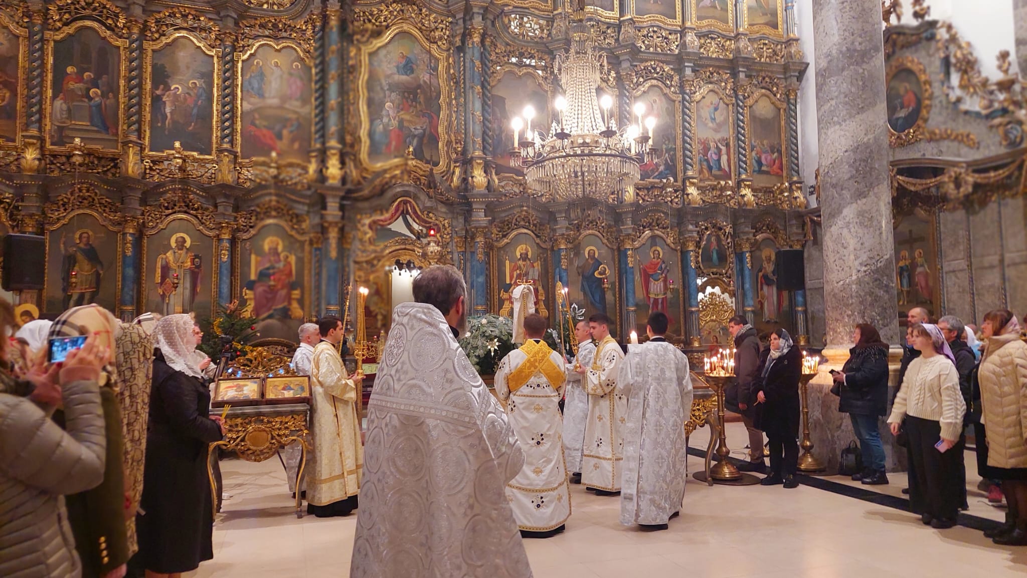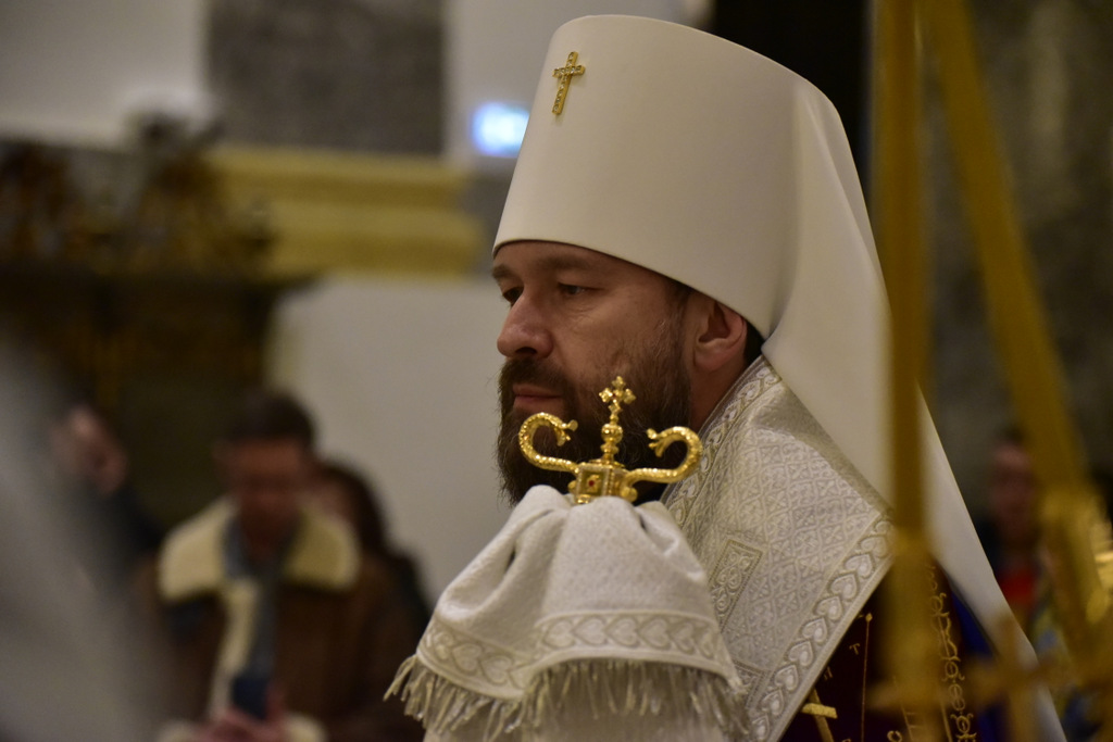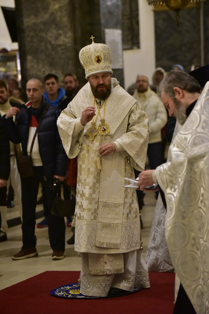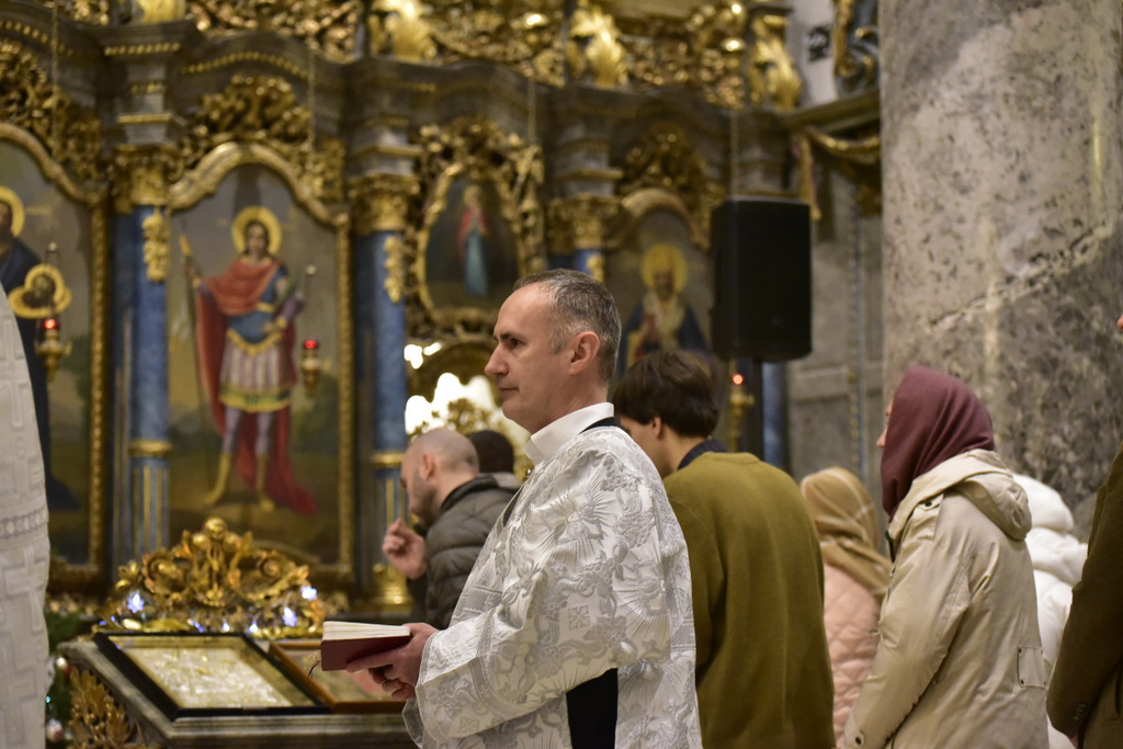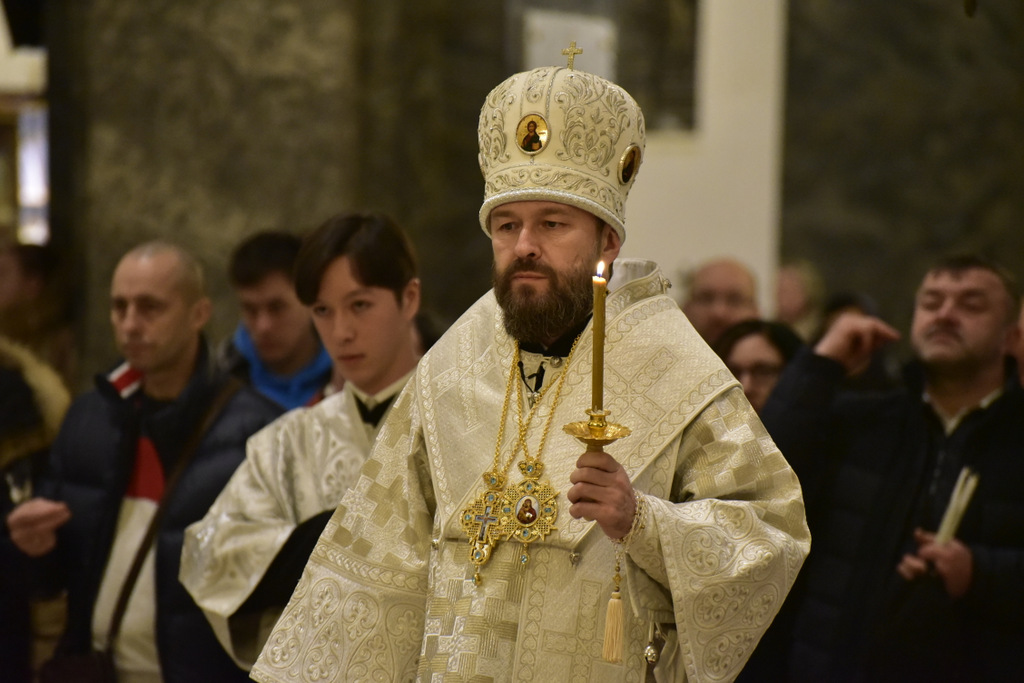 В евангельском отрывке начальных глав апостола Матфея был представлен рассказ о Рождении Спасителя мира, Господа Иисуса Христа и о тех обстоятельствах, которые сопутствовали этому великому событию. В продолжение праздничной литургии, после сугубой ектеньи, митрополит Иларион вознес молитву о мире на Украине.