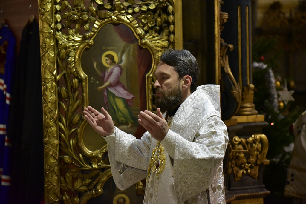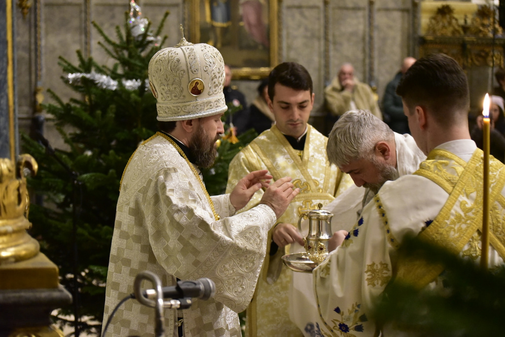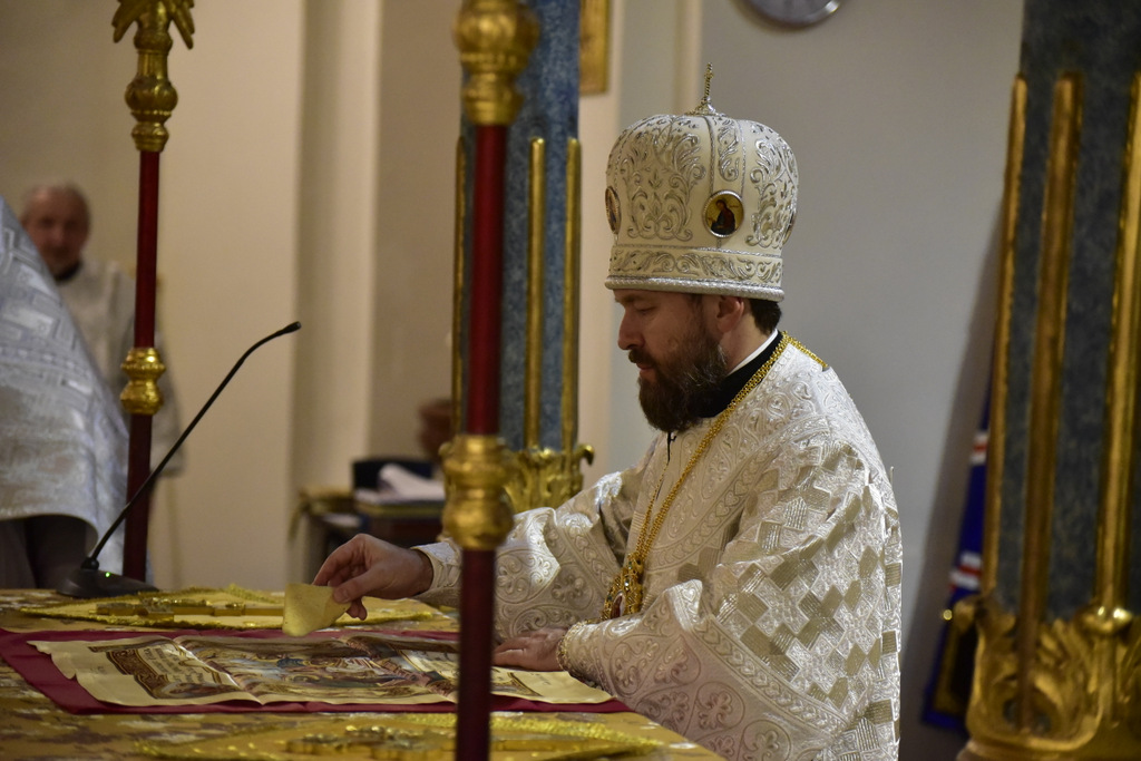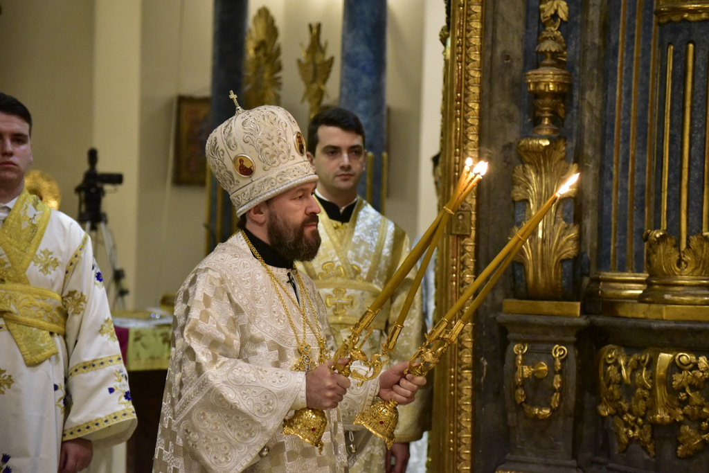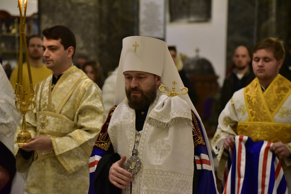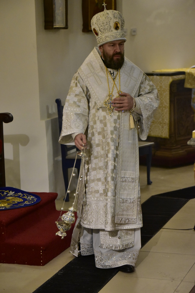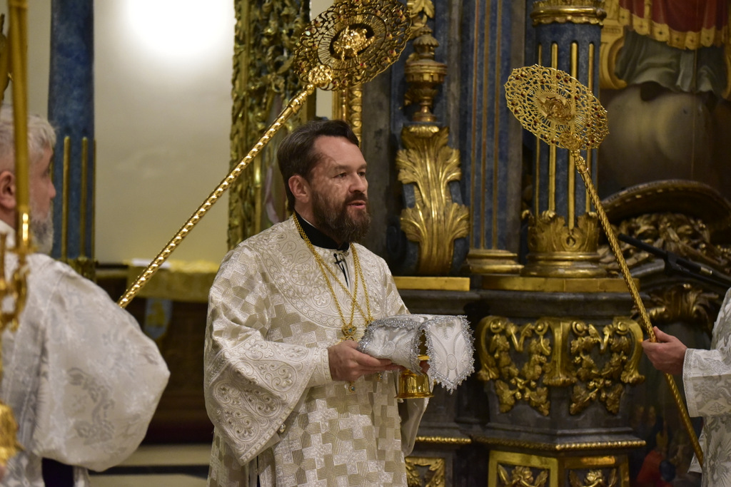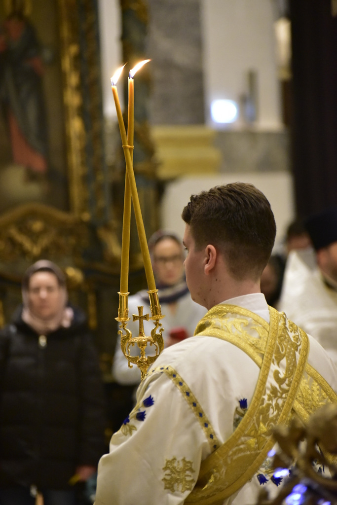 В евангельском отрывке начальных глав апостола Матфея был представлен рассказ о Рождении Спасителя мира, Господа Иисуса Христа и о тех обстоятельствах, которые сопутствовали этому великому событию. В продолжение праздничной литургии, после сугубой ектеньи, митрополит Иларион вознес молитву о мире на Украине.