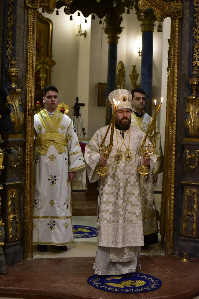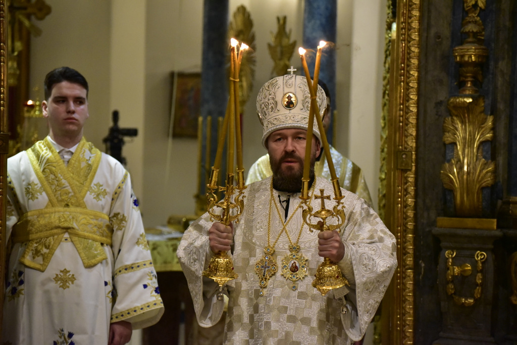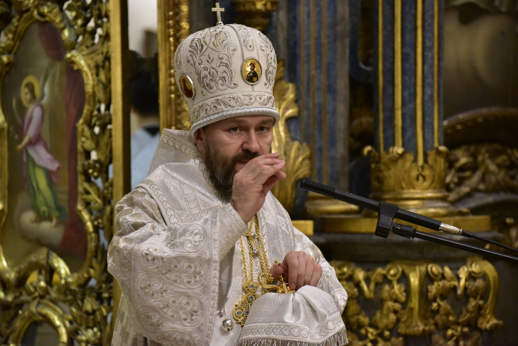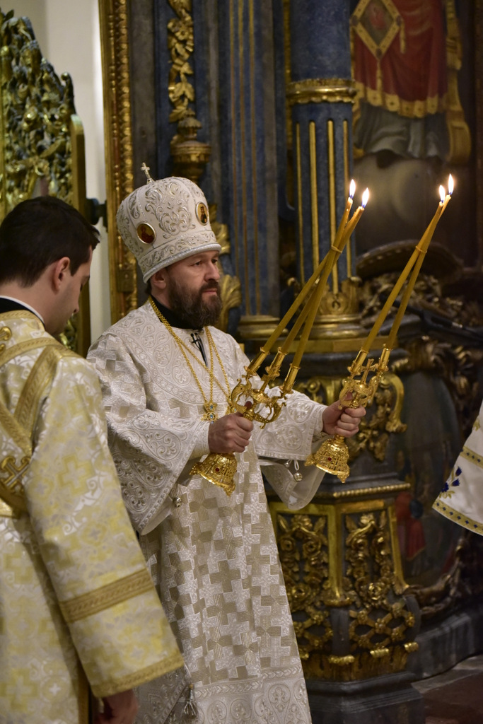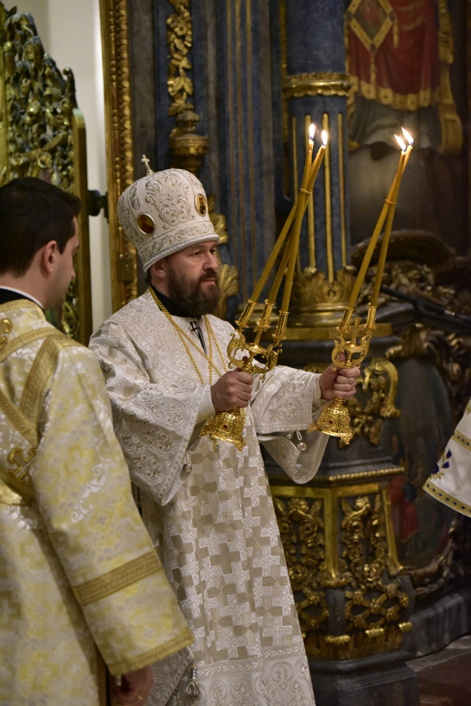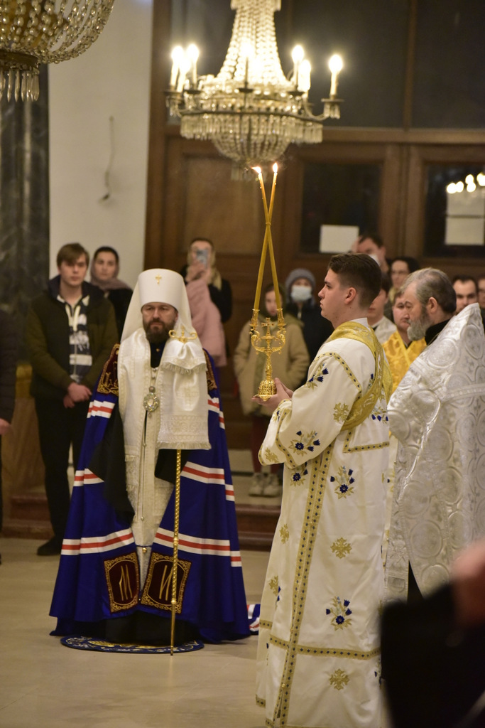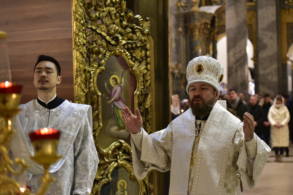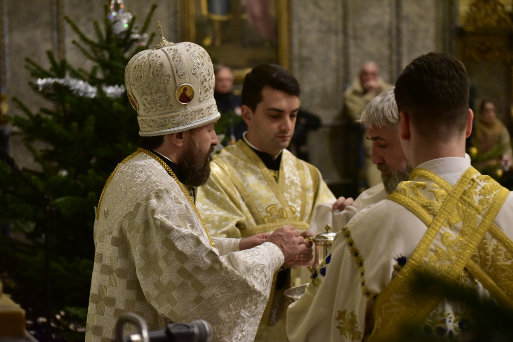 В евангельском отрывке начальных глав апостола Матфея был представлен рассказ о Рождении Спасителя мира, Господа Иисуса Христа и о тех обстоятельствах, которые сопутствовали этому великому событию. В продолжение праздничной литургии, после сугубой ектеньи, митрополит Иларион вознес молитву о мире на Украине.