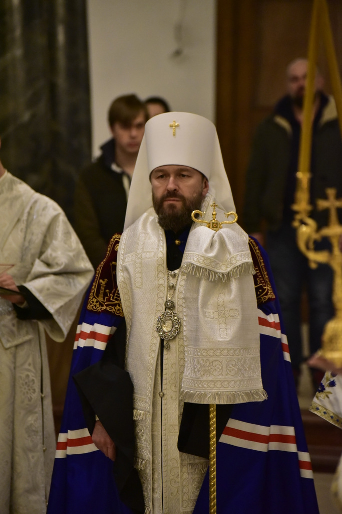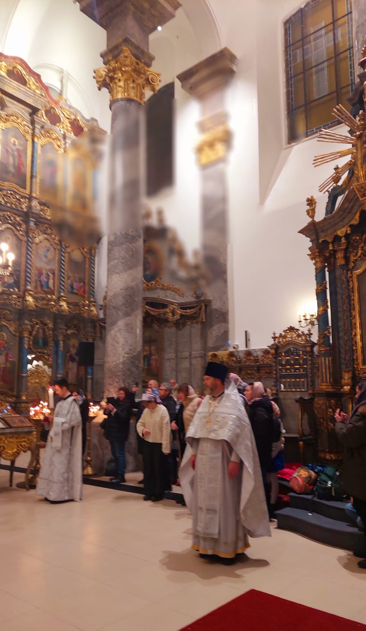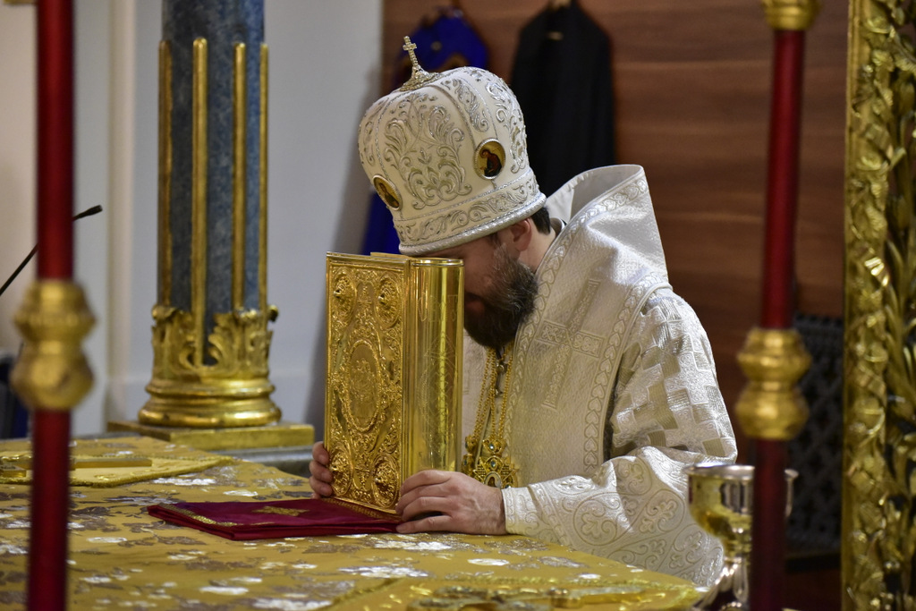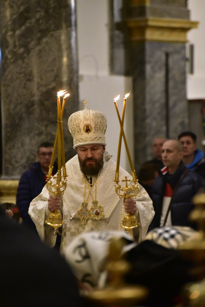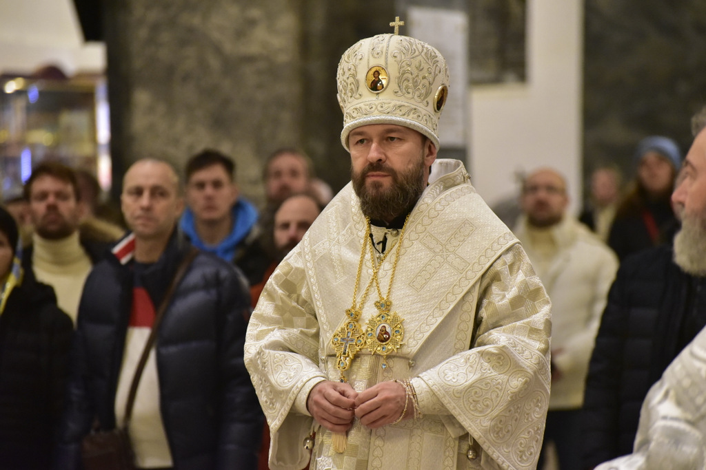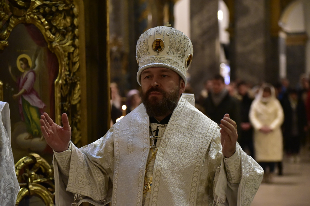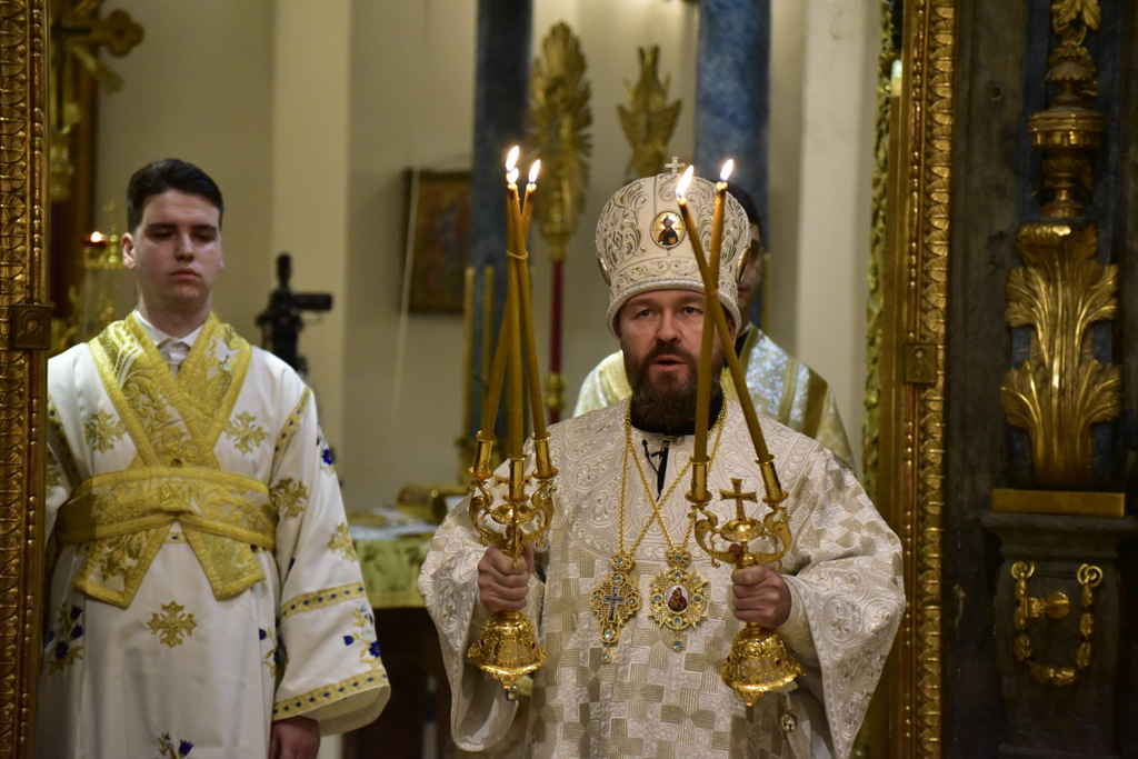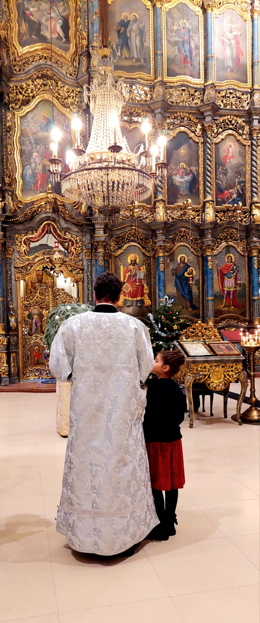 В евангельском отрывке начальных глав апостола Матфея был представлен рассказ о Рождении Спасителя мира, Господа Иисуса Христа и о тех обстоятельствах, которые сопутствовали этому великому событию. В продолжение праздничной литургии, после сугубой ектеньи, митрополит Иларион вознес молитву о мире на Украине.
