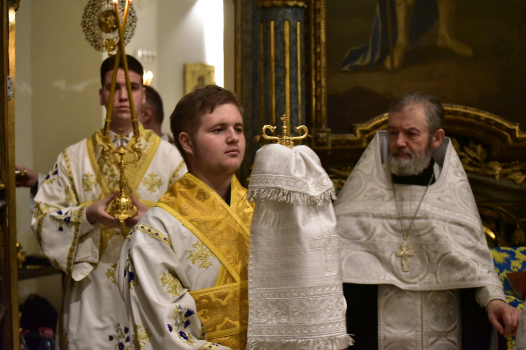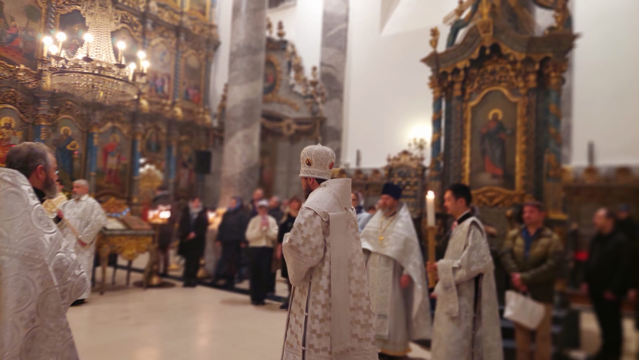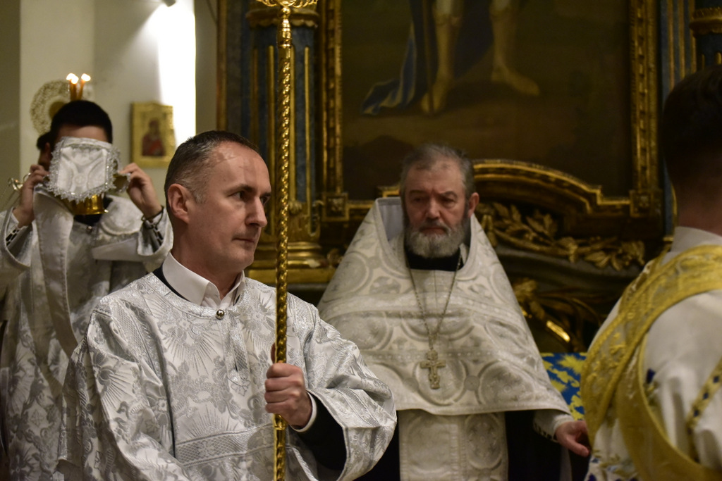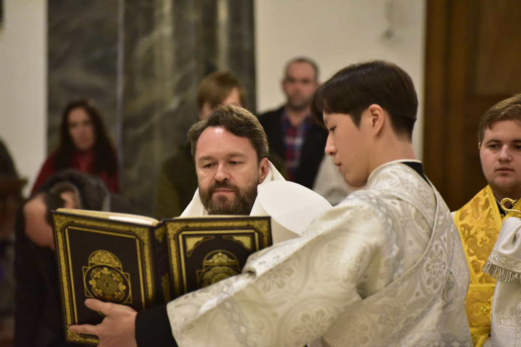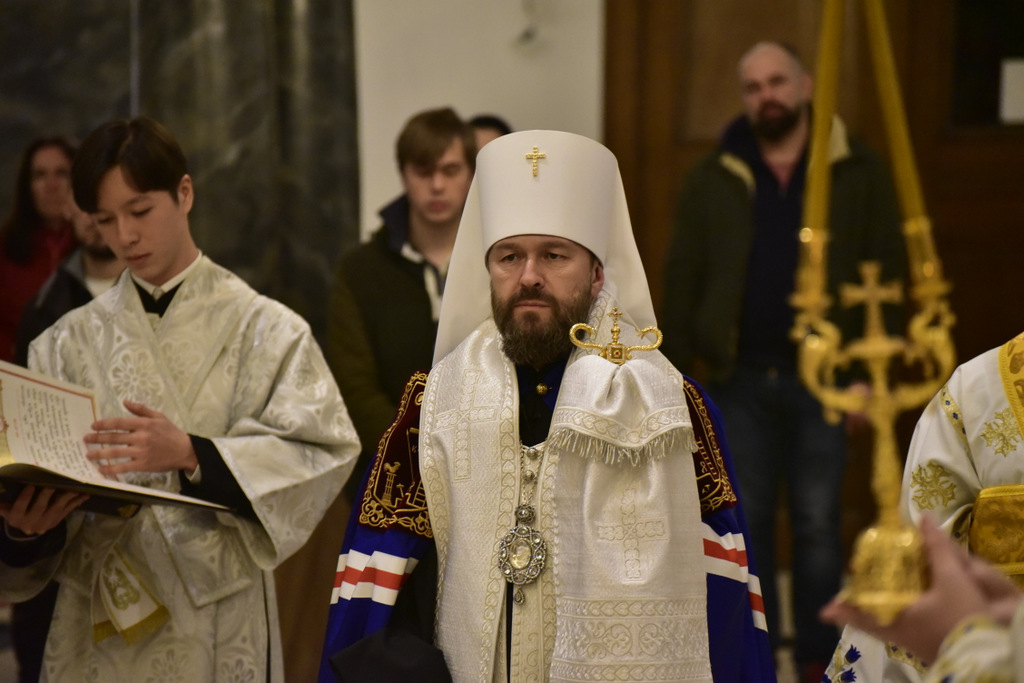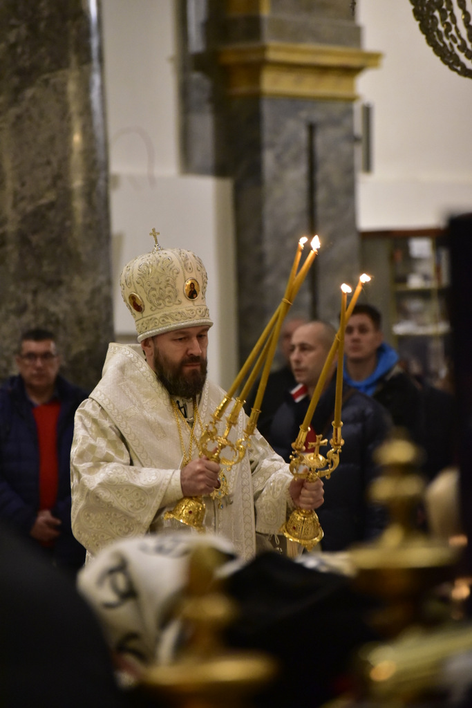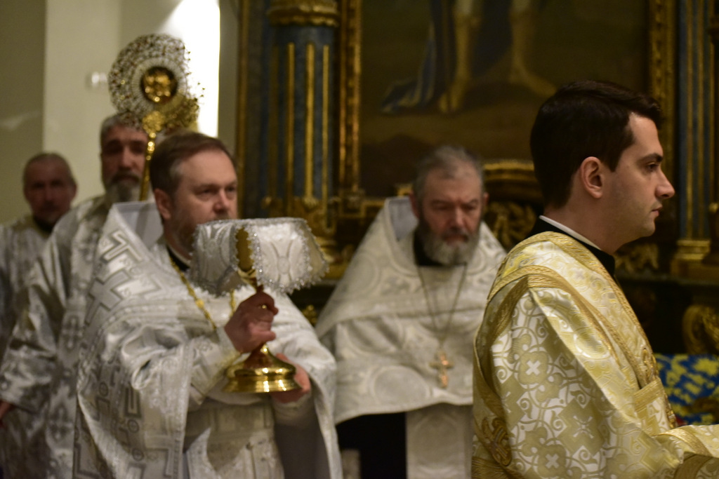 В евангельском отрывке начальных глав апостола Матфея был представлен рассказ о Рождении Спасителя мира, Господа Иисуса Христа и о тех обстоятельствах, которые сопутствовали этому великому событию. В продолжение праздничной литургии, после сугубой ектеньи, митрополит Иларион вознес молитву о мире на Украине.