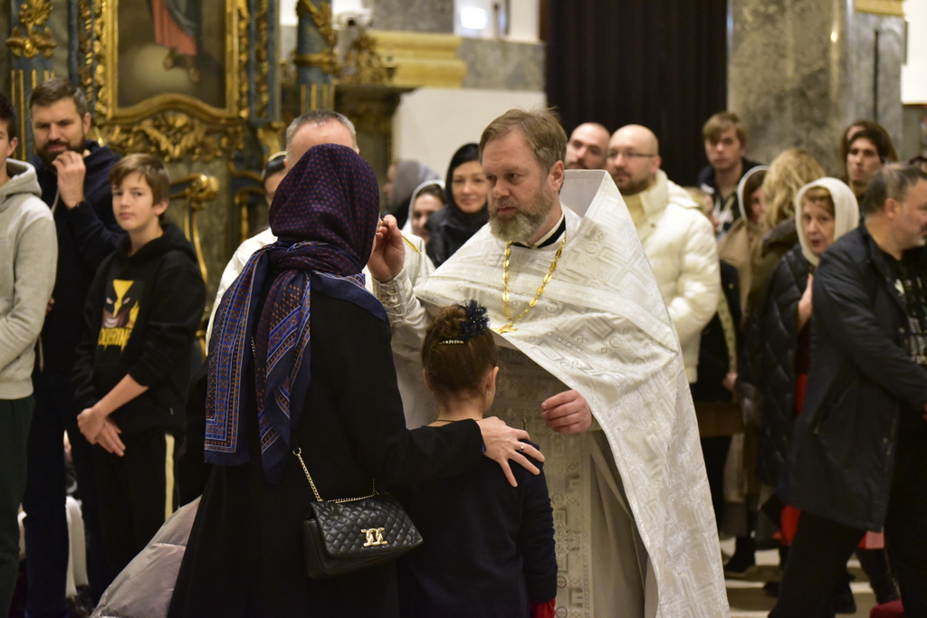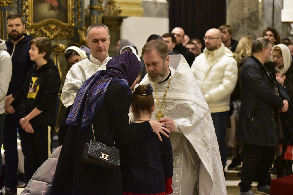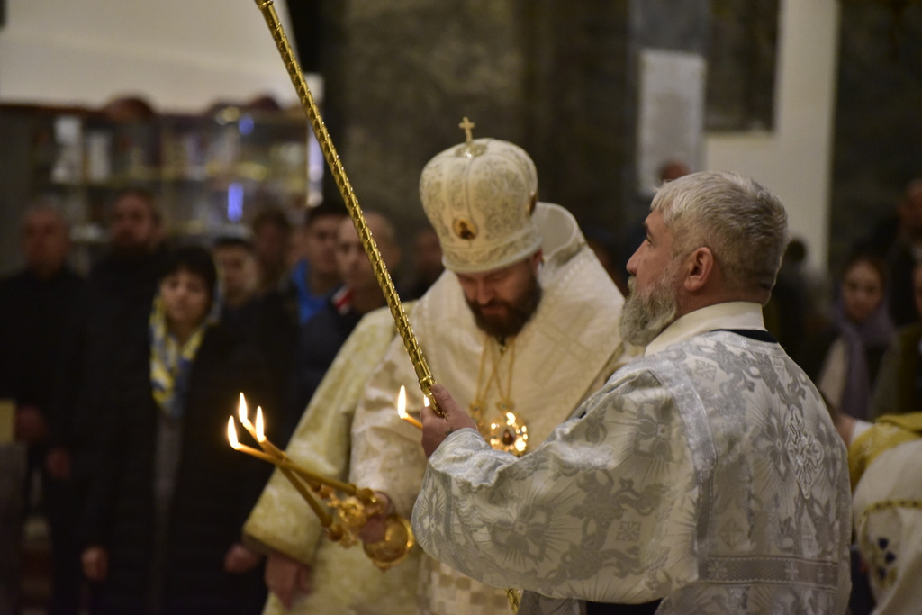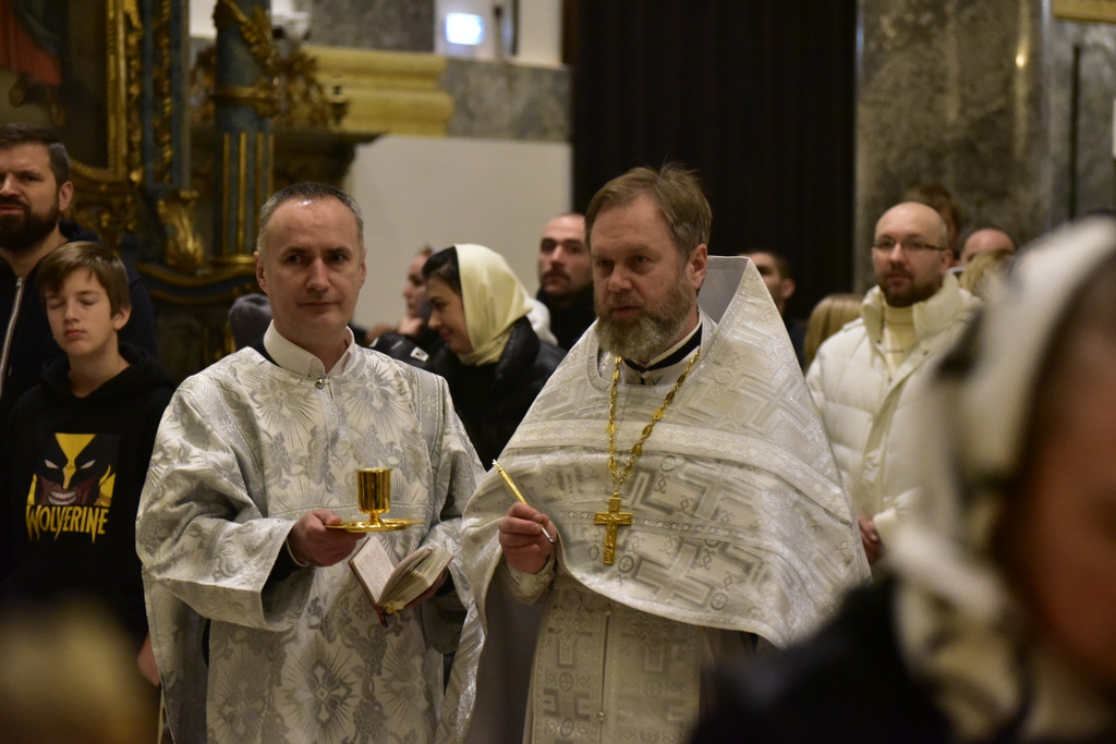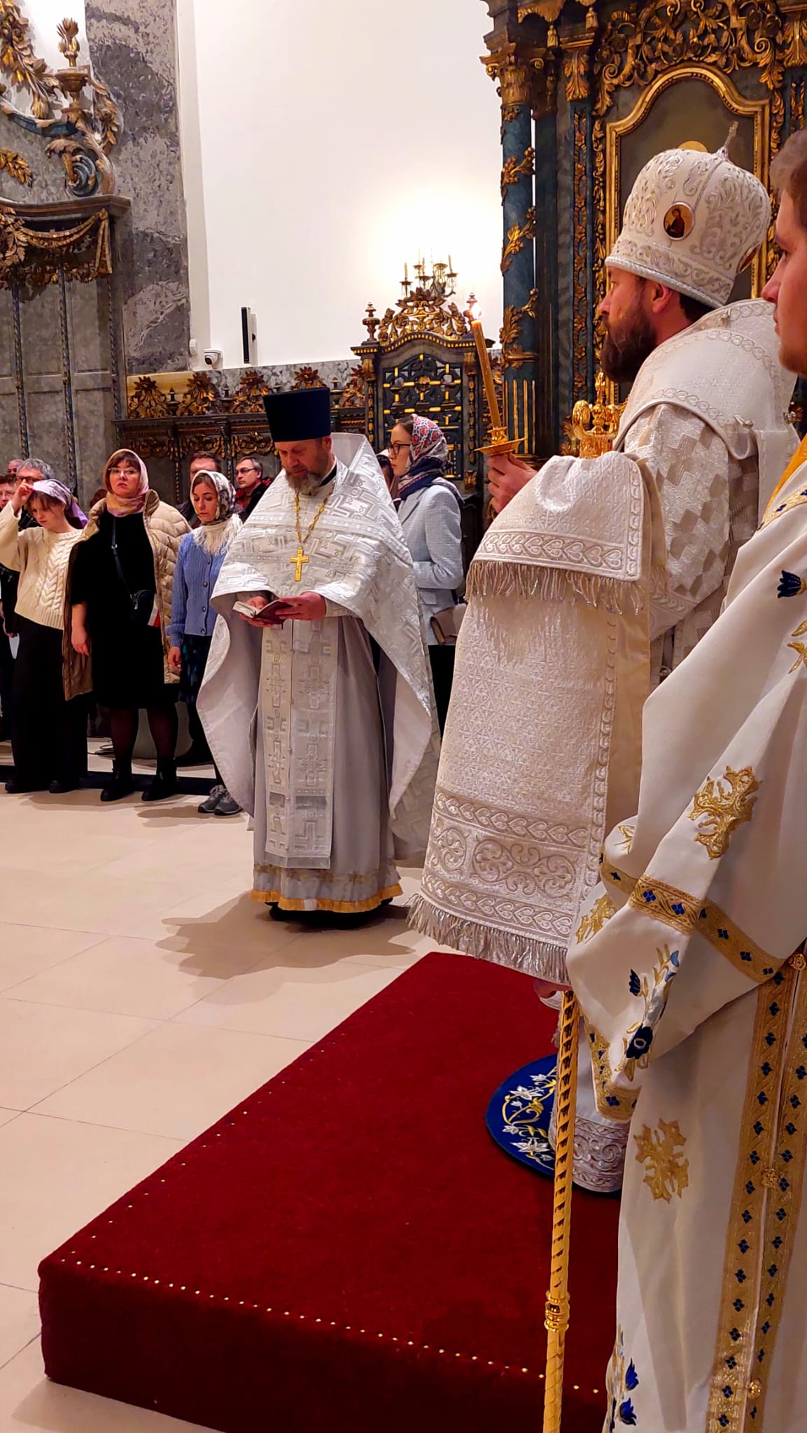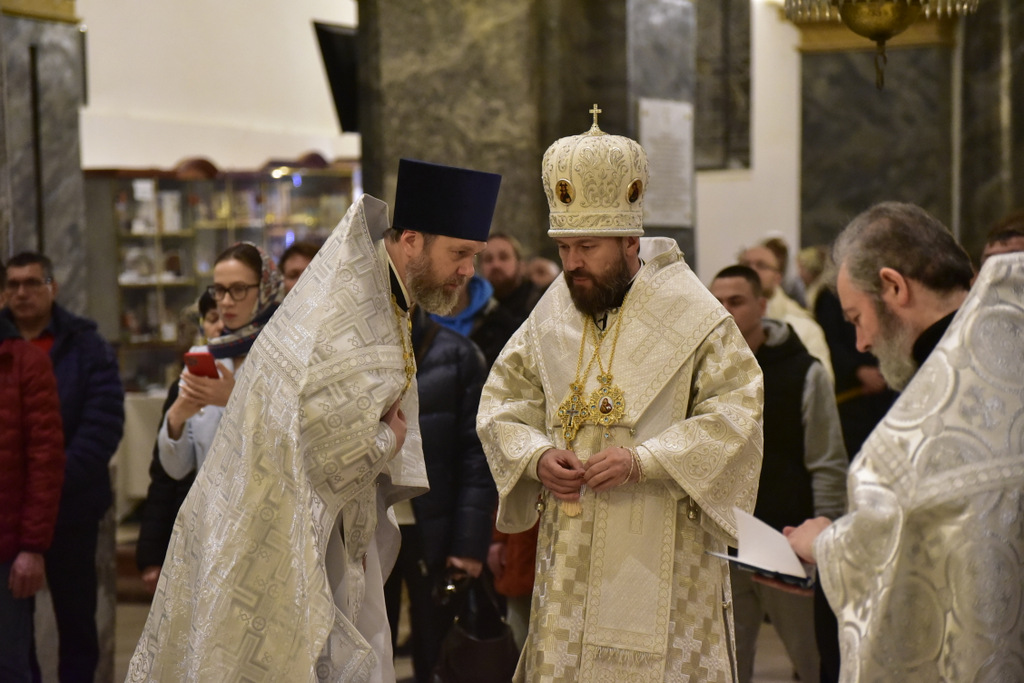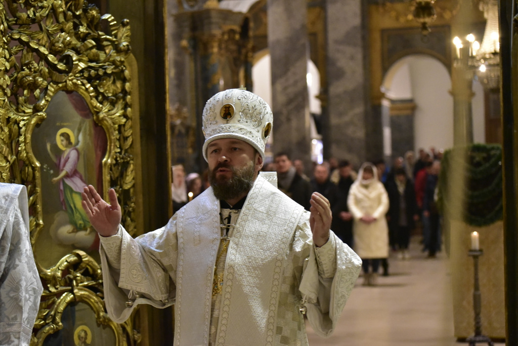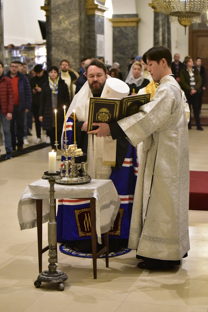 В евангельском отрывке начальных глав апостола Матфея был представлен рассказ о Рождении Спасителя мира, Господа Иисуса Христа и о тех обстоятельствах, которые сопутствовали этому великому событию. В продолжение праздничной литургии, после сугубой ектеньи, митрополит Иларион вознес молитву о мире на Украине.