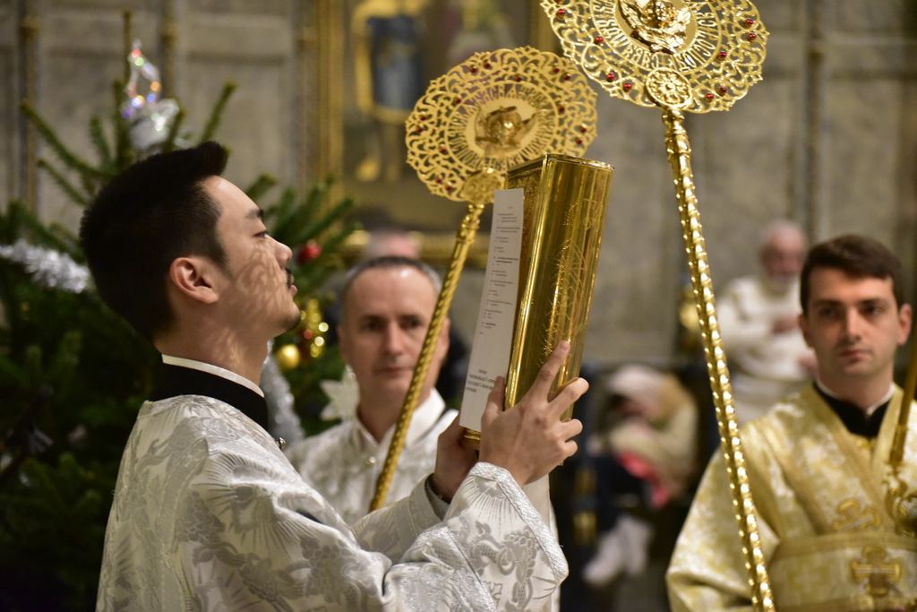 Возвещенные за литургией фрагменты Священного Писания поведали молящимся о чуде Рождества и о тех благах, которые оно даровало верующим во Христа. Так, для апостольского чтения был избран отрывок из Послания апостола Павла к Галатам, где свидетельствуется о том, что через Рождение в мире Иисуса Христа все верующие в Него усыновляются Творцу, делаясь детьми Создателя, наследниками бесконечных Божественных благ.