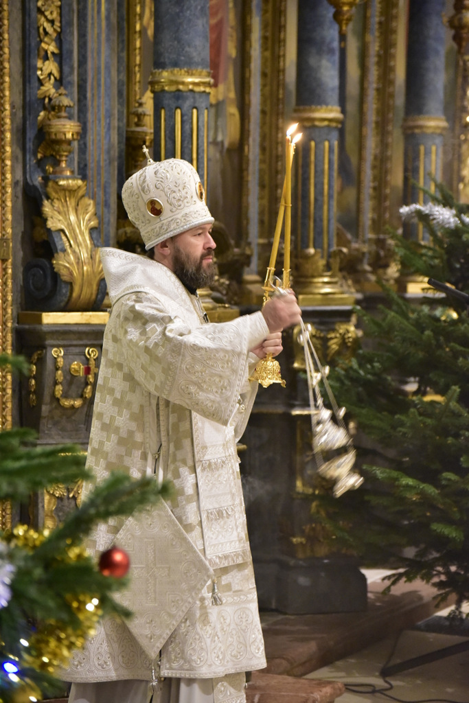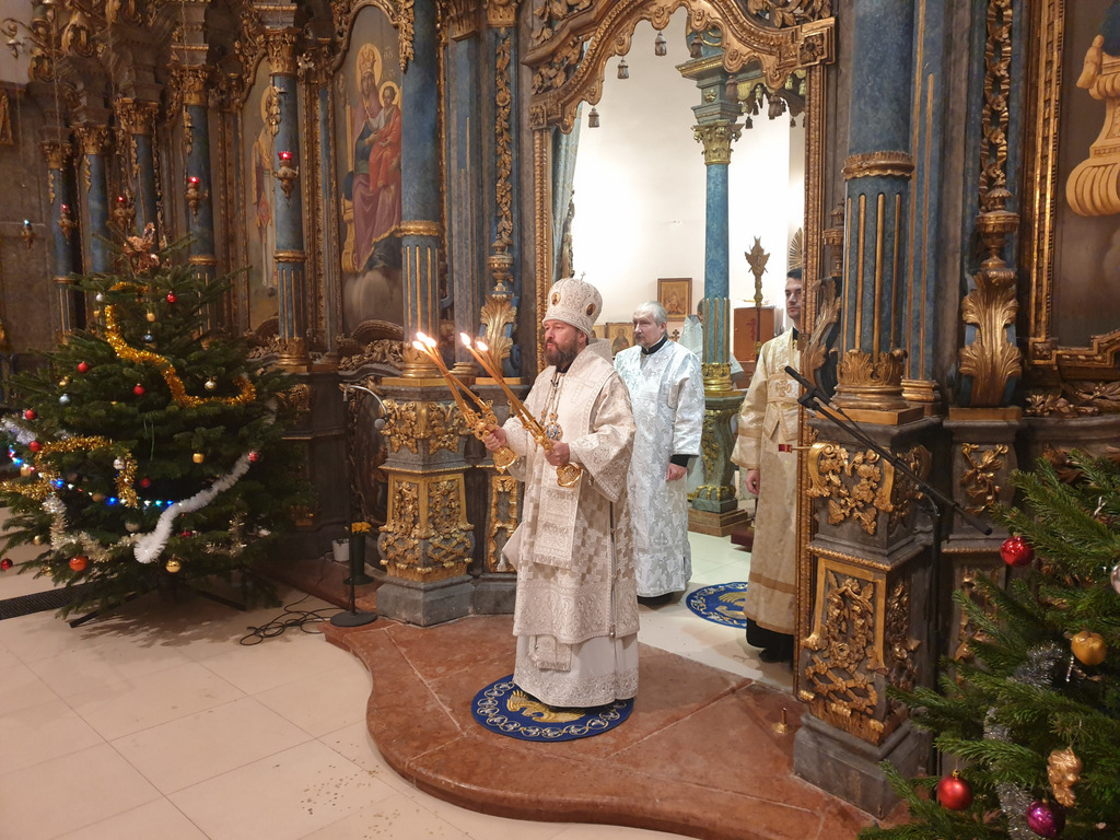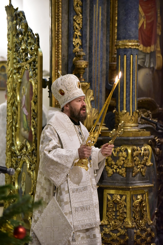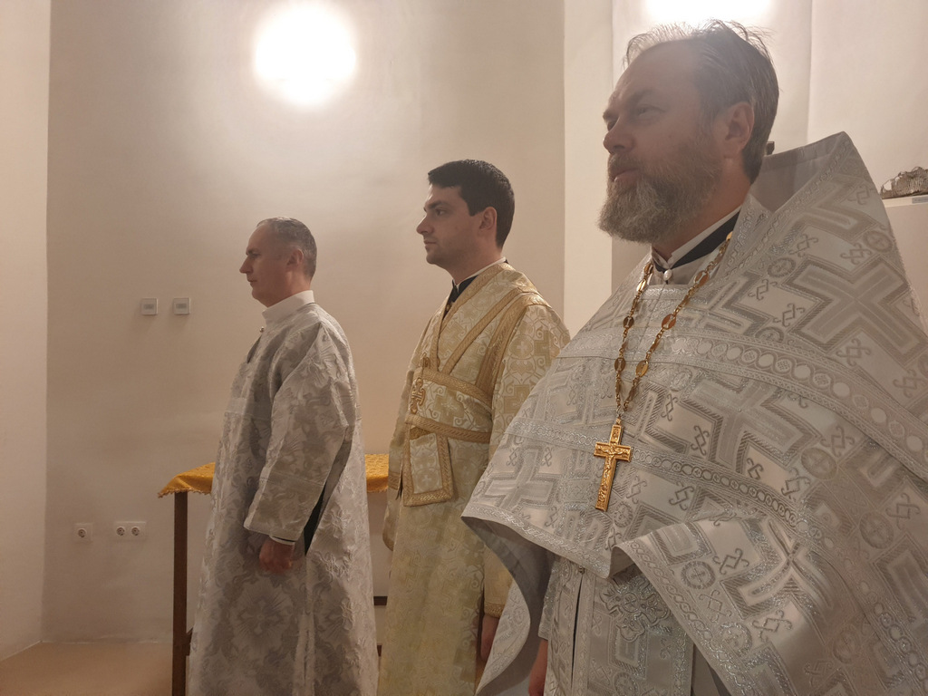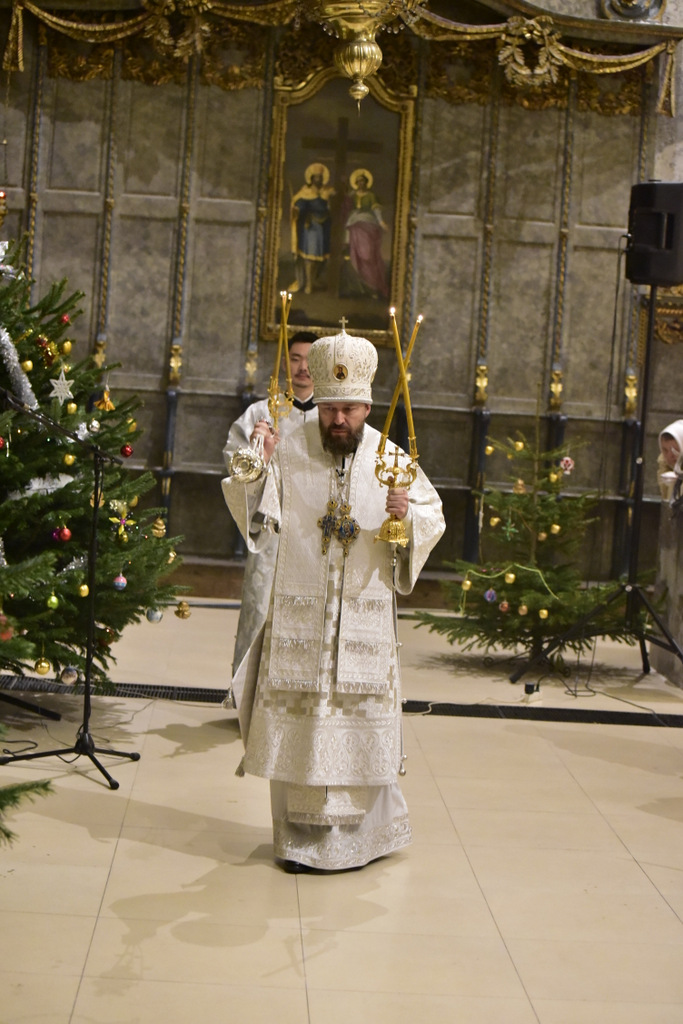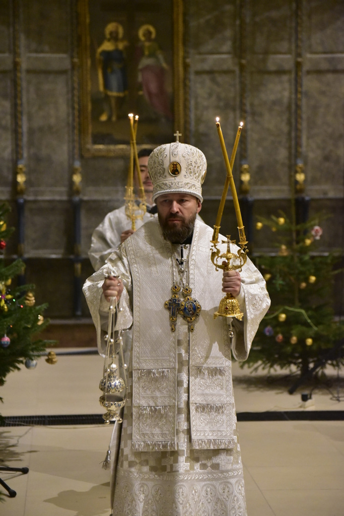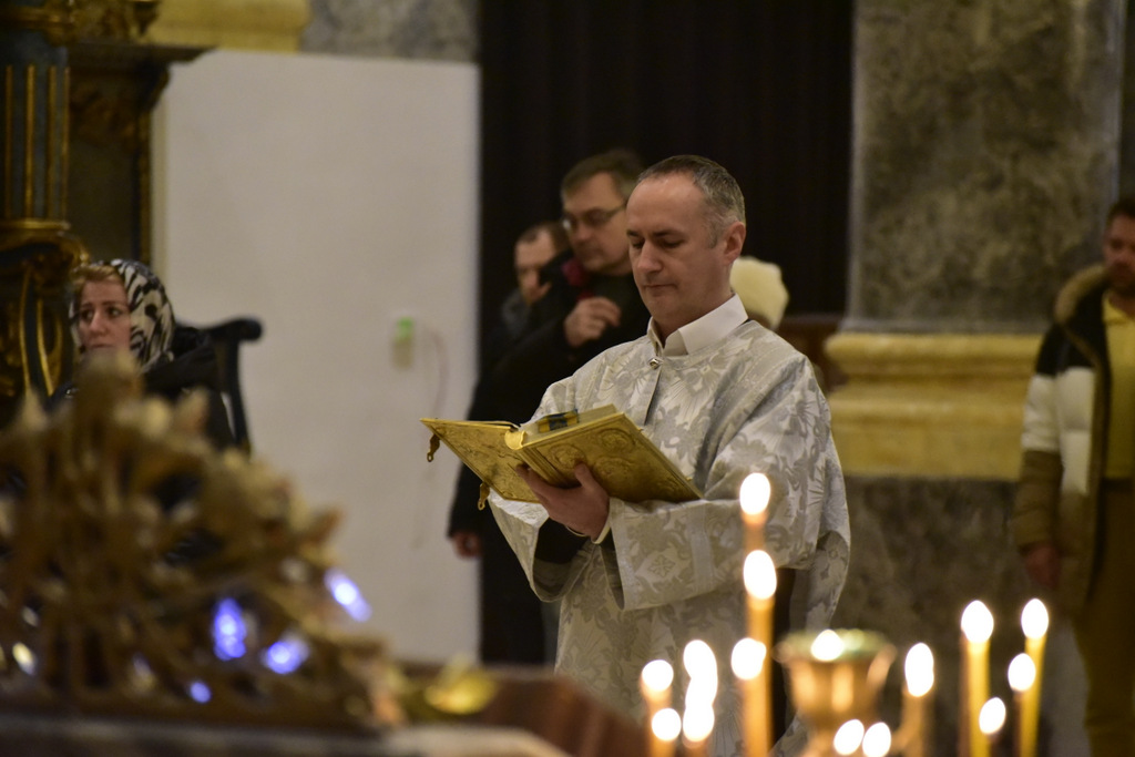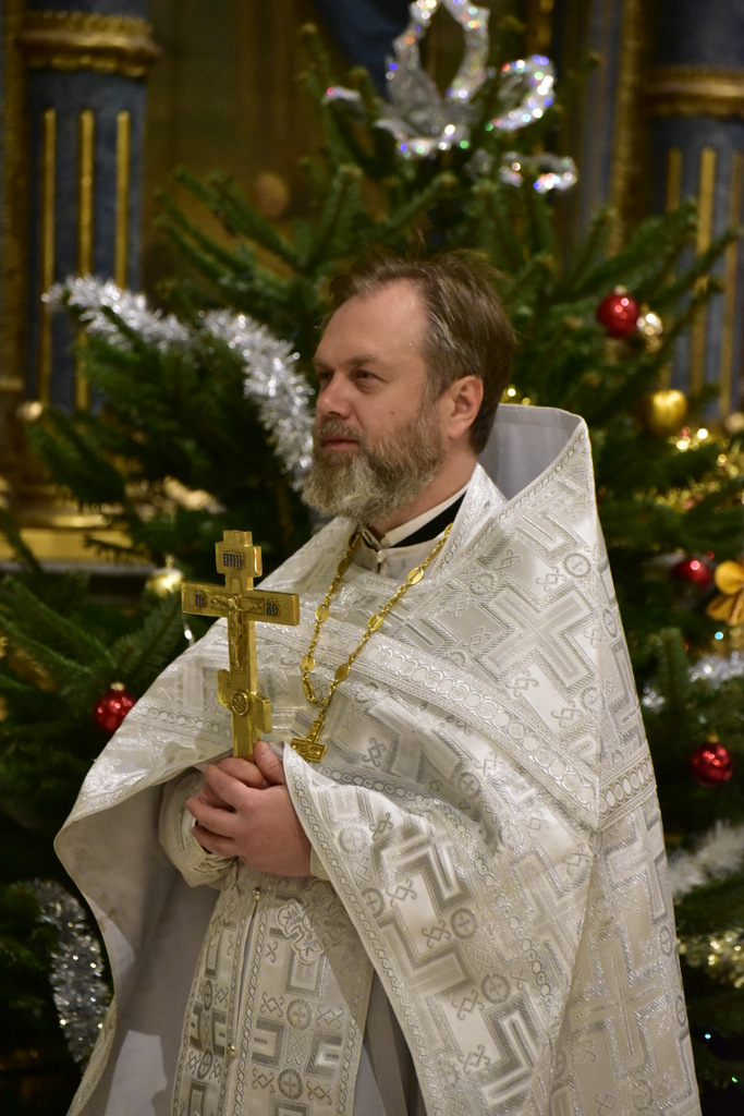 Праздничную Божественную литургию, продолжающую прославление Рождшегося Сына Божия, Господа Иисуса Христа, торжественным возгласом начал настоятель Свято-Троицкого прихода г. Будапешта иерея Димитрий Корнилов.
