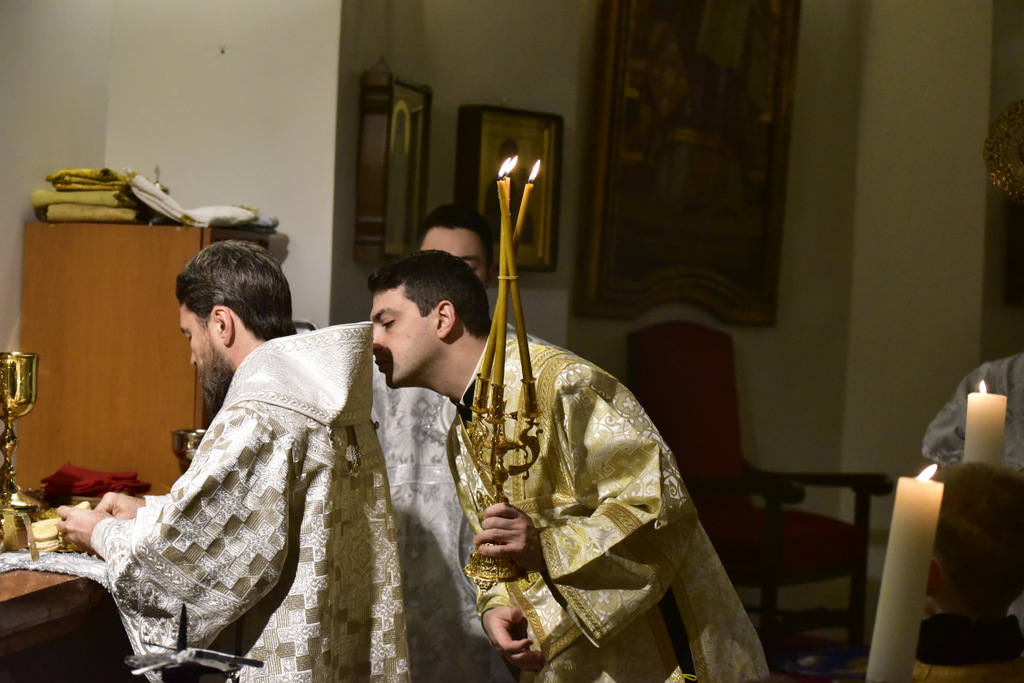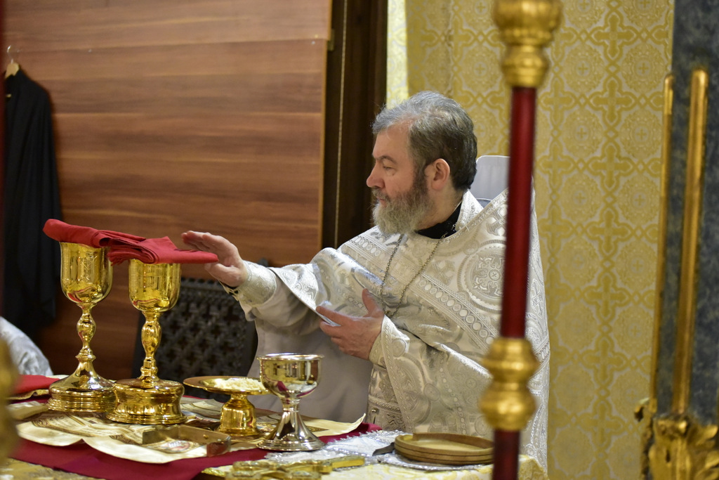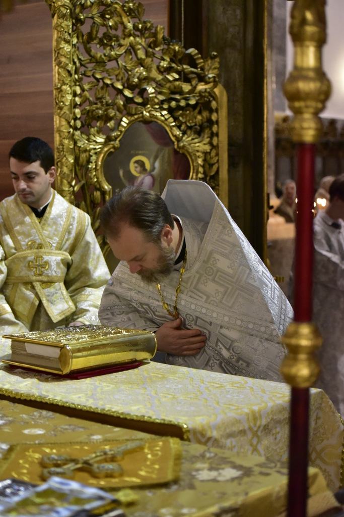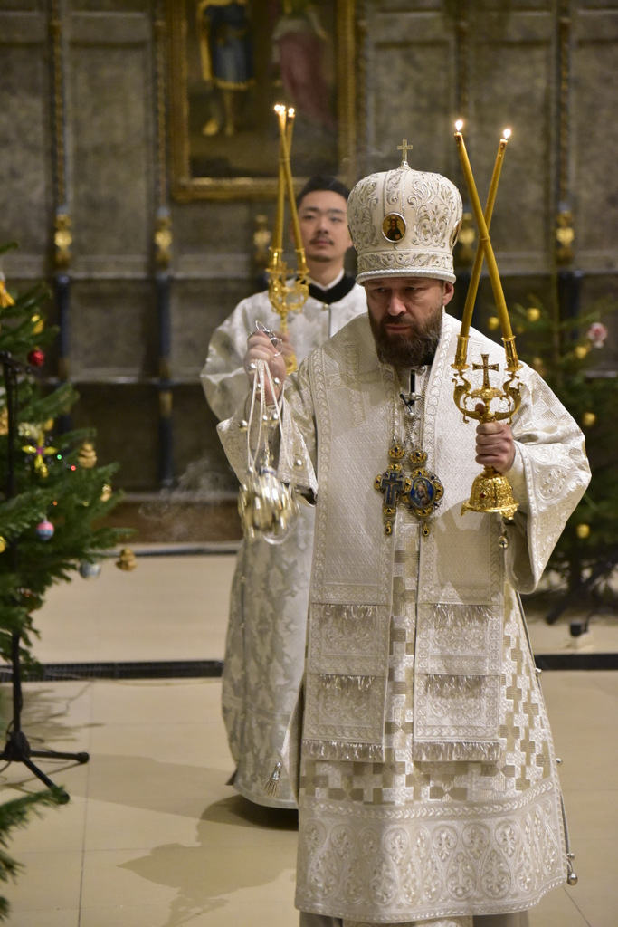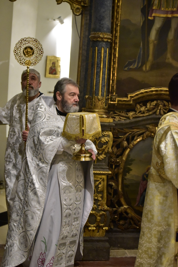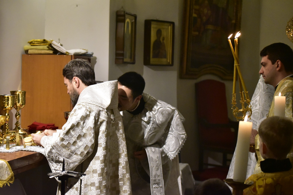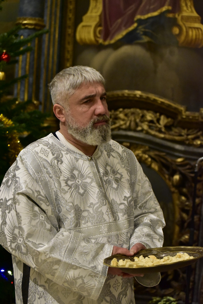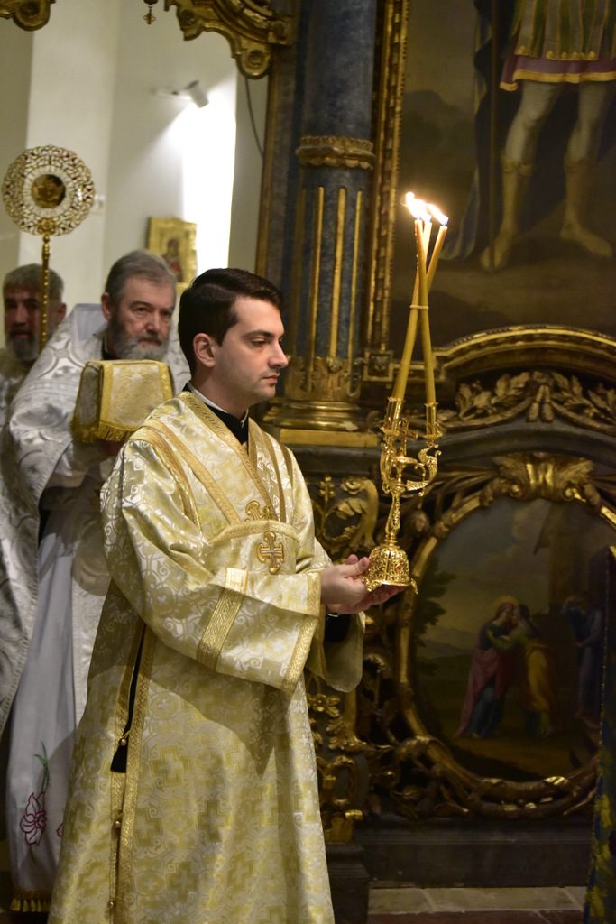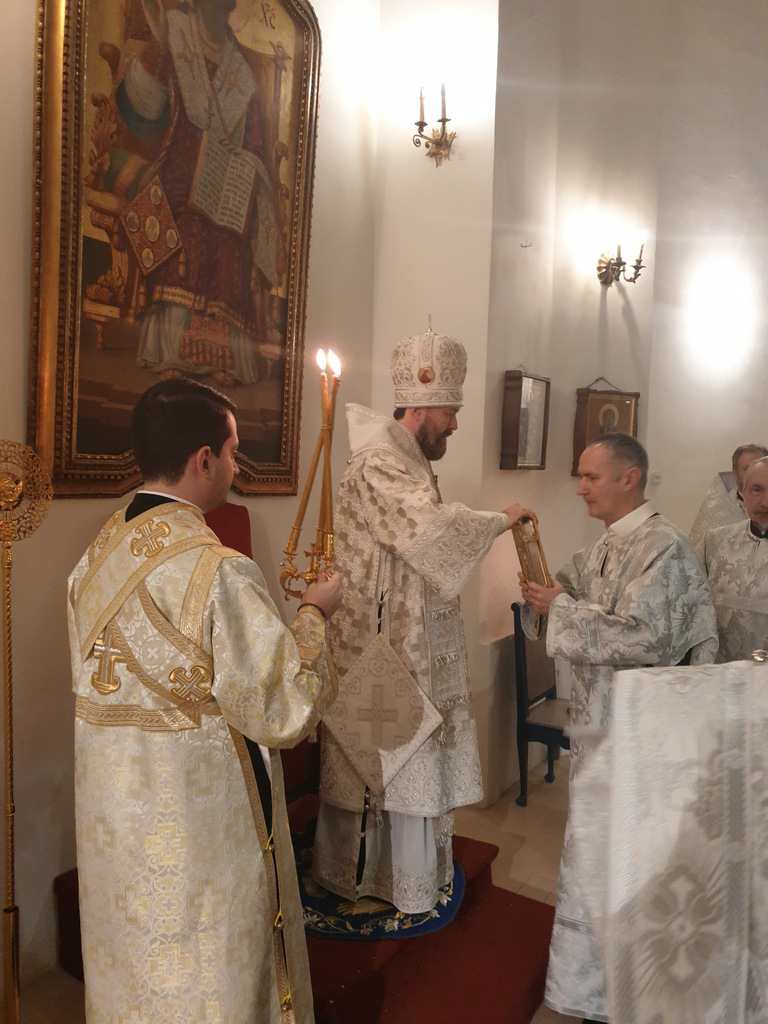 Праздничную Божественную литургию, продолжающую прославление Рождшегося Сына Божия, Господа Иисуса Христа, торжественным возгласом начал настоятель Свято-Троицкого прихода г. Будапешта иерея Димитрий Корнилов.