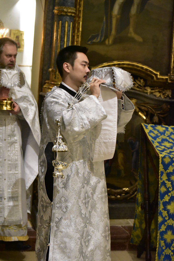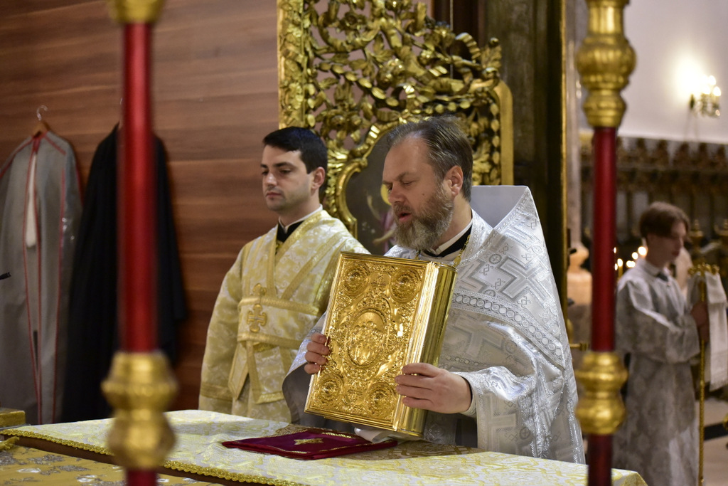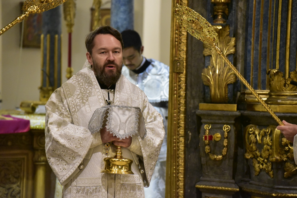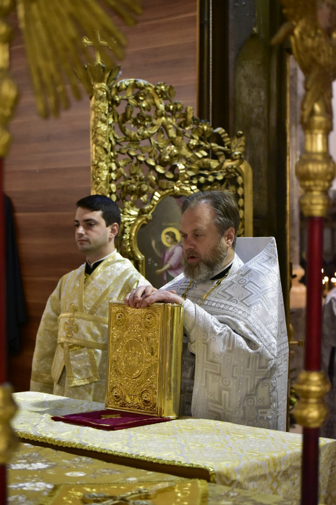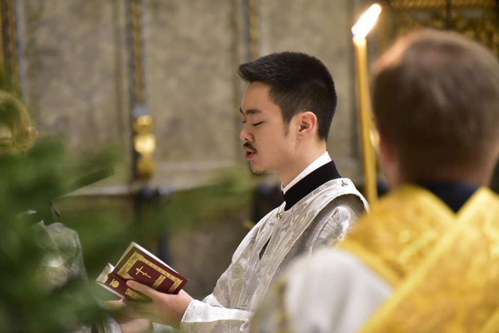 В евангельском отрывке, возвещенном диаконом Вячеславом Ли, был приведен рассказ апостола Матфея об удалении Иосифа, по повелению Ангела, с Богомладенцем Иисусом Христом и Богоматерью в Египет, – от Ирода, искавшего погубить воплотившегося Сына Божия.