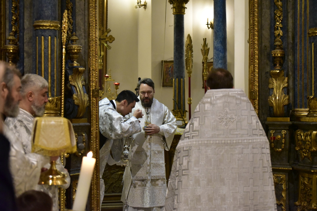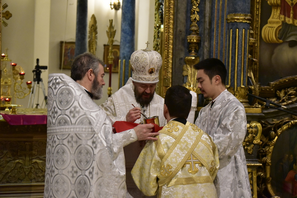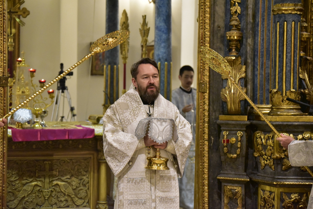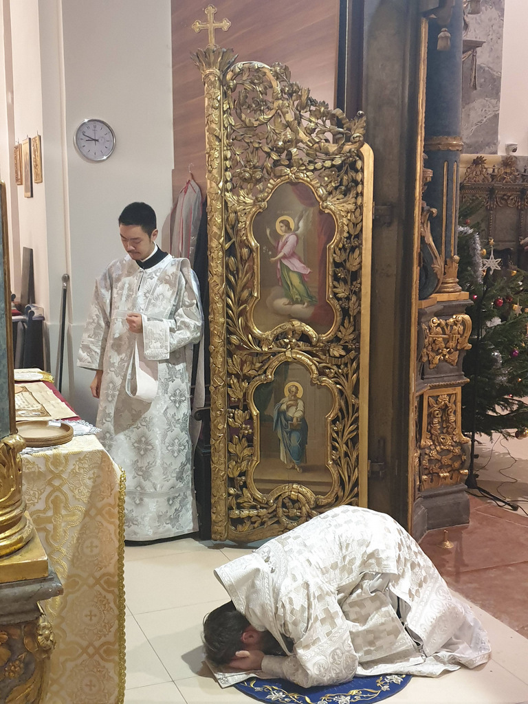 В евангельском отрывке, возвещенном диаконом Вячеславом Ли, был приведен рассказ апостола Матфея об удалении Иосифа, по повелению Ангела, с Богомладенцем Иисусом Христом и Богоматерью в Египет, – от Ирода, искавшего погубить воплотившегося Сына Божия.