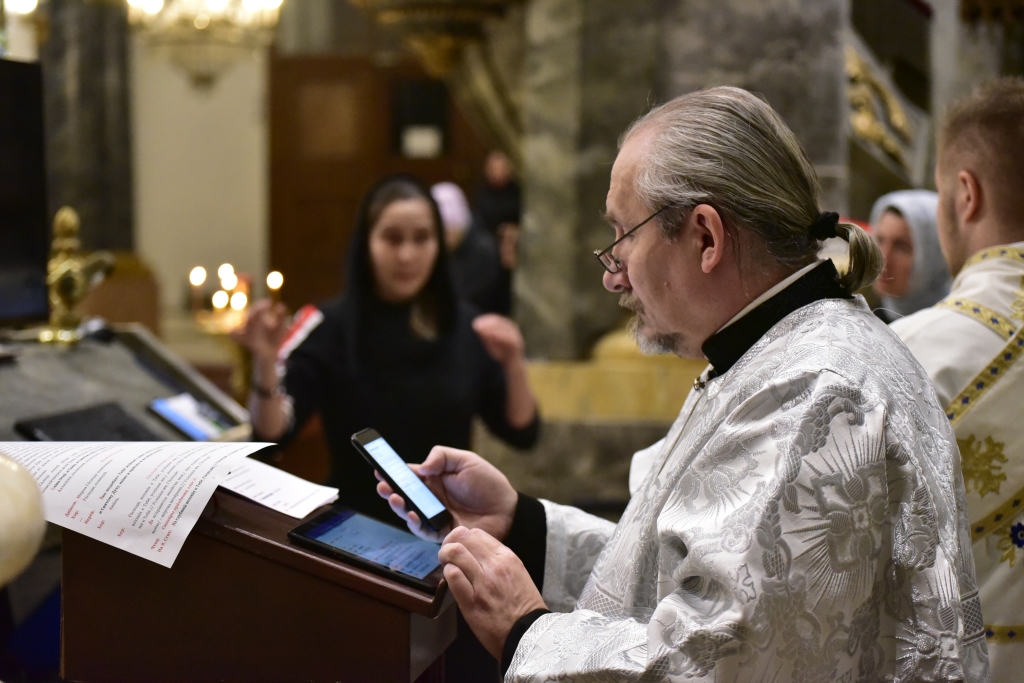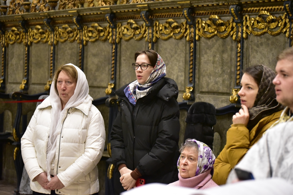 Утреннее богослужение продолжилось Божественной литургией святого Василия Великого. После малого входа алтарником Владимиром Архангельским было прочитано послание святого апостола Павла к христианам Коринфской общины, в котором рассказывалось о таинственном крещении иудеев при пророке Моисее среди облака и моря, о чудесной пище, подаваемой им в пустыне и необычном питии, источаемого от духовного камня.