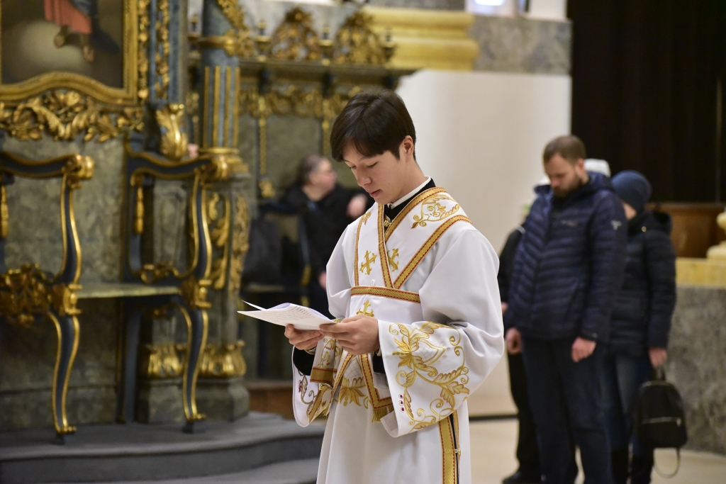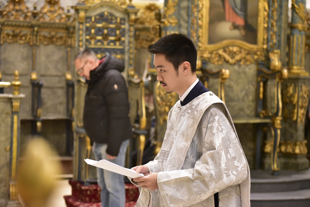 В Евангелии от Луки, возвещенном диаконом Вячеславом Ли, повествовалось о благовестии святого Иоанна Предтечи и Крестителя Господня, о проповедуемом им крещении покаяния, содействующего оставлению грехов, даруемого через крещение в Иисуса Христа.