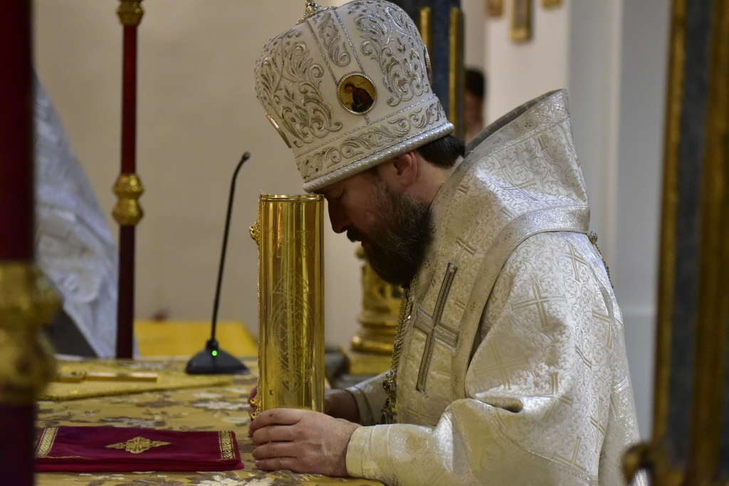 По завершении прошений Высокопреосвященнейший Иларион вознес освятительную молитву, испрашивая у Господа прийти и освятить воду для того, чтобы она получила благодать избавления, чтобы она стала источником нетления и разрешения недугов, очищением душ и телес, освящением домов и «ко всякой пользе изрядна».