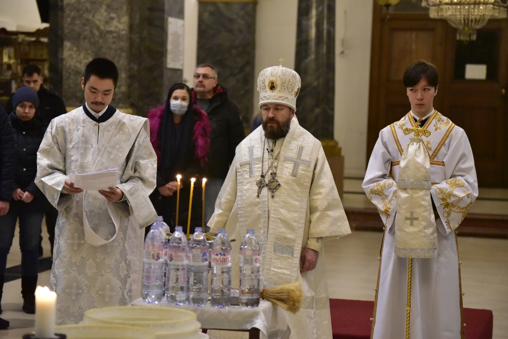 После причащения прихожан Святыми Христовыми Тайнами и заамвонной молитвы служащее духовенство во главе с Владыкой Иларионом под величественное пение тропарей торжественно вышло из царских врат и направилось к приготовленным емкостям с водой. В воспоминание священного Иорданского события, ежегодно обновляемого Святой Церковью особым чином великого освящения воды, митрополит Иларион совершил это чинопоследование.